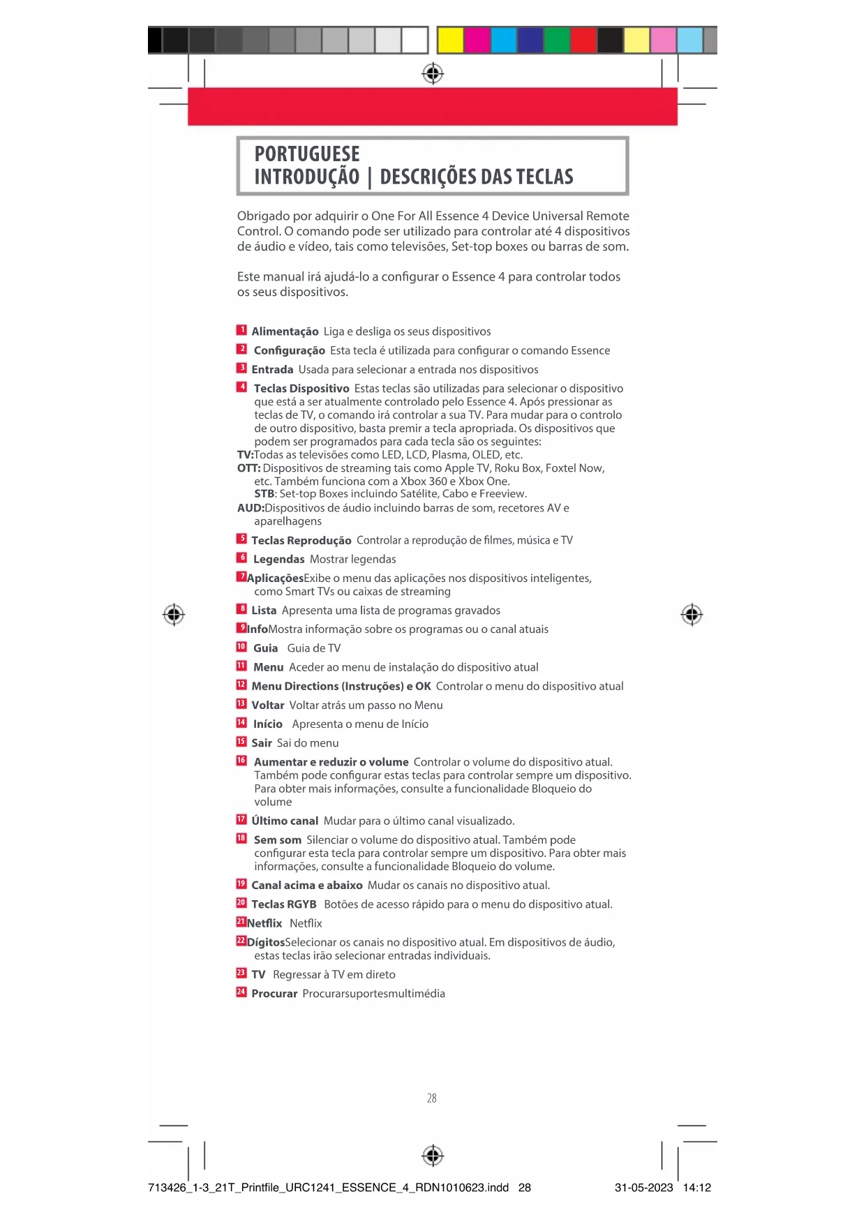 dovrebbe lampeggiare due volte e la funzione appresa dovrebbe essere eliminata. 713426_1-3_21T_Printfile_URC1241_ESSENCE_4_RDN1010623.indd 27713426_1-3_21T_Printfile_URC1241_ESSENCE_4_RDN1010623.indd 27 31-05-2023 14:1231-05-2023 14:1228 Obrigado por adquirir o One For All Essence 4 Device Universal Remote Control. O comando pode ser utilizado para controlar até 4 dispositivos de áudio e vídeo, tais como televisões, Set-top boxes ou barras de som. Este manual irá ajudá-lo a congurar o Essence 4 para controlar todos os seus dispositivos. PORTUGUESE