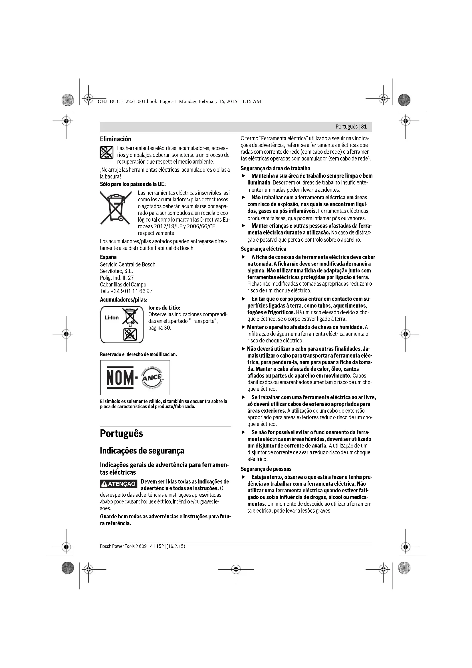 la longitud del tornillo. Observación: Preste atención a que no penetren piezas pe- queñas metálicas en la herramienta eléctrica. Clip de sujeción al cinturón (ver figura E) El clip de sujeción al cinturón 17 le permite enganchar la he- rramienta eléctrica, p. ej., a un cinturón. De esta manera le quedan libres ambas manos y tiene siempre accesible la he- rramienta eléctrica. Clip de color (ver figura F) Con el clip de color 18 puede marcar individualmente la he- rramienta eléctrica. Indicaciones para el trato óptimo del acumulador Proteja el acumulador de la humedad y del agua. Únicamente almacene el acumulador sin exceder el margen de temperatura de –20 °C a 50 °C. P.ej., no deje el acumula- dor en el coche en verano. Limpie de vez en cuando las rejillas de refrigeración del acu- mulador con un pincel suave, limpio y seco. Si después de una recarga, el tiempo de funcionamiento del acumulador fuese muy reducido, ello es señal de que éste es- tá agotado y deberá sustituirse. Observe las indicaciones referentes a la eliminación. Mantenimiento y servicio Mantenimiento y limpieza Desmonte el acumulador antes de manipular en la he- rramienta eléctrica (p.ej. en el mantenimiento, cambio de útil, etc.), así como al transportarla y guardarla. En caso contrario podría accidentarse al accionar fortuita- mente el interruptor de conexión/desconexión. Mantenga limpia la herramienta eléctrica y las rejillas de refrigeración para trabajar con eficacia y seguridad. Servicio técnico y atención al cliente El servicio técnico le asesorará en las consultas que pueda Ud. tener sobre la reparación y mantenimiento de su produc- to, así como sobre piezas de recambio. Los dibujos de despie- ce e informaciones sobre las piezas de recambio los podrá ob- tener también en internet bajo: www.bosch-pt.com Nuestro equipo de asesores técnicos le orientará gustosa- mente en cuanto a la adquisición, aplicación y ajuste de los productos y accesorios. Para cualquier consulta o pedido de piezas de repuesto es im- prescindible indicar el nº de artículo de 10 dígitos que figura en la placa de características de la herramienta eléctrica. España Robert Bosch Espana S.L.U. Departamento de ventas Herramientas Eléctricas C/Hermanos García Noblejas, 19 28037 Madrid Para efectuar su pedido online de recambios o pedir la recogi- da para la reparación de su máquina, entre en la página www.herramientasbosch.net. Tel. Asesoramiento al cliente: 902 531 553 Fax: 902 531554 Venezuela Robert Bosch S.A. Final Calle Vargas. Edf. Centro Berimer P.B. Boleita Norte Caracas 107 Tel.: (0212) 2074511 México Robert Bosch S. de R.L. de C.V. Calle Robert Bosch No. 405 C.P. 50071 Zona Industrial, Toluca - Estado de México Tel. Interior: (01) 800 6271286 Tel. D.F.: 52843062 E-Mail: arturo.fernandez@mx.bosch.com Argentina Robert Bosch Argentina S.A. Av. Córdoba 5160 C1414BAW Ciudad Autónoma de Buenos Aires Atención al Cliente Tel.: (0810) 5552020 E-Mail: herramientas.bosch@ar.bosch.com Perú Robert Bosch S.A.C. Av. Primavera 781, Urb. Chacarilla, San Borja (Edificio Aldo) Buzón Postal Lima 41 - Lima Tel.: (01) 2190332 Chile Robert Bosch S.A. Calle El Cacique 0258 Providencia – Santiago Tel.: (02) 2405 5500 Transporte Los acumuladores de iones de litio incorporados están suje- tos a los requerimientos estipulados en la legislación sobre mercancías peligrosas. Los acumuladores pueden ser trans- portados por carretera por el usuario sin más imposiciones. En el envío por terceros (p. ej., transporte aéreo o por agencia de transportes) deberán considerarse las exigencias especia- les en cuanto a su embalaje e identificación. En este caso de- berá recurrirse a los servicios de un experto en mercancías peligrosas al preparar la pieza para su envío. Únicamente envíe acumuladores si su carcasa no está daña- da. Si los contactos no van protegidos cúbralos con cinta ad- hesiva y embale el acumulador de manera que éste no se pue- da mover dentro del embalaje. Observe también las prescripciones adicionales que pudieran existir al respecto en su país. OBJ_BUCH-2221-001.book Page 30 Monday, February 16, 2015 11:15 AMPortuguês | 31 Bosch Power Tools 2 609 141 152 | (16.2.15) Eliminación Las herramientas eléctricas, acumuladores, acceso- rios y embalajes deberán someterse a un proceso de recuperación que respete el medio ambiente. ¡No arroje las herramientas eléctricas, acumuladores o pilas a la basura! Sólo para los países de la UE: Las herramientas eléctricas inservibles, así como los acumuladores/pilas defectuosos o agotados deberán acumularse por sepa- rado para ser sometidos a un reciclaje eco- lógico tal como lo marcan las Directivas Eu- ropeas 2012/19/UE y 2006/66/CE, respectivamente. Los acumuladores/pilas agotados pueden entregarse direc- tamente a su distribuidor habitual de Bosch: España Servicio Central de Bosch Servilotec, S.L. Polig. Ind. II, 27 Cabanillas del Campo Tel.: +34 9 01 11 66 97 Acumuladores/pilas: Iones de Litio: Observe las indicaciones comprendi- das en el apartado “Transporte”, página 30. Reservado el derecho de modificación. El símbolo es solamente válido, si también se encuentra sobre la placa de características del producto/fabricado. Português Indicações de segurança Indicações gerais de advertência para ferramen- tas eléctricas Devem ser lidas todas as indicações de advertência e todas as instruções. O desrespeito das advertências e instruções apresentadas abaixo pode causar choque eléctrico, incêndio e/ou graves le- sões. Guarde bem todas as advertências e instruções para futu- ra referência. O termo “Ferramenta eléctrica” utilizado a seguir nas indica- ções de advertência, refere-se a ferramentas eléctricas ope- radas com corrente de rede (com cabo de rede) e a ferramen- tas eléctricas operadas com acumulador (sem cabo de rede). Segurança da área de trabalho Mantenha a sua área de trabalho semp