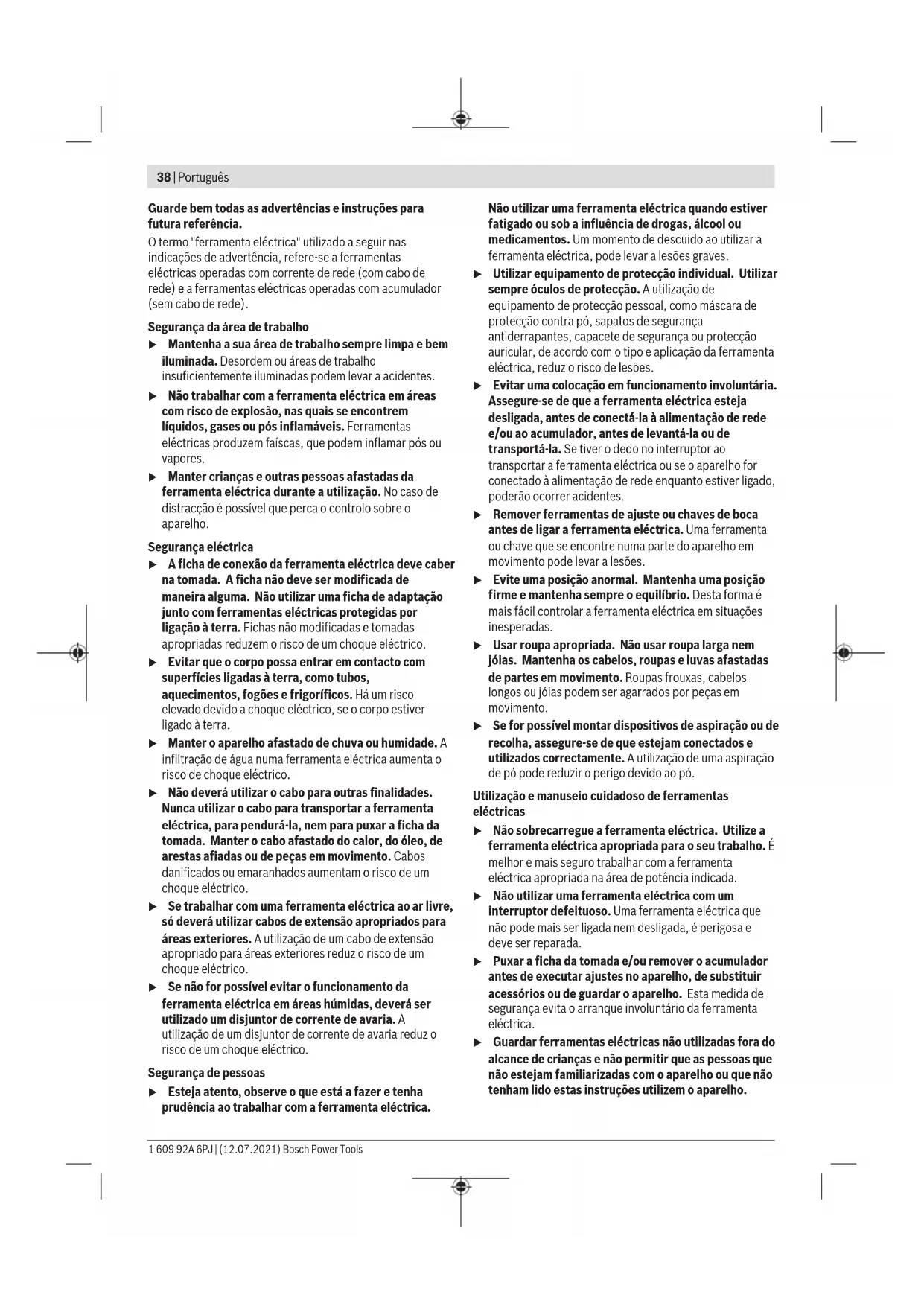 O nível de vibrações indicado nestas instruções de serviço foi medido de acordo com um processo de medição normalizado e pode ser utilizado para a comparação de aparelhos. Ele também é apropriado para uma avaliação provisória da carga de vibrações. O nível de vibrações indicado representa as aplicações principais da ferramenta elétrica. Se a ferramenta elétrica for utilizada para outras aplicações, com outras ferramentas de trabalho ou com manutenção insuficiente, é possível que o nível de vibrações seja diferente. Isso pode aumentar consideravelmente a carga de vibrações durante o período completo de trabalho. Para uma avaliação exata da carga de vibrações, também deveriam ser considerados os períodos nos quais a ferramenta está desligada ou funciona, mas não está sendo utilizado. Isto pode reduzir consideravelmente a carga de vibrações durante o período completo de trabalho. Além disso também deverão ser estipuladas medidas de segurança para proteger o operador contra o efeito de vibrações, como por exemplo: manutenção de ferramentas elétricas e acessórios, manter as mãos quentes e organização dos processos de trabalho. Montagem Carregar a bateria u Utilize apenas os carregadores listados nos dados técnicos. Só estes carregadores são apropriados para as baterias de lítio utilizadas na sua ferramenta elétrica. Nota: A bateria é fornecida parcialmente carregada. Para assegurar a completa potência da bateria, a bateria deverá ser carregada completamente no carregador antes da primeira utilização. A bateria de lítio pode ser carregada a qualquer altura, sem que a sua vida útil seja reduzida. Uma interrupção do processo de carga não danifica a bateria. O acumulador de iões de lítio está protegido contra descarga completa pelo sistema "Electronic Cell Protection (ECP)". A ferramenta elétrica é desligada através de um disjuntor de proteção, logo que o acumulador estiver descarregado. A ferramenta de trabalho não se movimenta mais. u Não continuar a premir o interruptor de ligar/desligar após o desligamento automático da ferramenta elétrica. A bateria pode ser danificada. Observe as indicações sobre a eliminação de forma ecológica. Retirar bateria (ver figura A) Para retirar a bateria (4) pressione as teclas de desbloqueio (5) e puxe a bateria para a retirar da ferramenta elétrica. Não empregar força. Indicador do nível de carga da bateria LED Capacidade Luz permanente 3x verde 60 – 100% Luz permanente 2x verde 30 – 60% Luz permanente 1x verde 10 – 30% Luz intermitente lenta 1x verde 0 – 10% Montar o dispositivo de proteção u A bateria deverá ser retirada antes de todos os trabalhos na ferramenta elétrica (p. ex. manutenção, troca de ferramenta etc.) e antes de transportar ou de 1 609 92A 6PJ | (12.07.2021) Bosch Power ToolsPortuguês | 43 armazenar a mesma. Há perigo de ferimentos se o interruptor de ligar/desligar for acionado involuntariamente. Nota: Se o disco abrasivo quebrar durante o funcionamento ou se os dispositivos de fixação na tampa de proteção/na ferramenta elétrica estiverem danificados, será necessário que a ferramenta elétrica seja enviada imediatamente ao serviço pós-venda, os endereços encontram-se na secção "Serviço pós-venda e aconselhamento". Tampa de proteção para lixar u Ao lixar, use sempre a tampa de proteção para lixar(7). Tampa de proteção para cortar u Para cortar com produtos abrasivos ligados utilize sempre uma tampa de proteção especial para o corte (10). u Ao cortar em pedra assegure uma aspiração de pó suficiente. Montar tampa de proteção (ver figura B) Monte a tampa de proteção para cortar (10) na capa de proteção para lixar (7), até engatar de forma fixa. Ajustar tampa de proteção (ver figura B) Rode a tampa de proteção para a posição desejada e engate a tampa de proteção. Para tal, não é necessária nenhuma ferramenta. Montar as ferramentas de lixar u A bateria deverá ser retirada antes de todos os trabalhos na ferramenta elétrica (p. ex. manutenção, troca de ferramenta etc.) e antes de transportar ou de armazenar a mesma. Há perigo de ferimentos se o interruptor de ligar/desligar for acionado involuntariamente. u Não tocar nos discos abrasivos e de corte, antes que arrefeçam. Os discos tornam‑se extremamente quentes durante o trabalho. Limpe o veio de trabalho (8) e todas as peças a serem montadas. Para apertar ou soltar as ferramentas de lixar, empurre a tecla de bloqueio do veio (2) para a frente e rode simultaneamente a ferramenta de lixar, para fixar o veio de trabalho. u Só acione a tecla de bloqueio do veio com o veio de retificação parado. Caso contrário é possível que a ferramenta elétrica seja danificada. Disco abrasivo e de corte Observe as dimensões das ferramentas de lixar. O diâmetro do furo tem de ser adequado ao flange de admissão. Não utilize adaptadores nem peças redutoras. Ao utilizar discos de corte diamantados, ter em atenção se a seta do sentido de rotação e o sentido de rotação da ferramenta elétrica (ver seta do sentido de rotação na carcaça) coincidem. A ordem da montagem pode ser consultada na página de esquemas. Para soltar o disco de retificação/corte empurre a tecla de bloqueio do veio (2) para a frente e rode em simultâneo o disco de retificação/corte (12), para fixar o veio de retificação (8) (ver figura C1). Remova mediante chave de sextavado interno (13) o parafuso de aperto com anilha (11) e retire o disco de retificação/corte (12) (ver figura C2). Para fixar o disco de retificação/corte aperte o de aperto com anilha (11). Aperte o parafuso com a chave de sextavado interno (13), de forma a que a anilha do parafuso assente no disco de retificação/corte (12) (ver figura C3). Depois empurre a tecla de bloqueio do veio (2) para trás (ver figura C4). u Após montar a ferramenta abrasiva deverá controlar, antes de ligar a ferrame