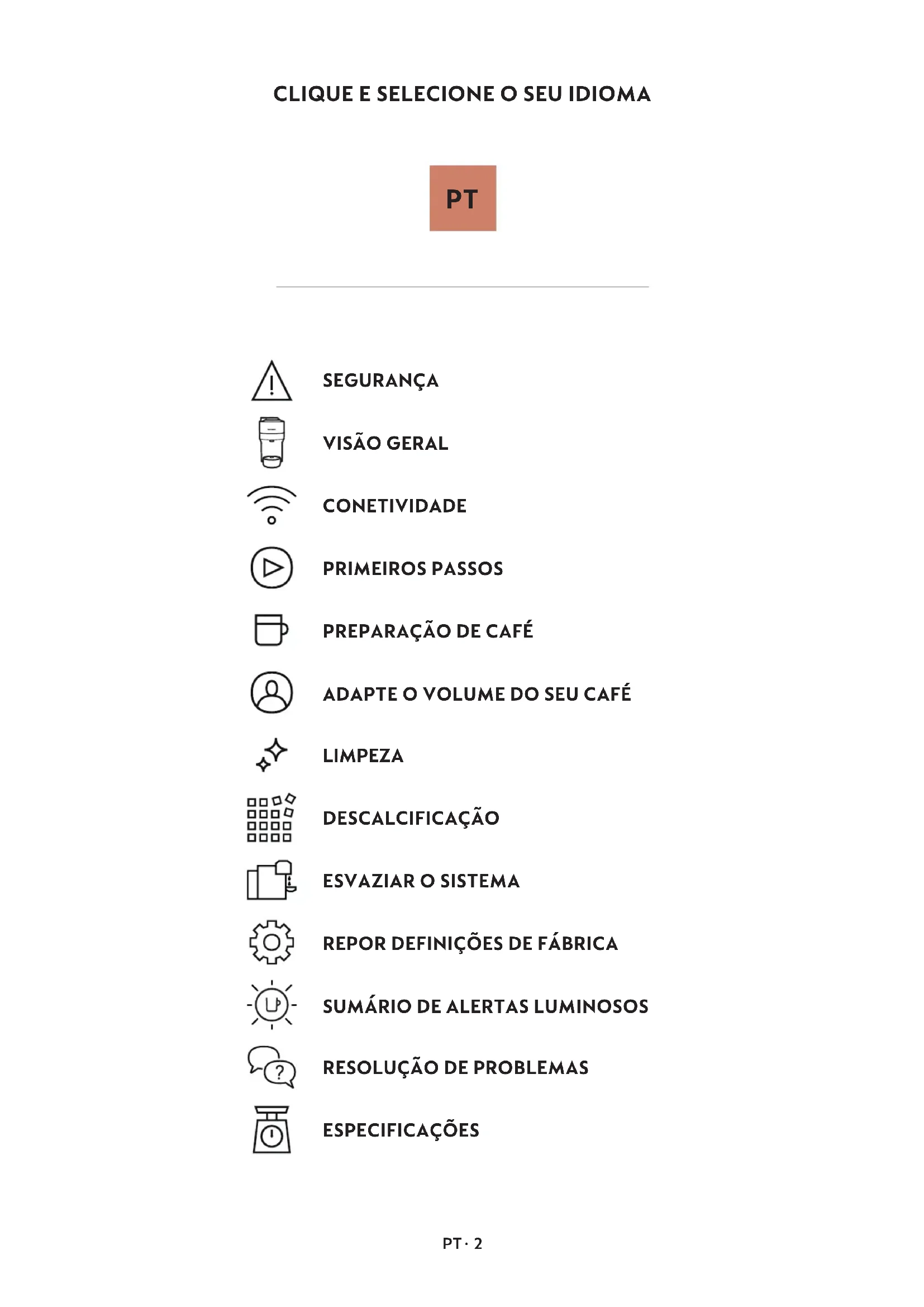 ATENÇÃO: para uma correta utilização do equipamento, não abra a máquina durante a preparação de café. Espere até o botão de café parar de piscar. Se desejar parar a preparação de café mais cedo, por favor pressione no botão de café uma vez e espere até que a máquina pare a extração antes de a abrir. NOTA: Depois de um utilizador programar um volume específico, sempre que uma cápsula do mesmo tamanho for inserida na máquina, o fluxo vai parar na quantidade programada. Se desejar repor o volume inicial, consulte o capítulo “Repor definições de fábrica“. AJUSTAR O VOLUME DOS SEUS CAFÉS – PÁGINA 2/2PT