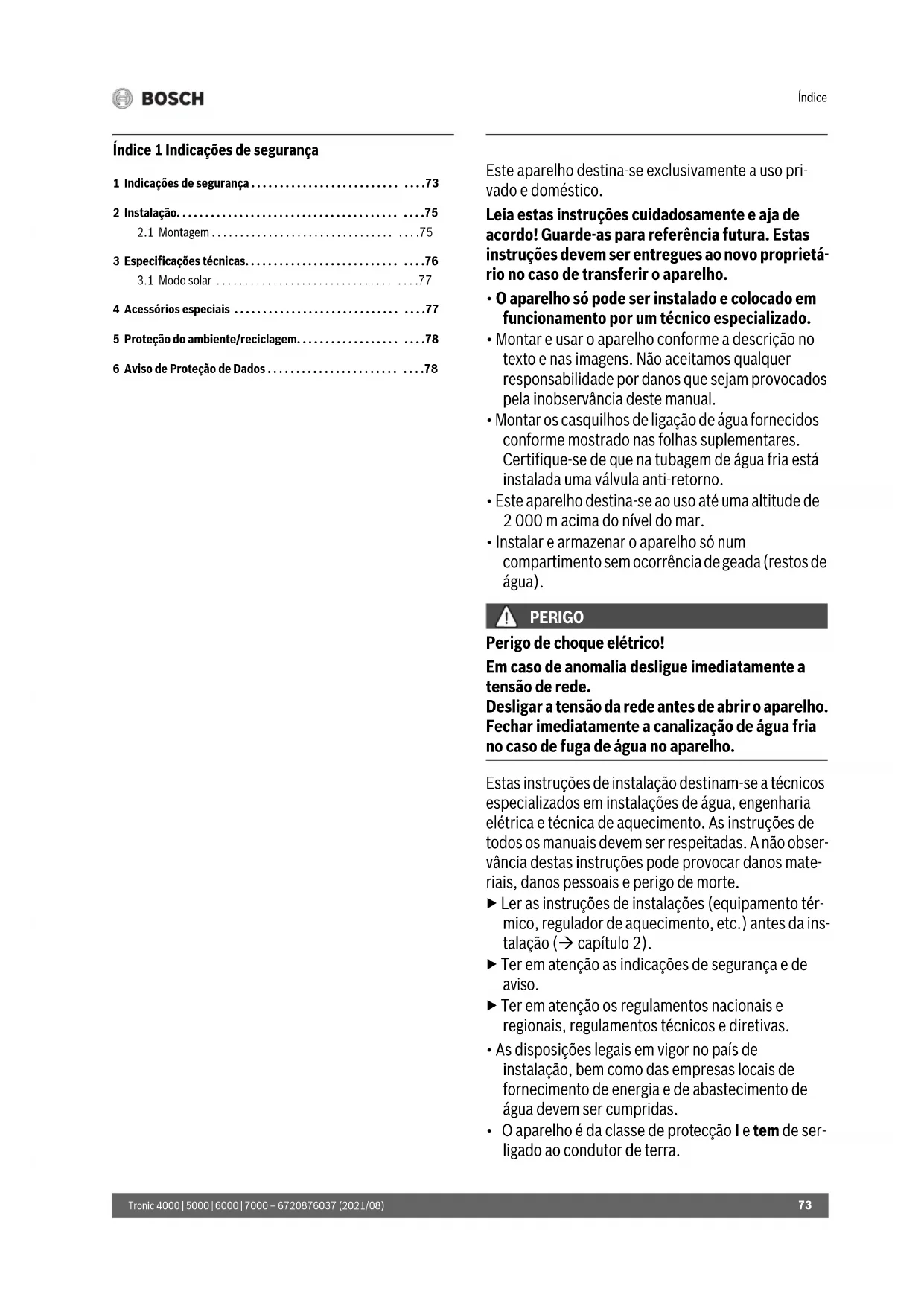 - Instalar e armazenar o aparelho só num compartimento sem ocorrência de geada (restos de água). PERIGO Perigo de choque elétrico! Em caso de anomalia desligue imediatamente a tensão de rede. Desligar a tensão da rede antes de abrir o aparelho. Fechar imediatamente a canalização de água fria no caso de fuga de água no aparelho. Estas instruções de instalação destinam-se a técnicos especializados em instalações de água, engenharia elétrica e técnica de aquecimento. As instruções de todos os manuais devem ser respeitadas. A não obser- vância destas instruções pode provocar danos mate- riais, danos pessoais e perigo de morte. ▶ Ler as instruções de instalações (equipamento tér- mico, regulador de aquecimento, etc.) antes da ins- talação ( capítulo 2). ▶ Ter em atenção as indicações de segurança e de aviso. ▶ Ter em atenção os regulamentos nacionais e regionais, regulamentos técnicos e diretivas.