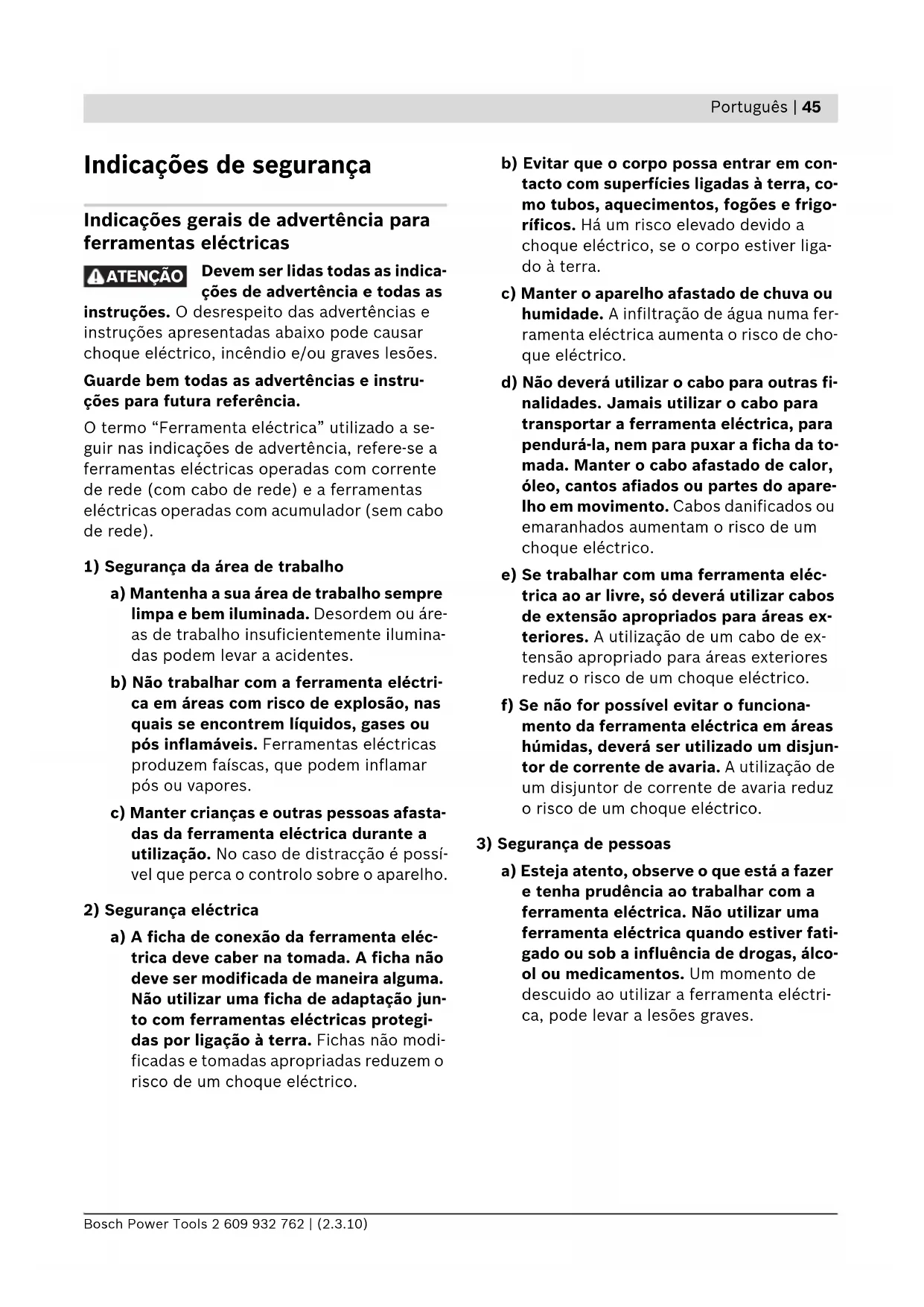 mentas eléctricas a) Não sobrecarregue o aparelho. Utilize a ferramenta eléctrica apropriada para o seu trabalho. É melhor e mais seguro tra- balhar com a ferramenta eléctrica apro- priada na área de potência indicada. b) Não utilizar uma ferramenta eléctrica com um interruptor defeituoso. Uma fer- ramenta eléctrica que não pode mais ser ligada nem desligada, é perigosa e deve ser reparada. c) Puxar a ficha da tomada e/ou remover o acumulador antes de executar ajustes no aparelho, de substituir acessórios ou de guardar o aparelho. Esta medida de segu- rança evita o arranque involuntário da fer- ramenta eléctrica. d) Guardar ferramentas eléctricas não utili- zadas fora do alcance de crianças. Não permita que pessoas que não estejam fa- miliarizadas com o aparelho ou que não tenham lido estas instruções, utilizem o aparelho. Ferramentas eléctricas são pe- rigosas se forem utilizadas por pessoas inesperientes. e) Tratar a ferramenta eléctrica com cuida- do. Controlar se as partes móveis do aparelho funcionam perfeitamente e não emperram, e se há peças quebradas ou danificadas que possam prejudicar o funcionamento da ferramenta eléctrica. Permitir que peças danificadas sejam re- paradas antes da utilização. Muitos aci- dentes têm como causa, a manutenção in- suficiente de ferramentas eléctricas. f) Manter as ferramentas de corte afiadas e limpas. Ferramentas de corte cuidado- samente tratadas e com cantos de corte afiados emperram com menos frequência e podem ser conduzidas com maior facili- dade. OBJ_BUCH-824-002.book Page 46 Tuesday, March 2, 2010 9:44 AMPortuguês | 47 Bosch Power Tools 2 609 932 762 | (2.3.10) g) Utilizar a ferramenta eléctrica, acessóri- os, ferramentas de aplicação, etc. con- forme estas instruções. Considerar as condições de trabalho e a tarefa a ser executada. A utilização de ferramentas eléctricas para outras tarefas a não ser as aplicações previstas, pode levar a situa- ções perigosas.