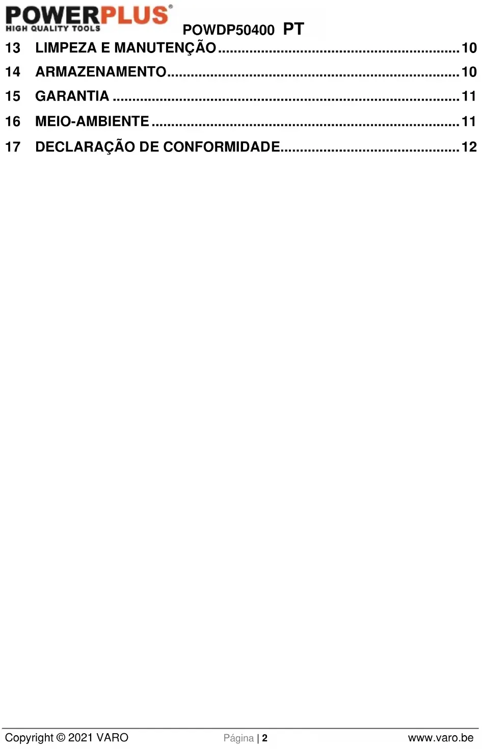 - A sua ferramenta tem de ser carregada, pelo menos, 1 vez por mês para garantir a operação ideal desta ferramenta. 16 MEIO-AMBIENTE Se a sua máquina necessitar de ser substituída após uma utilização prolongada, não a coloque no lixo doméstico. Elimine-a de uma forma ecologicamente segura. O lixo produzido pelas máquinas elétricas não pode ser eliminado com o lixo doméstico normal. Faça a reciclagem onde existam instalações adequadas. Consulte as autoridades locais ou o seu revendedor para conselhos sobre a recolha e a eliminação.POWDP50400 PT Copyright © 2021 VARO Página | 12 www.varo.be