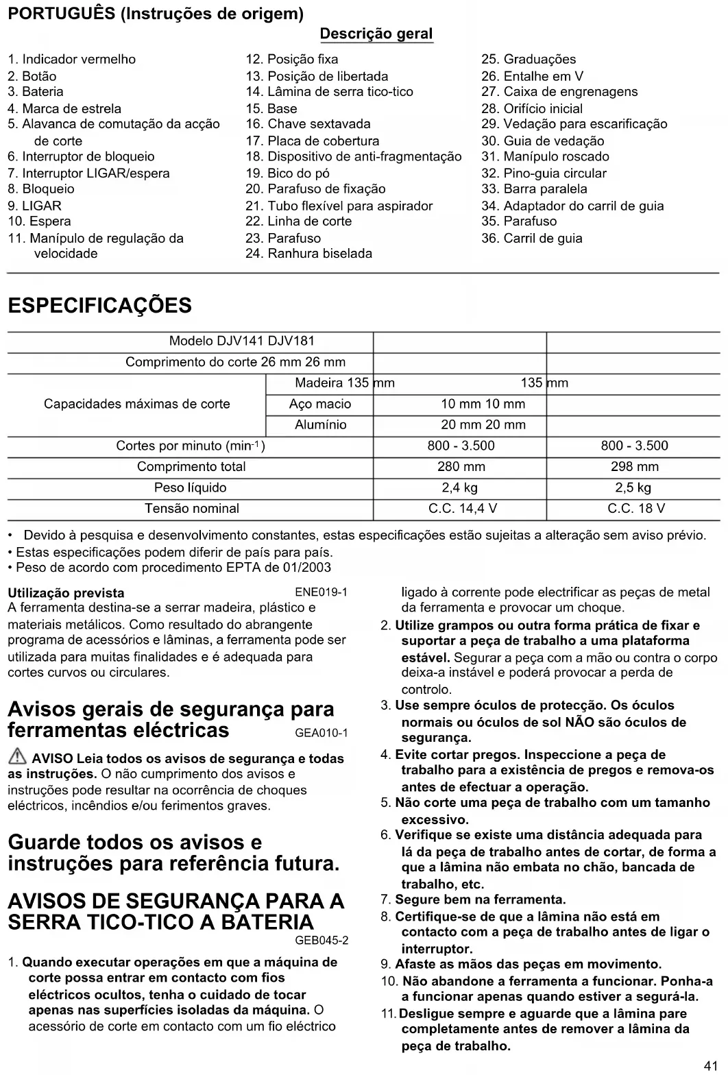 - Peso de acordo com procedimento EPTA de 01/2003 Utilização prevista ENE019-1 A ferramenta destina-se a serrar madeira, plástico e materiais metálicos. Como resultado do abrangente programa de acessórios e lâminas, a ferramenta pode ser utilizada para muitas finalidades e é adequada para cortes curvos ou circulares. Avisos gerais de segurança para ferramentas eléctricas GEA010-1 AVISO Leia todos os avisos de segurança e todas as instruções. O não cumprimento dos avisos e instruções pode resultar na ocorrência de choques eléctricos, incêndios e/ou ferimentos graves. Guarde todos os avisos e instruções para referência futura.