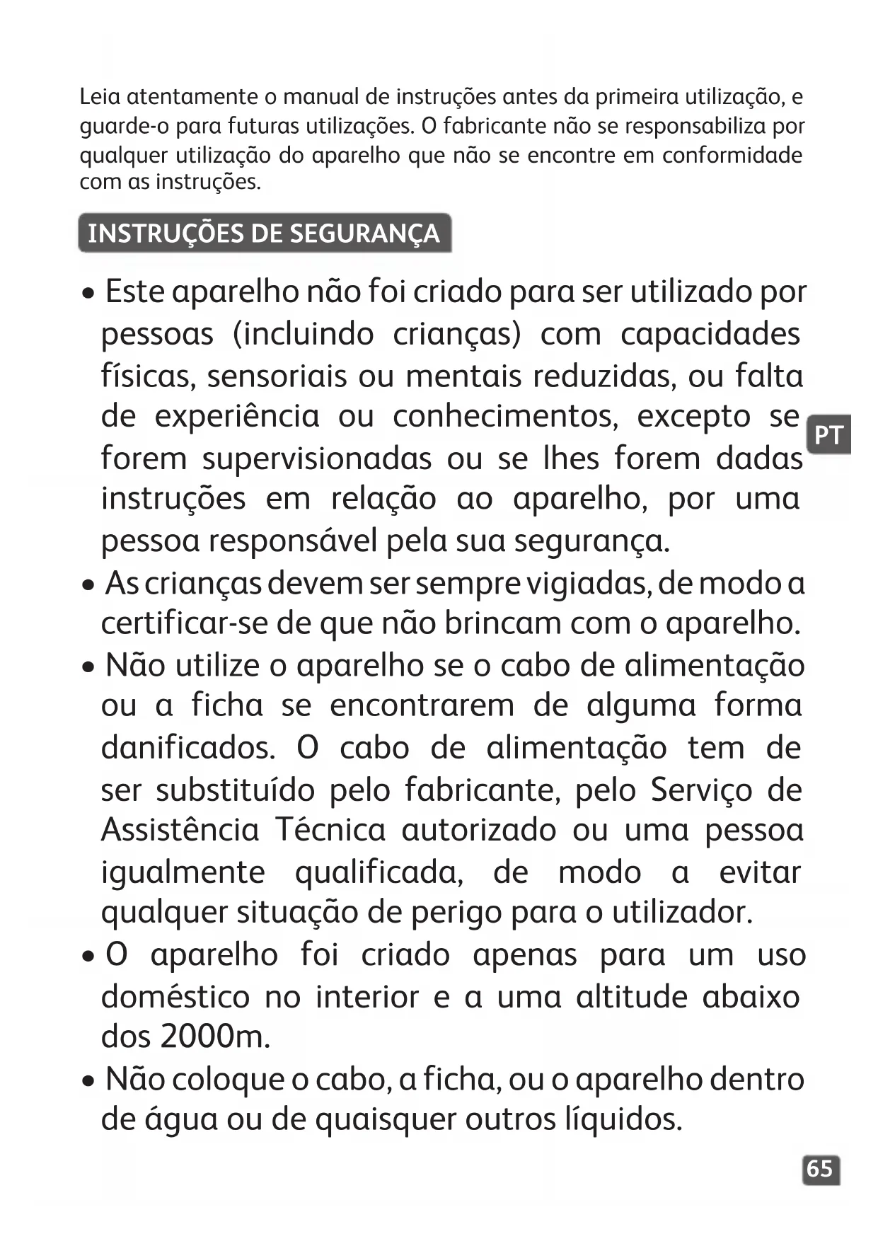 - Este aparelho não foi criado para ser utilizado por pessoas (incluindo crianças) com capacidades físicas, sensoriais ou mentais reduzidas, ou falta de experiência ou conhecimentos, excepto se forem supervisionadas ou se lhes forem dadas instruções em relação ao aparelho, por uma pessoa responsável pela sua segurança.