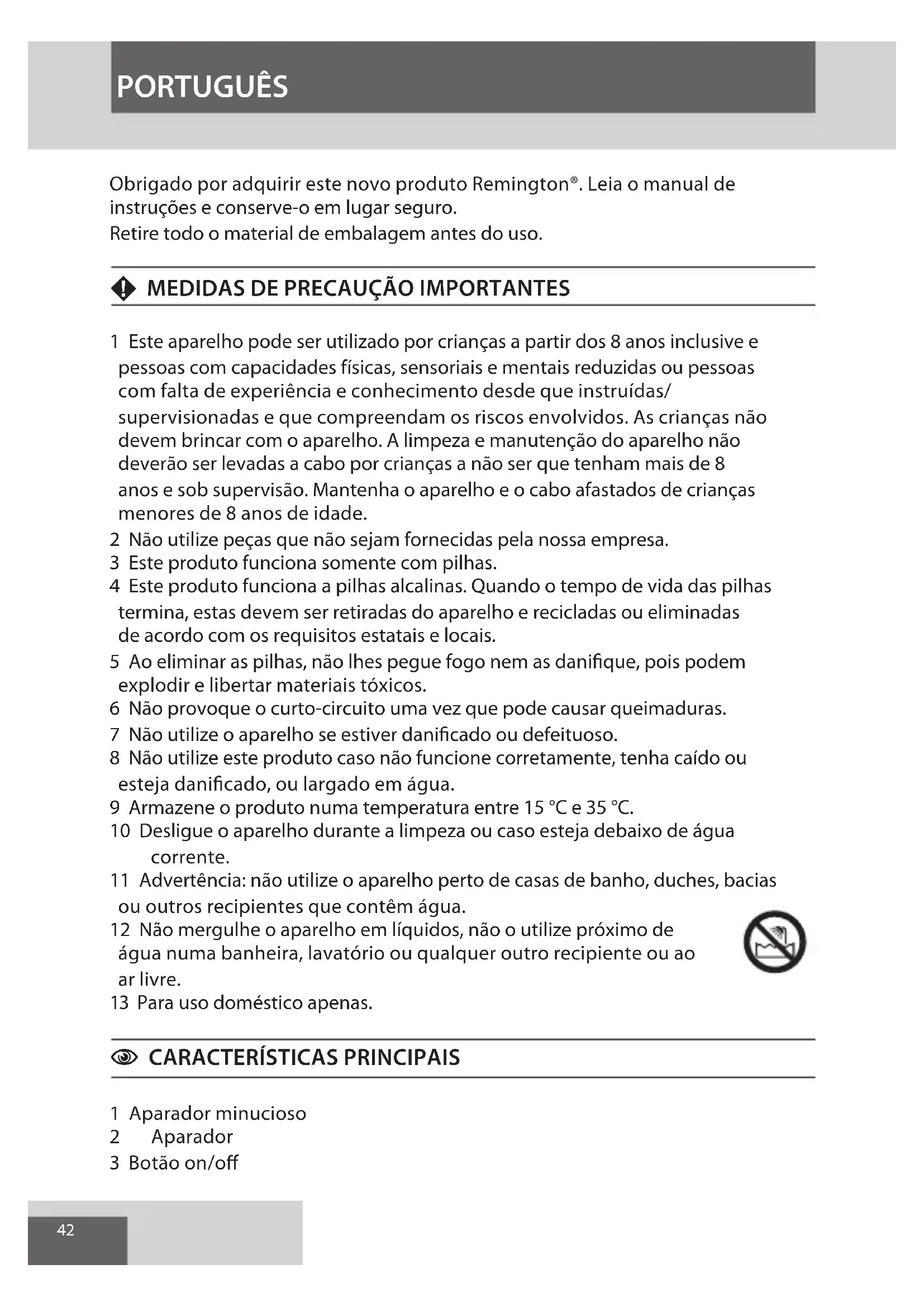 1 Este aparelho pode ser utilizado por crianças a partir dos 8 anos inclusive e pessoas com capacidades físicas, sensoriais e mentais reduzidas ou pessoas com falta de experiência e conhecimento desde que instruídas/ supervisionadas e que compreendam os riscos envolvidos. As crianças não devem brincar com o aparelho. A limpeza e manutenção do aparelho não deverão ser levadas a cabo por crianças a não ser que tenham mais de 8 anos e sob supervisão. Mantenha o aparelho e o cabo afastados de crianças menores de 8 anos de idade. 2 Não utilize peças que não sejam fornecidas pela nossa empresa. 3 Este produto funciona somente com pilhas. 4 Este produto funciona a pilhas alcalinas. Quando o tempo de vida das pilhas termina, estas devem ser retiradas do aparelho e recicladas ou eliminadas de acordo com os requisitos estatais e locais. 5 Ao eliminar as pilhas, não lhes pegue fogo nem as danique, pois podem explodir e libertar materiais tóxicos. 6 Não provoque o curto-circuito uma vez que pode causar queimaduras. 7 Não utilize o aparelho se estiver danicado ou defeituoso. 8 Não utilize este produto caso não funcione corretamente, tenha caído ou esteja danicado, ou largado em água. 9 Armazene o produto numa temperatura entre 15 °C e 35 °C. 10 Desligue o aparelho durante a limpeza ou caso esteja debaixo de água corrente. 11 Advertência: não utilize o aparelho perto de casas de banho, duches, bacias ou outros recipientes que contêm água. 12 Não mergulhe o aparelho em líquidos, não o utilize próximo de água numa banheira, lavatório ou qualquer outro recipiente ou ao ar livre. 13 Para uso doméstico apenas.