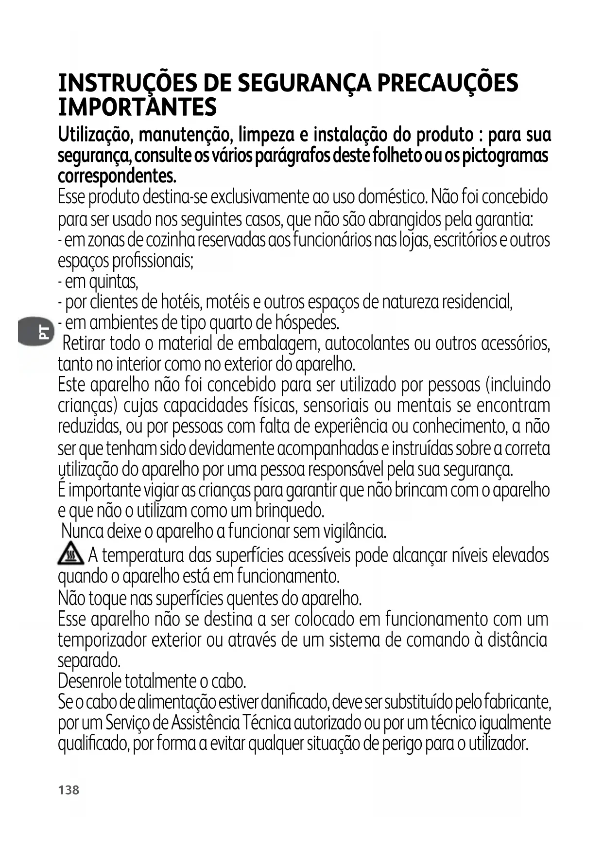 - Para una cocción óptima, coloque el lado redondeado del tomate cortado por la mitad sobre la placa inferior del grill. CERDO * Utilice la función Churrascar si el grosor es superior a 20 mm. ES138 INSTRUÇÕES DE SEGURANÇA PRECAUÇÕES IMPORTANTES Utilização, manutenção, limpeza e instalação do produto : para sua segurança, consulte os vários parágrafos deste folheto ou os pictogramas correspondentes. Esse produto destina-se exclusivamente ao uso doméstico. Não foi concebido para ser usado nos seguintes casos, que não são abrangidos pela garantia: - em zonas de cozinha reservadas aos funcionários nas lojas, escritórios e outros espaços profissionais; - em quintas, - por clientes de hotéis, motéis e outros espaços de natureza residencial, - em ambientes de tipo quarto de hóspedes. Retirar todo o material de embalagem, autocolantes ou outros acessórios, tanto no interior como no exterior do aparelho. Este aparelho não foi concebido para ser utilizado por pessoas (incluindo crianças) cujas capacidades físicas, sensoriais ou mentais se encontram reduzidas, ou por pessoas com falta de experiência ou conhecimento, a não ser que tenham sido devidamente acompanhadas e instruídas sobre a correta utilização do aparelho por uma pessoa responsável pela sua segurança. É importante vigiar as crianças para garantir que não brincam com o aparelho e que não o utilizam como um brinquedo. Nunca deixe o aparelho a funcionar sem vigilância. A temperatura das superfícies acessíveis pode alcançar níveis elevados quando o aparelho está em funcionamento. Não toque nas superfícies quentes do aparelho. Esse aparelho não se destina a ser colocado em funcionamento com um temporizador exterior ou através de um sistema de comando à distância separado. Desenrole totalmente o cabo. Se o cabo de alimentação estiver danificado, deve ser substituído pelo fabricante, por um Serviço de Assistência Técnica autorizado ou por um técnico igualmente qualificado, por forma a evitar qualquer situação de perigo para o utilizador. PT139 Se utilizar uma extensão elétrica, esta deve ter uma secção pelo menos equivalente, e ter uma tomada com ligação de terra incorporada. Tome as devidas precauções para que ninguém tropece. O aparelho apenas deve ser ligado a uma tomada com ligação à terra incorporada. Certifique-se de que a instalação elétrica é compatível com a potência e a tensão indicadas por baixo do aparelho. Este aparelho não pode ser mergulhado em líquidos. Nunca mergulhe o aparelho nem o cabo em água. O aparelho pode ser utilizado por crianças a partir dos 8 anos ou mais e por pessoas com capacidades físicas, sensoriais e mentais reduzidas ou falta de experiência e conhecimentos, desde que tenham sido devidamente acompanhadas e instruídas sobre a utilização do aparelho em segurança e que compreendam os perigos envolvidos. A limpeza e a manutenção do mesmo por parte do utilizador não devem ser realizadas por crianças, a não ser que tenham mais de 8 anos e sejam supervisionadas. Mantenha o aparelho e o cabo de alimentação fora do alcance das crianças com menos de 8 anos. ATENÇÃO : Não aqueça nem preaqueça o grelhador sem as duas placas colocadas no interior. O que pode fazer