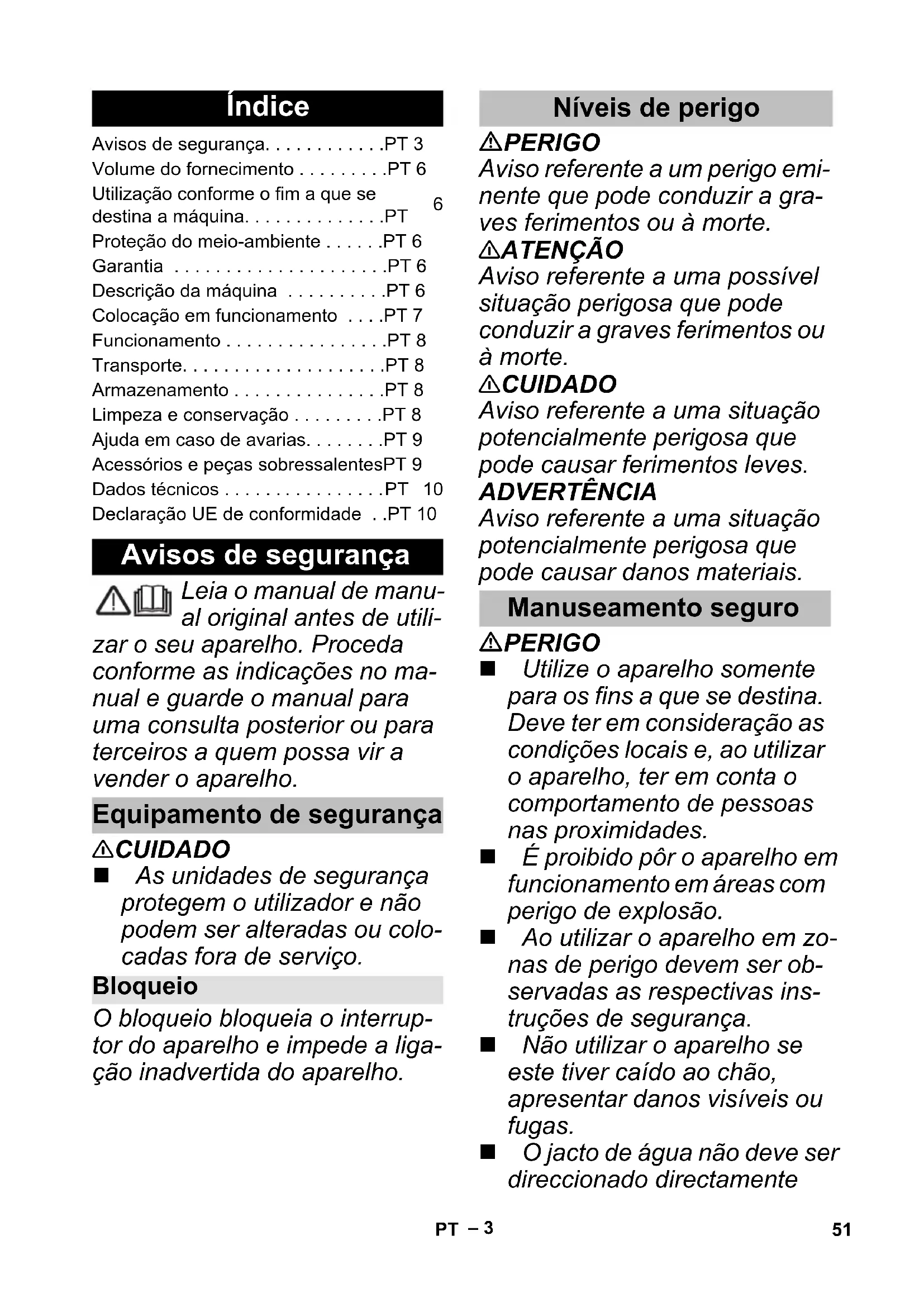Peso (sin batería) 0,16 kg Declaración UE de conformidad Producto: Limpiador a presión (con alimentación por baterías) Modelo: 1.328-000 1.328-1xx Directivas comunitarias aplicables 2014/35/UE 2014/35/UE 2014/30/UE 2014/30/UE 2011/65/UE 2011/65/UE 2000/14/CE – Normas armonizadas aplicadas EN 60335–1 EN 60335–1 – EN 60335-2-29 EN 60335–2–54 EN 60335–2–54 EN 62233: 2008 EN 62233: 2008 EN 55014–1:2017 EN 55014–1:2017 EN 55014–2: 2015 EN 55014–2: 2015 – EN 61000–3–2: 2014 – EN 61000–3–3: 2013 EN 50581 EN 50581 Procedimiento de evaluación de la conformidad aplicado 2000/14/CE: Anexo V Nivel de potencia acústica dB(A) Medido: 82 Garantizado: 84 Chairman of the Board of Management Director Regulatory Affairs & Certification 50 ES– 3 Leia o manual de manu- al original antes de utili- zar o seu aparelho. Proceda conforme as indicações no ma- nual e guarde o manual para uma consulta posterior ou para terceiros a quem possa vir a vender o aparelho. 몇 CUIDADO As unidades de segurança protegem o utilizador e não podem ser alteradas ou colo- cadas fora de serviço. O bloqueio bloqueia o interrup- tor do aparelho e impede a liga- ção inadvertida do aparelho. PERIGO Aviso referente a um perigo emi- nente que pode conduzir a gra- ves ferimentos ou à morte. 몇 ATENÇÃO Aviso referente a uma possível situação perigosa que pode conduzir a graves ferimentos ou à morte. 몇 CUIDADO Aviso referente a uma situação potencialmente perigosa que pode causar ferimentos leves. ADVERTÊNCIA Aviso referente a uma situação potencialmente perigosa que pode causar danos materiais. PERIGO Utilize o aparelho somente para os fins a que se destina. Deve ter em consideração as condições locais e, ao utilizar o aparelho, ter em conta o comportamento de pessoas nas proximidades. É proibido pôr o aparelho em funcionamento em áreas com perigo de explosão. Ao utilizar o aparelho em zo- nas de perigo devem ser ob- servadas as respectivas ins- truções de segurança. Não utilizar o aparelho se este tiver caído ao chão, apresentar danos visíveis ou fugas. O jacto de água não deve ser direccionado directamente Índice Avisos de segurança. . . . . . . . . . . .PT 3 Volume do fornecimento . . . . . . . . .PT 6 Utilização conforme o fim a que se destina a máquina. . . . . . . . . . . . . .PT