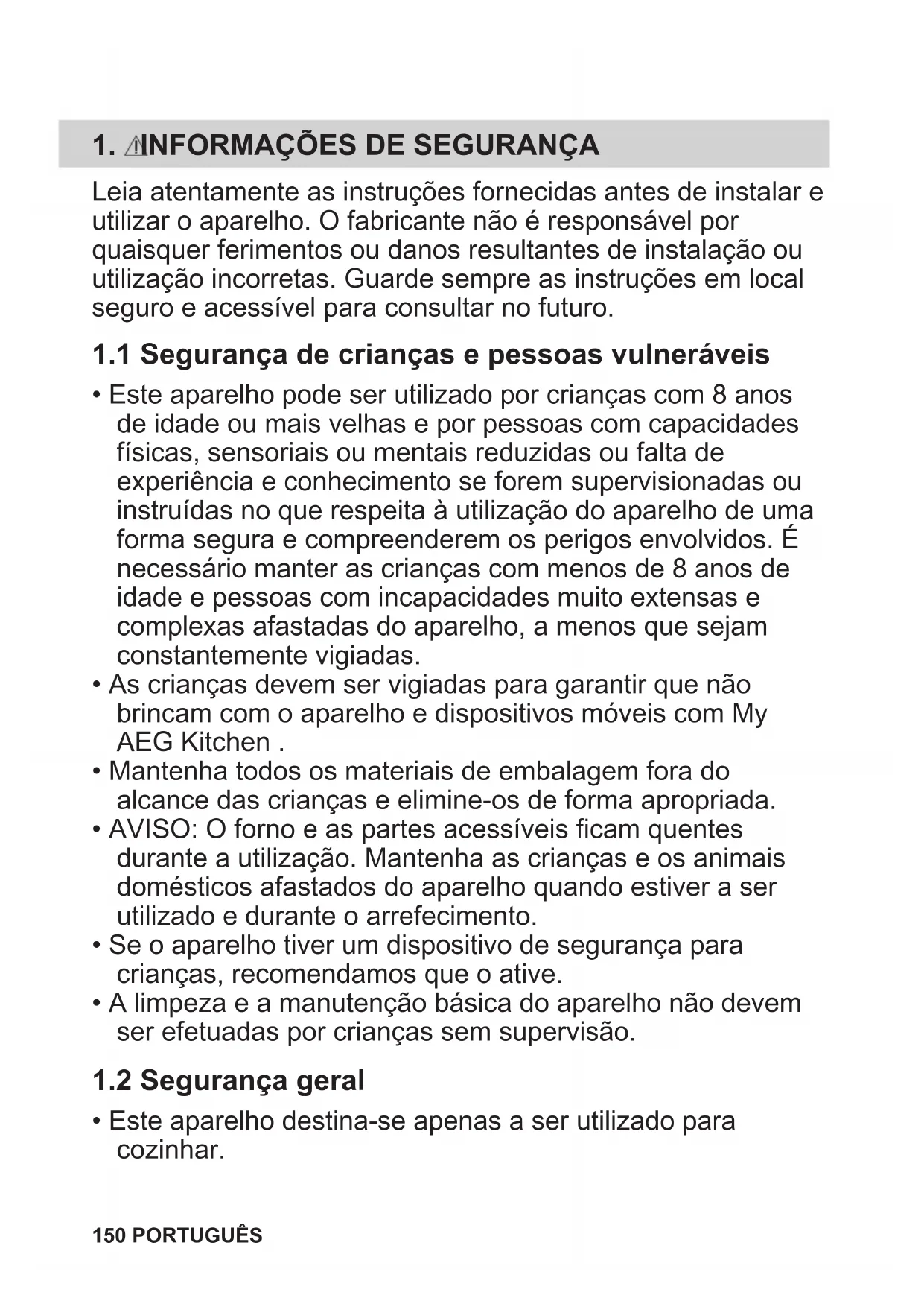 148 PORTUGUÊSMy AEG Kitchen app PORTUGUÊS 1491. INFORMAÇÕES DE SEGURANÇA Leia atentamente as instruções fornecidas antes de instalar e utilizar o aparelho. O fabricante não é responsável por quaisquer ferimentos ou danos resultantes de instalação ou utilização incorretas. Guarde sempre as instruções em local seguro e acessível para consultar no futuro.