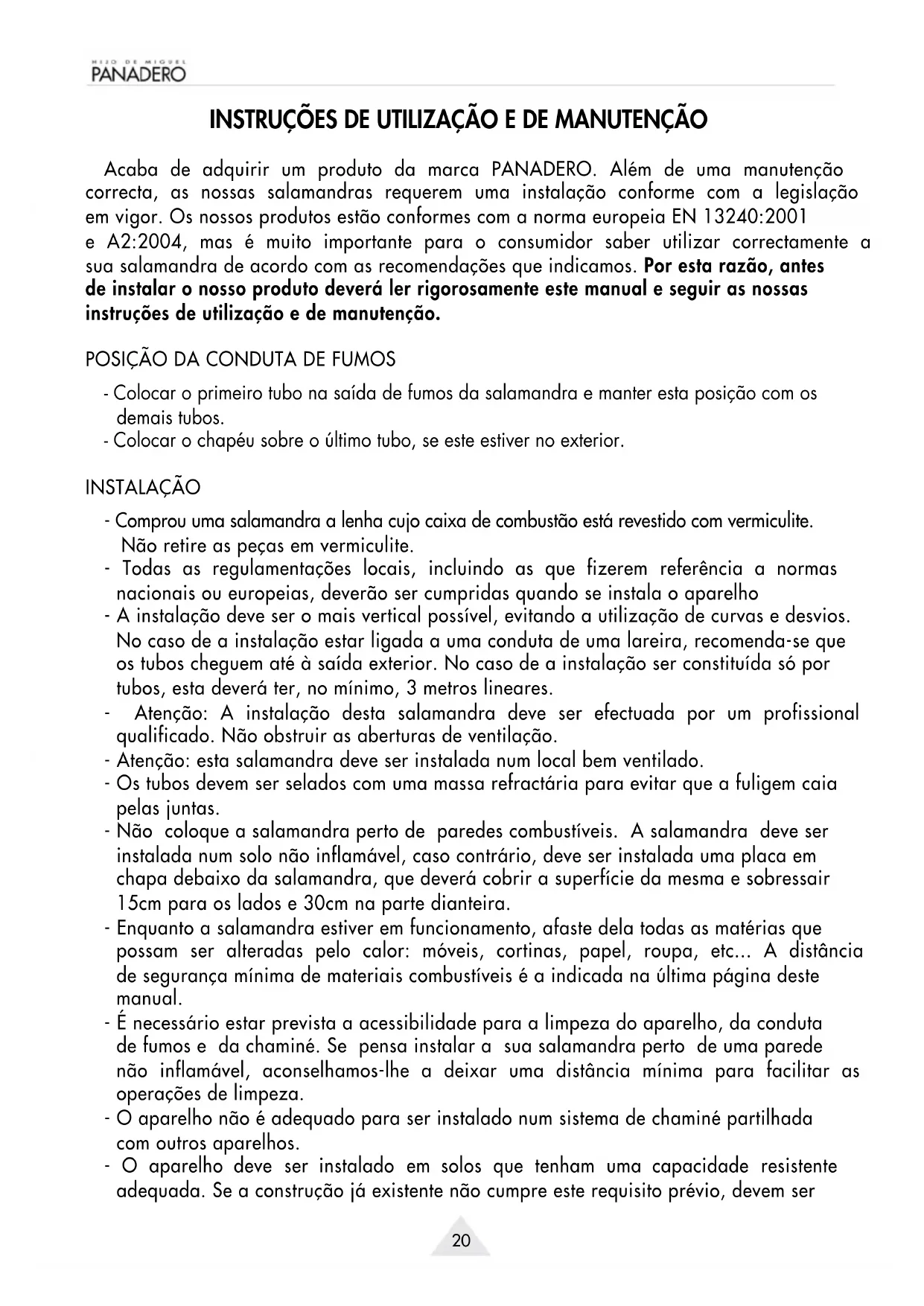 30 mg/Nm20 INSTRUÇÕES DE UTILIZAÇÃO E DE MANUTENÇÃO Acaba de adquirir um produto da marca PANADERO. Além de uma manutenção correcta, as nossas salamandras requerem uma instalação conforme com a legislação em vigor. Os nossos produtos estão conformes com a norma europeia EN 13240:2001 e A2:2004, mas é muito importante para o consumidor saber utilizar correctamente a sua salamandra de acordo com as recomendações que indicamos. Por esta razão, antes de instalar o nosso produto deverá ler rigorosamente este manual e seguir as nossas instruções de utilização e de manutenção.