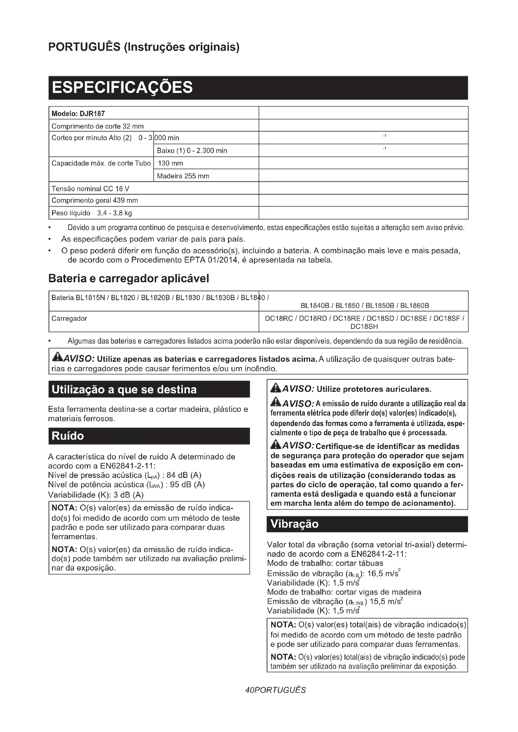 Algumasdasbateriasecarregadoreslistadosacimapoderãonãoestardisponíveis,dependendodasuaregiãoderesidência. AVISO: Utilize apenas as baterias e carregadores listados acima.Autilizaçãodequaisqueroutrasbate- riasecarregadorespodecausarferimentose/ouumincêndio. Utilização a que se destina Estaferramentadestina-seacortarmadeira,plásticoe materiais ferrosos. Ruído AcaracterísticadonívelderuídoAdeterminadode acordocomaEN62841-2-11: Níveldepressãoacústica(L