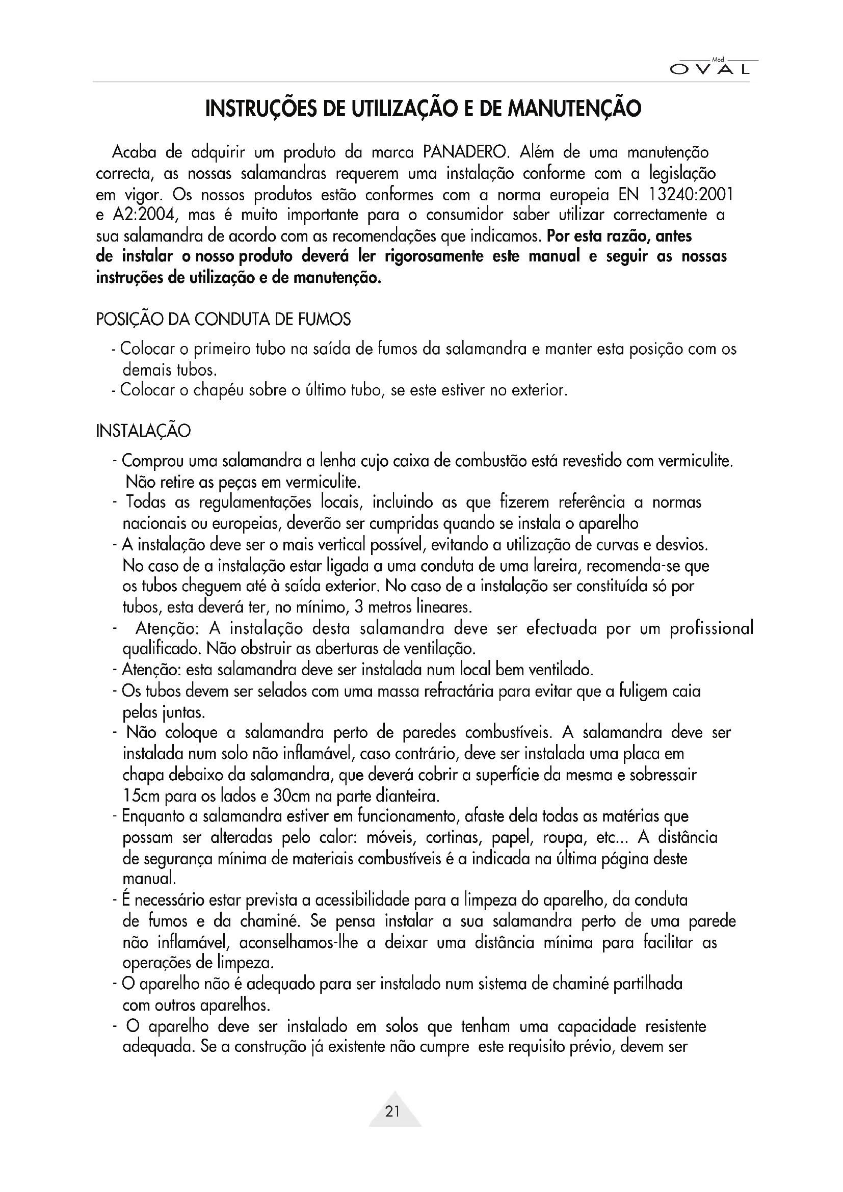 272 °C 80 cm21 INSTRUÇÕES DE UTILIZAÇÃO E DE MANUTENÇÃO Acaba de adquirir um produto da marca PANADERO. Além de uma manutenção correcta, as nossas salamandras requerem uma instalação conforme com a legislação em vigor. Os nossos produtos estão conformes com a norma europeia EN 13240:2001 e A2:2004, mas é muito importante para o consumidor saber utilizar correctamente a sua salamandra de acordo com as recomendações que indicamos. Por esta razão, antes de instalar o nosso produto deverá ler rigorosamente este manual e seguir as nossas instruções de utilização e de manutenção.