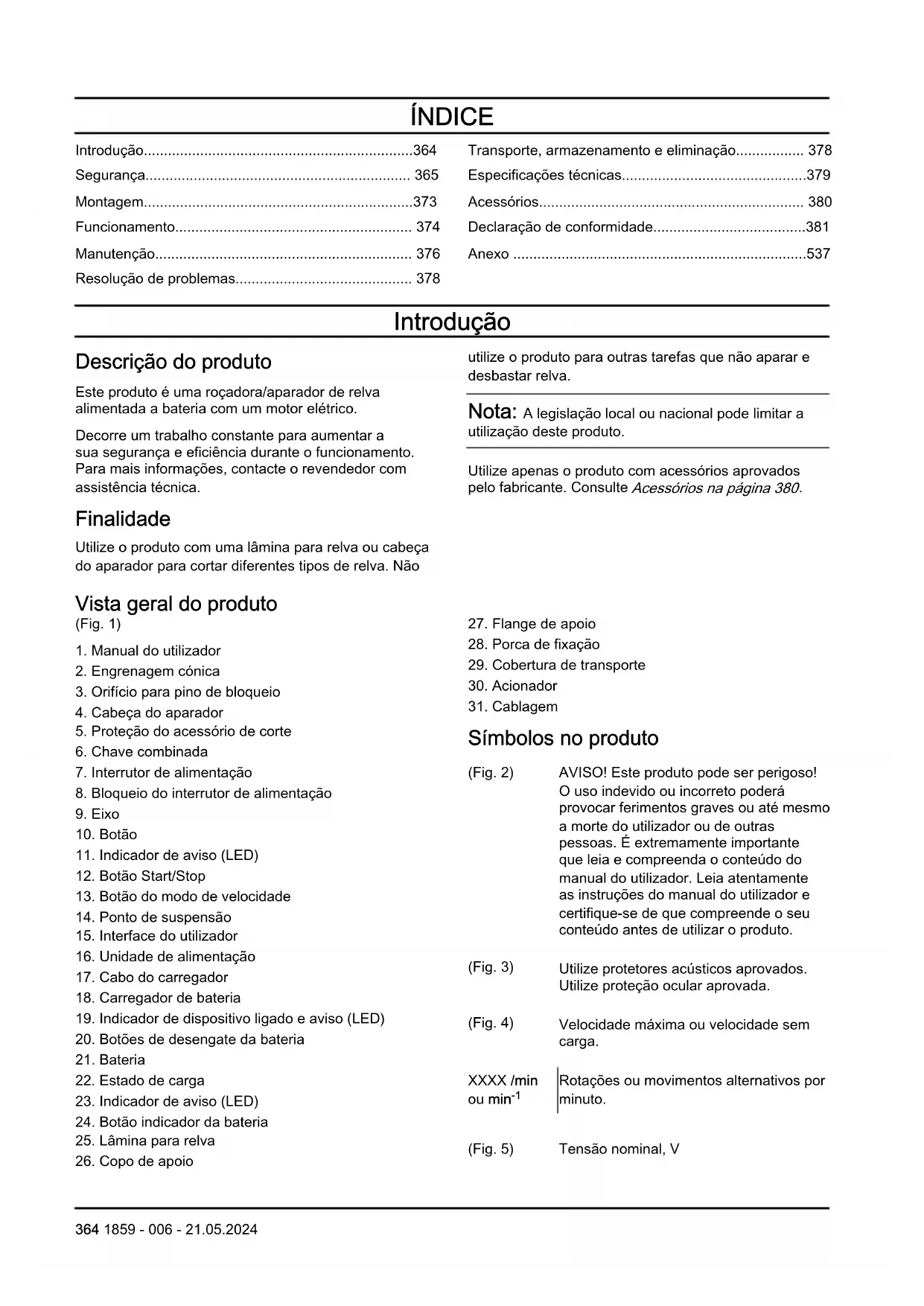 - o produto não tiver sido reparado por um centro de assistência autorizado ou por uma autoridade aprovada. Segurança Definições de segurança Os avisos, as precauções e as notas são utilizados para indicar partes especialmente importantes do manual. ATENÇÃO: Utilizado no caso de existir risco de ferimento ou morte para o utilizador ou transeuntes, se não forem respeitadas as instruções do manual. CUIDADO: Utilizado se existir risco de danos para o produto, para outros materiais ou para a área adjacente, se não forem respeitadas as instruções do manual. Nota: Utilizado para disponibilizar informações adicionais necessárias numa determinada situação. Avisos gerais de segurança da máquina ATENÇÃO: Leia todos os avisos de segurança, as instruções, as ilustrações e as especificações fornecidos com esta 1859 - 006 - 21.05.2024 365máquina. O incumprimento das instruções indicadas abaixo poderá resultar em choques elétricos, incêndios e/ou ferimentos graves.