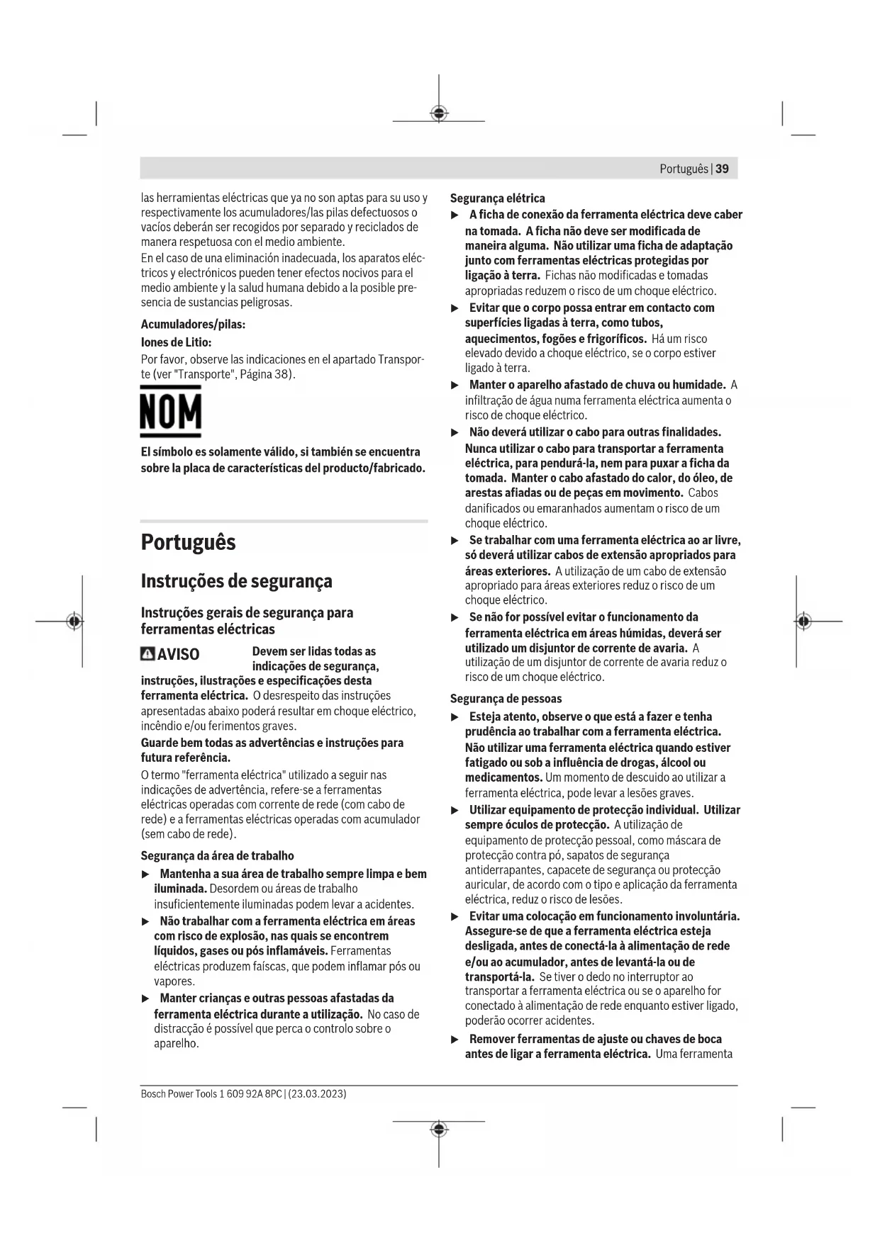 O nível de vibrações indicado nestas instruções e o valor de emissões sonoras foram medidos de acordo com um processo de medição normalizado e podem ser utilizados para a comparação de ferramentas elétricas. Também são adequados para uma avaliação provisória das emissões sonoras e de vibrações. O nível de vibrações indicado e o valor de emissões sonoras representam as aplicações principais da ferramenta elétrica. Se a ferramenta elétrica for utilizada para outras aplicações, com outras ferramentas de trabalho ou com manutenção insuficiente, é possível que o nível de vibrações e de emissões sonoras seja diferente. Isto pode aumentar sensivelmente a emissão sonora e de vibrações para o período completo de trabalho. Para uma estimação exata da emissão sonora e de vibrações, também deveriam ser considerados os períodos nos quais o aparelho está desligado ou funciona, mas não está sendo utilizado. Isto pode reduzir a emissão sonora e de vibrações durante o completo período de trabalho. Além disso também deverão ser estipuladas medidas de segurança para proteger o operador contra o efeito de vibrações, como por exemplo: manutenção de ferramentas elétricas e acessórios, manter as mãos quentes e organização dos processos de trabalho. Bateria Bosch vende ferramentas elétricas sem fio também sem bateria. Pode consultar na embalagem se está incluída uma bateria no volume de fornecimento da sua ferramenta elétrica. Carregar a bateria u Utilize apenas os carregadores listados nos dados técnicos. Só estes carregadores são apropriados para os baterias de lítio utilizadas para a sua ferramenta elétrica. Bosch Power Tools 1 609 92A 8PC | (23.03.2023)44 | Português Nota: devido a normas de transporte internacionais, as baterias de lítio são fornecidas parcialmente carregadas. Para assegurar a completa potência da bateria, a bateria deverá ser carregada completamente antes da primeira utilização. Colocar a bateria Insira a bateria carregada no respetivo encaixe, até que esta esteja engatada. Retirar a bateria Para retirar a bateria, pressione a respetiva tecla de desbloqueio e puxe a bateria para fora. Não empregue força. Indicador do nível de carga da bateria LED Capacidade Luz permanente 3×verde 75–100% Luz permanente 2× verde 40–75% Luz permanente 1×verde 15–40% Pisca lento 1×verde 0–15% Os 3 LEDs do indicador do nível de carga piscam rapidamente quando a temperatura da bateria está fora da faixa de temperatura de serviço e/ou a proteção contra sobrecarga foi ativada. Indicações sobre o manuseio ideal da bateria Proteger a bateria contra humidade e água. Armazene a bateria apenas na faixa de temperatura de −20°C a 50°C. Por exemplo, não deixe a bateria dentro do automóvel no verão. Um tempo de funcionamento reduzido após o carregamento indica que a bateria está gasta e que deve ser substituída. Observe as indicações sobre a eliminação de forma ecológica. Montagem u Só utilizar discos de serra com uma máxima velocidade admissível superior à velocidade da marcha em vazio da ferramenta elétrica. Aspiração de pó/de aparas (verfiguraB) Pós de materiais como por exemplo, tintas que contém chumbo, alguns tipos de madeira, minerais e metais, podem ser nocivos à saúde. O contacto ou a inalação dos pós pode provocar reações alérgicas e/ou doenças nas vias respiratórias do utilizador ou das pessoas que se encontrem por perto. Certos pós, como por exemplo pó de carvalho e faia são considerados como sendo cancerígenos, especialmente quando juntos com substâncias para o tratamento de madeiras (cromato, produtos de proteção da madeira). Material que contém asbesto só deve ser processado por pessoal especializado. – Se possível deverá usar um dispositivo de aspiração de pó apropriado para o material. – Assegurar uma boa ventilação do local de trabalho. – É recomendável usar uma máscara de proteção respiratória com filtro da classe P2. Observe as diretivas para os materiais a serem processados, vigentes no seu país. u Evite a acumulação de pó no local de trabalho. Pós podem entrar levemente em ignição. Nota: Ao serrar, utilize sempre o tubo de desvio(21), para não ser atingido pelas aparas projetadas. O tubo de desvio (21) pode ser usado com ou sem a aspiração de pó/de aparas conectada. Rode o tubo de desvio conforma a aplicação de forma a que não leve com as aparas e insira-o bem na remoção de aparas (16). Aspiração externa (ver figura B) Insira uma mangueira de aspiração (20) (acessório) na remoção de aparas (16). Ligue a mangueira de aspiração (20) a um aspirador (acessório). Encontra um resumo da ligação aos diferentes aspiradores no final deste manual. O aspirador de pó deve ser apropriado para o material a ser trabalhado. Utilize um aspirador especial para aspirar pó que seja extremamente nocivo à saúde, cancerígeno ou seco. Introduzir/substituir o disco da serra circular u A bateria deverá ser retirada antes de todos os trabalhos na ferramenta elétrica (p. ex. manutenção, troca de ferramenta etc.) e antes de transportar ou de armazenar a mesma. Há perigo de ferimentos se o interruptor de ligar/desligar for acionado involuntariamente. u Para a montagem do disco de serra é necessário usar luvas de proteção. Há perigo de lesões no caso de um contacto com o disco de serra. u Nunca utilizar discos abrasivos como ferramentas de trabalho. u Só utilizar discos de serra que correspondam aos dados caraterísticos indicados nesta instrução de serviço e na ferramenta elétrica e que sejam controlados conforme EN847‑1 e respetivamente marcados. Selecionar disco de serra Encontra um resumo dois discos de serra recomendados no final destas instruções. Desmontar disco de serra (ver figura C) Coloque a ferramenta elétrica para a troca de ferramenta sobre o topo da carcaça do motor. – Prima e mantenha premi