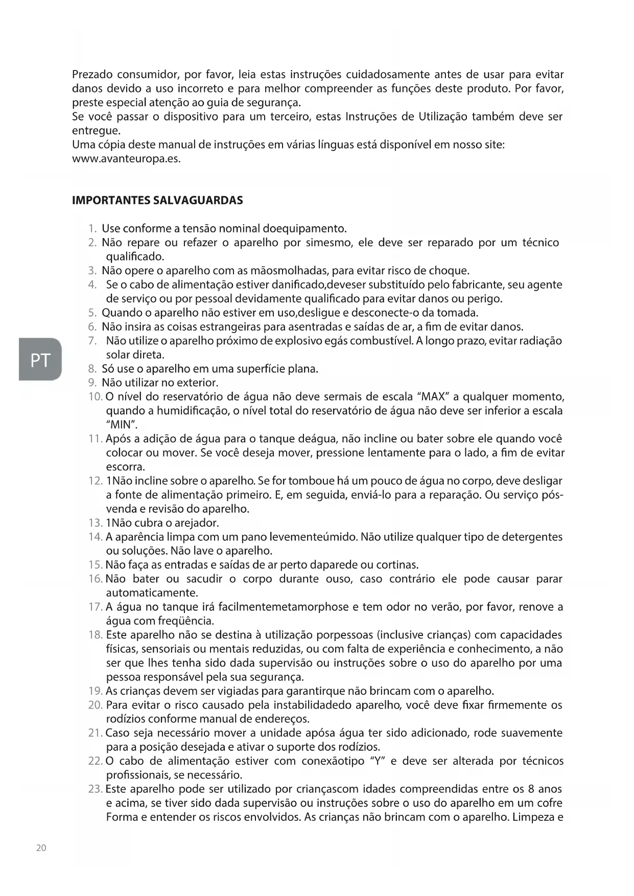 Prezado consumidor, por favor, leia estas instruções cuidadosamente antes de usar para evitar danos devido a uso incorreto e para melhor compreender as funções deste produto. Por favor, preste especial atenção ao guia de segurança. Se você passar o dispositivo para um terceiro, estas Instruções de Utilização também deve ser entregue. Uma cópia deste manual de instruções em várias línguas está disponível em nosso site: www.avanteuropa.es. IMPORTANTES SALVAGUARDAS