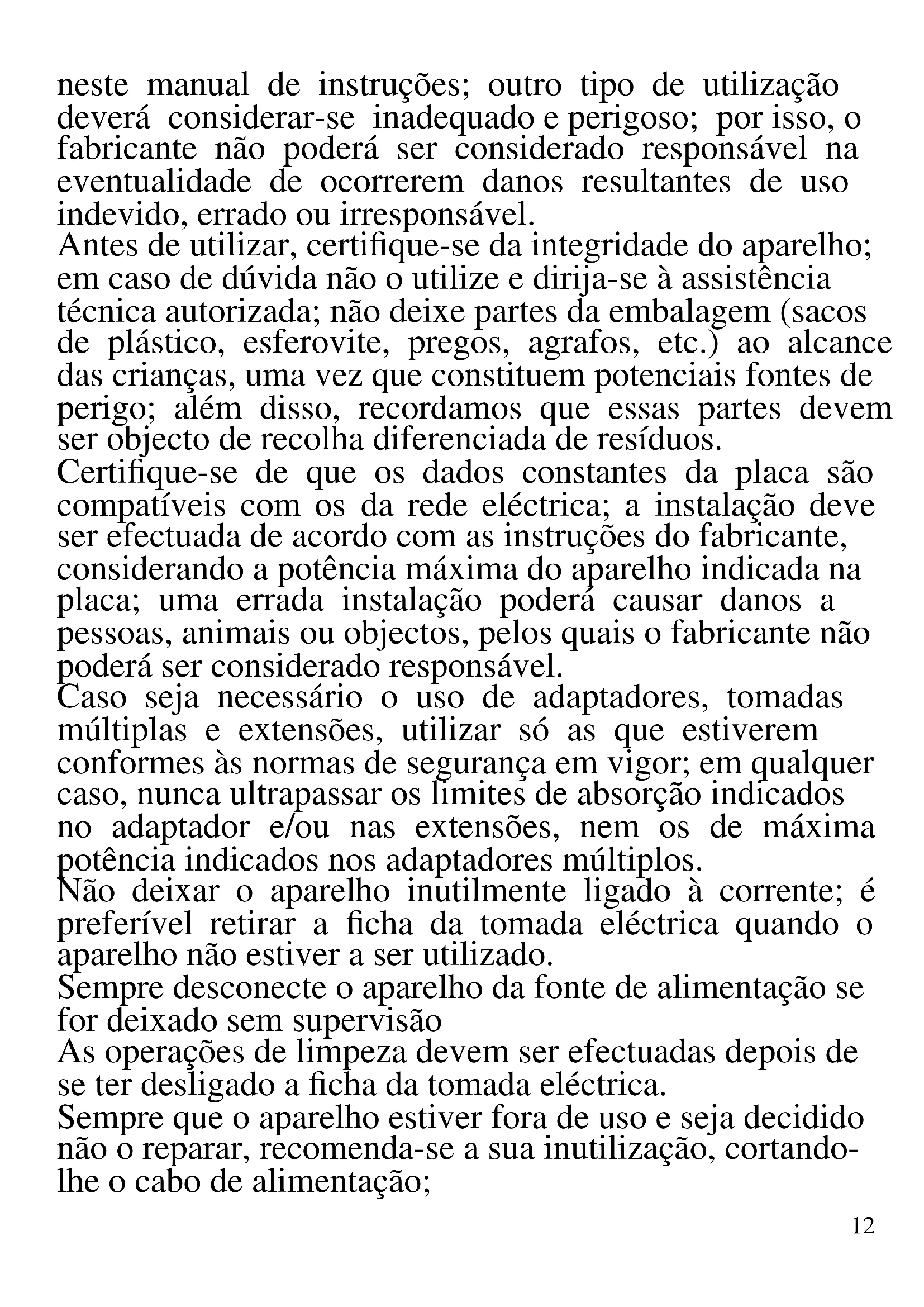 ATENÇÃO: não use o secador dentro da banheira, debaixo do chuveiro ou dentro da cabina do duche. Se o secador cair à água, não o apanhe e desligue imediatamente a ficha eléctrica. Evite salpicos de água. No caso de se verificar algum destes problemas, antes de prosseguir com a utilização, leve o secador a um centro de assistência autorizado; o mesmo deverá ser inspeccionado apenas por pessoal qualificado. Não use o secador próximo de lavatórios ou recipientes com água, e arrume-o numa prateleira estável e segura, de modo que não caia ao chão ou dentro de recipientes com líquidos. Quando estiver quente, pouse o secador apenas sobre superfícies resistentes ao calor e longe de roupas, papel ou líquidos inflamáveis. Não obstrua as aberturas de ventilação, uma vez que isso15 poderia danificar seriamente o motor. Tenha cuidado para não deixar o cabelo aproximar-se demasiado dessas aberturas, porque o mesmo poderá ser sugado para o interior do secador e queimado. Nunca deixe o aparelho a funcionar sem vigilância. Em caso de sobreaquecimento, que pode ser devido a utilização excessiva ou obstrução acidental das aberturas de ventilação, o termostato de segurança bloqueará o funcionamento do motor. Espere pelo completo arrefecimento do motor até o ligar novamente. Quando o secador está a funcionar, o bico concentrador de ar fica quente. Não lhe toque, porque isso poderia causar sérias queimaduras. Não utilize o aparelho como aquecedor. Não enrole o cabo de alimentação no aparelho quando estiver a ser usado Depois de cada utilização, espere que o aparelho arrefeça antes de o arrumar. Se utilizar o secador numa casa de banho terá de o desligar da tomada eléctrica logo depois do uso, uma vez que a proximidade da água poderá ser perigosa mesmo quando o secador está parado. De modo a garantir uma melhor protecção, é aconselhável colocar um diferencial de corrente eléctrica com um máximo de 30mA na instalação eléctrica da casa de banho. Contacte um electricista habilitado para mais informação.