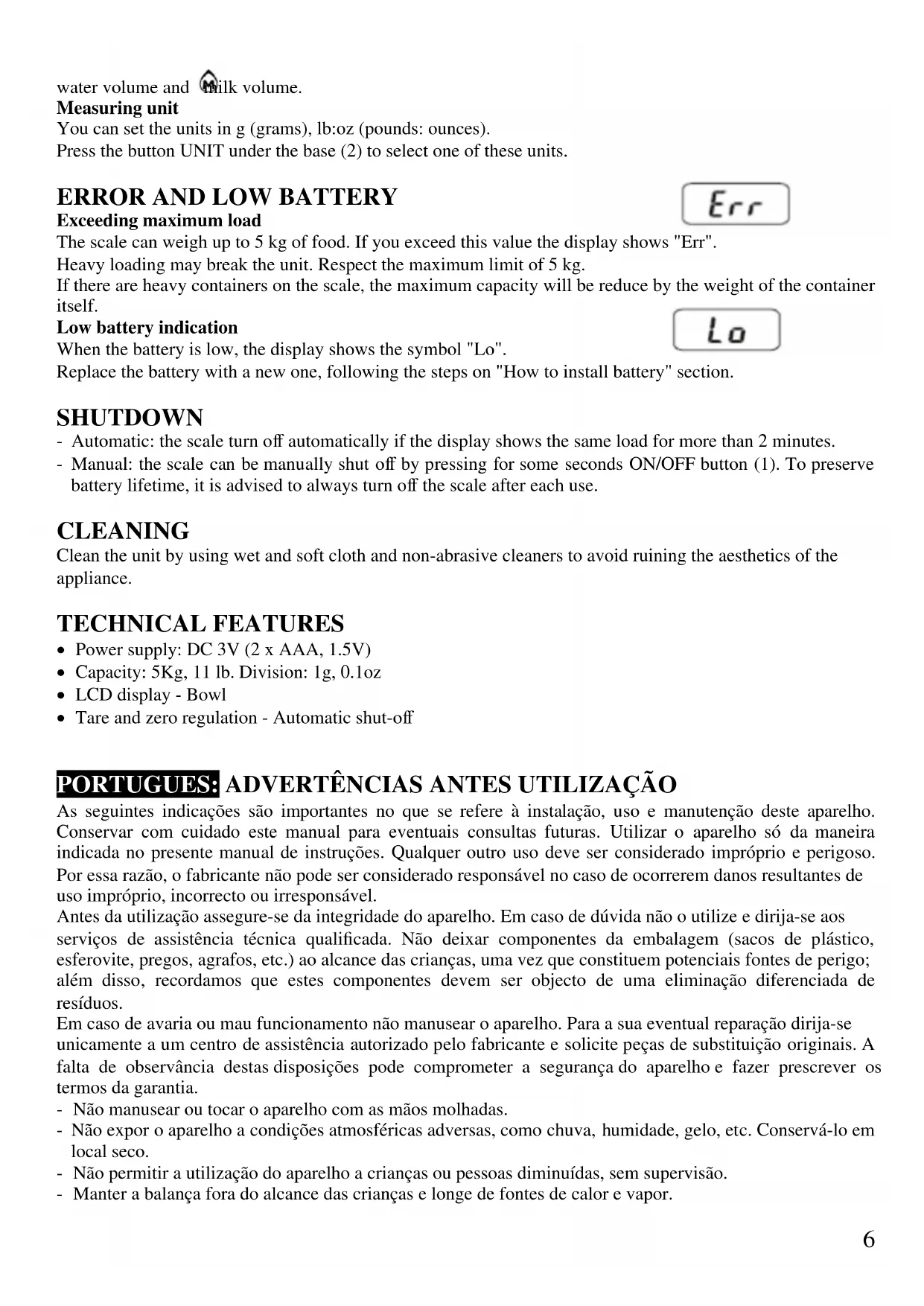 - Utilizar sempre pilhas de tipo AAA, 1.5V. - Ter o cuidado de introduzir as pilhas segundo a correcta polaridade, uma vez que de outro modo estas podem perder líquido e danificar a balança. Esses eventuais danos não são cobertos pela garantia. - Quando não se utiliza o aparelho por muito tempo aconselha-se a retirar as pilhas para evitar que se descarreguem. Não aquecer, abrir ou lançar as pilhas ao fogo. - As pilhas são objecto de tratamento diferenciado de resíduos, devendo ser depositadas nos respectivos pontos de recolha. FUNCIONAMENTO Pesagem - Posicionar a balança sobre uma superfície estável. Apoiar a taça (6) sobre a balança. - Carregar no botão ON/OFF (1) e aguardar que o visor indique os dados visíveis nas imagens ao lado. - Efectuar a pesagem.8 Função Tara / Zero A função tara é utilizada quando se deseja efectuar pesagens sucessivas utilizando recipientes diferentes, ou então quando, com o recipiente apoiado sobre a balança, o visor não indica zero. - Carregar no botão ZERO (1) - Se no visor (3) aparece “0g” e a indicação “T” (ou “0”), proceder à pesagem. - Se no visor (3) aparece “-----”, significa que o valor não está estável. Esperar alguns segundos. N.B.: se se liga a balança DEPOIS de ter posici onado o recipiente sobre o prato de pesagem não é necessário efectuar a taragem. Modo de pesagem Botão MODE (4) vá para peso normal a volume da água a volume de leite. Unidade de medida É possível visualizar o peso dos alimentos em g (gramas), lb:oz (libras: onças). Premindo o botão UNIT (sob a base 2) é possível seleccionar uma dessas unidades de medida. ALARMES Ultrapassagem da carga máxima A balança pode pesar alimentos até 5 Kg. Se se ultrapassa esse valor aparece no visor a indicação “Err”. Com cargas demasiado pesadas a balança pode partir-se. Atenção ao respeito pelo limite máximo de 5 Kg. Sempre que sejam colocados recipientes pesados na balança, o peso do próprio recipiente deve ser subtraído à carga máxima. Indicação de pilhas gastas Quando as pilhas estão prestes a esgotar-se aparece no visor o símbolo “Lo”. Substituir as pilhas gastas por outras novas de acordo com o parágrafo “Inserção das pilhas”. DESLIGAMENTO Automático: a balança desliga-se automaticamente no caso de o visor indicar o mesmo peso durante 2 minutos seguidos. Manual: a balança pode ser desligada pelo utilizador carregando alguns segundos no botão ON/OFF (1). Para aumentar a duração da pilha, desligar sempre a balança depois do uso. LIMPEZA Limpar só com panos húmidos e macios, e detergentes não abrasivos, para evitar estragar a estética do aparelho.
