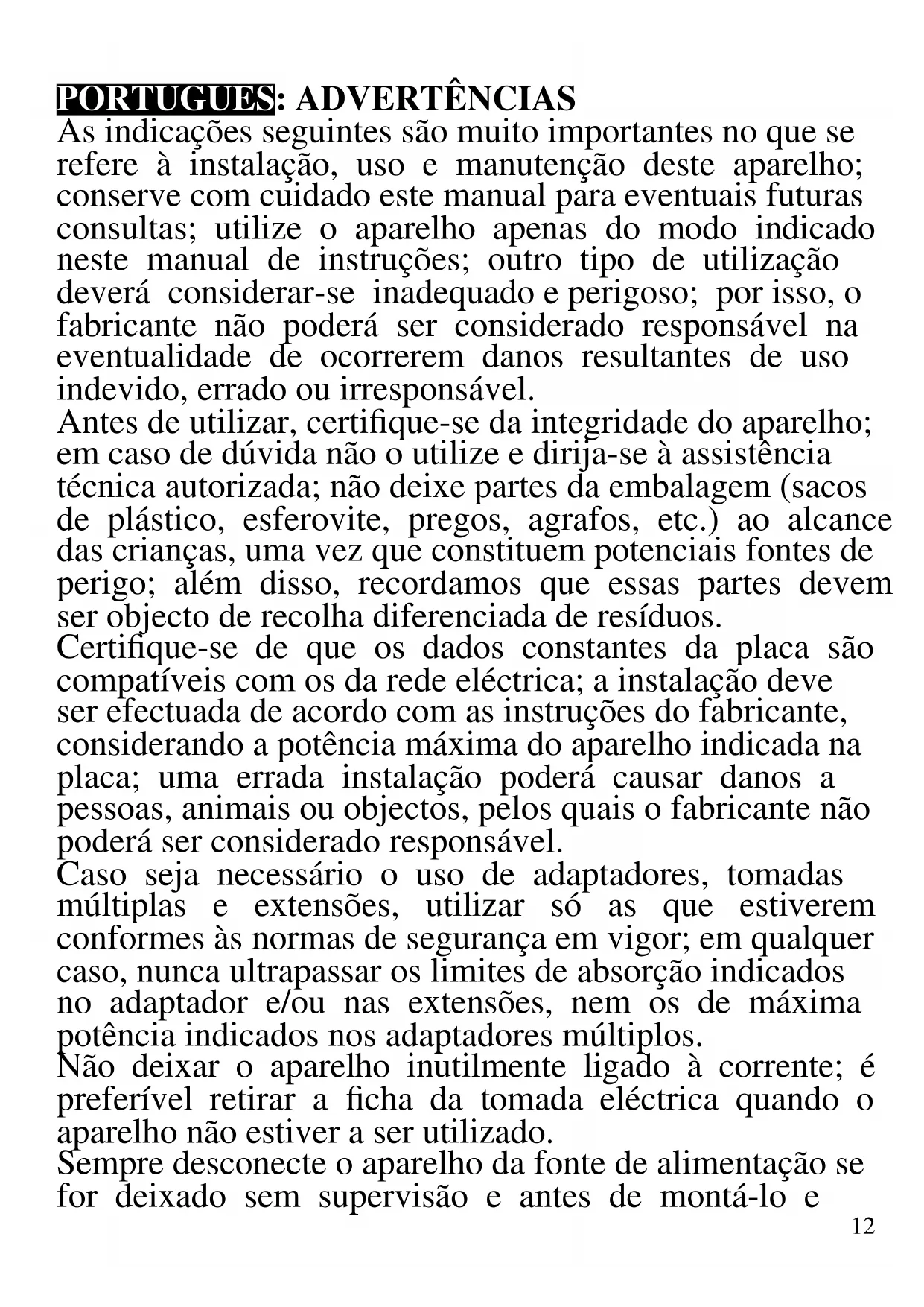 As indicações seguintes são muito importantes no que se refere à instalação, uso e manutenção deste aparelho; conserve com cuidado este manual para eventuais futuras consultas; utilize o aparelho apenas do modo indicado neste manual de instruções; outro tipo de utilização deverá considerar-se inadequado e perigoso; por isso, o fabricante não poderá ser considerado responsável na eventualidade de ocorrerem danos resultantes de uso indevido, errado ou irresponsável. Antes de utilizar, certifique-se da integridade do aparelho; em caso de dúvida não o utilize e dirija-se à assistência técnica autorizada; não deixe partes da embalagem (sacos de plástico, esferovite, pregos, agrafos, etc.) ao alcance das crianças, uma vez que constituem potenciais fontes de perigo; além disso, recordamos que essas partes devem ser objecto de recolha diferenciada de resíduos. Certifique-se de que os dados constantes da placa são compatíveis com os da rede eléctrica; a instalação deve ser efectuada de acordo com as instruções do fabricante, considerando a potência máxima do aparelho indicada na placa; uma errada instalação poderá causar danos a pessoas, animais ou objectos, pelos quais o fabricante não poderá ser considerado responsável. Caso seja necessário o uso de adaptadores, tomadas múltiplas e extensões, utilizar só as que estiverem conformes às normas de segurança em vigor; em qualquer caso, nunca ultrapassar os limites de absorção indicados no adaptador e/ou nas extensões, nem os de máxima potência indicados nos adaptadores múltiplos. Não deixar o aparelho inutilmente ligado à corrente; é preferível retirar a ficha da tomada eléctrica quando o aparelho não estiver a ser utilizado. Sempre desconecte o aparelho da fonte de alimentação se for deixado sem supervisão e antes de montá-lo e13 desmontá-lo. As operações de limpeza devem ser efectuadas depois de se ter desligado a ficha da tomada eléctrica. Sempre que o aparelho estiver fora de uso e seja decidido não o reparar, recomenda-se a sua inutilização, cortando- lhe o cabo de alimentação; - Não aproximar o cabo de alimentação de objectos cortantes ou de superfícies quentes, e não o puxar para arrancar a ficha da tomada eléctrica. Não deixe que ele fique pendurado na bancada onde a criança pode segurá- lo. Não utilizar o aparelho no caso de o cabo de alimentação ou a ficha se encontrarem danificados, ou em caso de curto-circuitos; Nessa eventualidade, leve o aparelho a um centro de assistência autorizado. - Não expor o aparelho a condições atmosféricas adversas, como chuva, humidade, gelo, etc. Conserve-o em lugares secos. - Não manusear ou tocar o aparelho com as mãos molhadas ou os pés descalços. - Este aparelho pode ser utilizado por crianças com mais de 8 anos e por pessoas com reduzida capacidade física, sensorial ou mental, ou ainda com falta de experiência na sua utilização, desde que lhes seja assegurada uma adequada supervisão ou se tiverem sido instruídas no uso do aparelho em segurança; as operações de limpeza e de manutenção não devem ser efectuadas por crianças, a menos que tenham mais de 8 anos e sejam supervisionadas. - As crianças não devem brincar com o aparelho. - Mantenha o aparelho e o cabo de alimentação fora do alcance de crianças com menos de 8 anos de idade. - Não indicado para uso comercial. Só para uso doméstico. Em caso de avaria e/ou de mau funcionamento, não intervenha sobre o aparelho. Para uma eventual14 reparação dirija-se unicamente a um centro autorizado pelo fabricante e solicite peças de substituição originais. A não observância destas indicações pode comprometer a segurança do aparelho e tornar inválidos os termos da garantia. - Este aparelho não foi concebido para ser utilizado por intermédio de um temporizador externo ou de um sistema de comando à distância autónomo. - Antes de cada utilização, soltar o cabo de alimentação. - Este aparelho foi concebido para uso doméstico ou equivalente, em situações como as de refeitórios em pequenas empresas ou outros ambientes de natureza laboral; por clientes de hotéis, motéis ou acomodação turística, como turismo rural ou residencial. - Utilizar somente acessórios e componentes originais. - Manter o aparelho afastado de materiais inflamáveis, fontes de calor, zonas frias e vapor. Não sujeite produto a impactos, pois isso pode danificá-lo