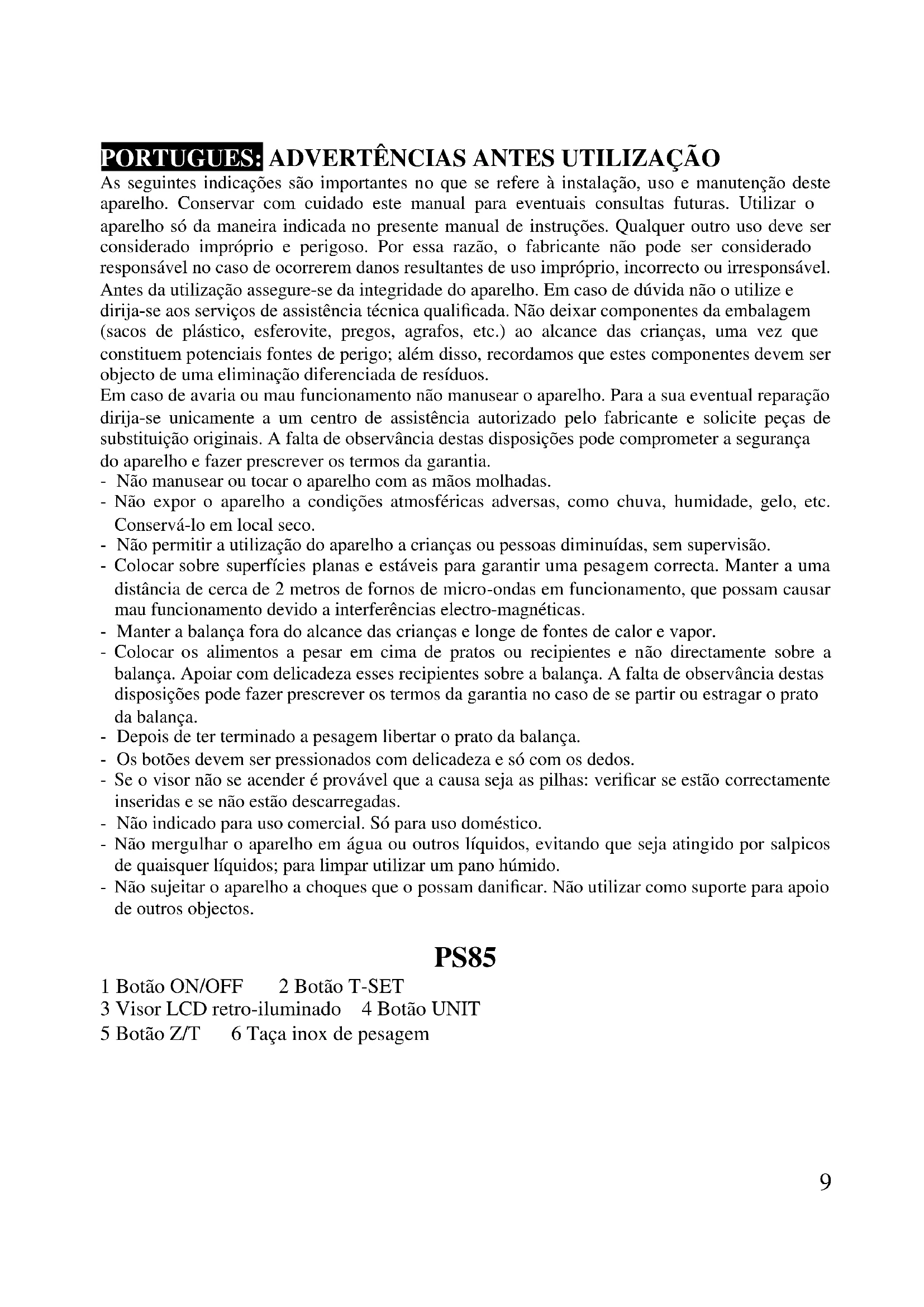 As seguintes indicações são importantes no que se refere à instalação, uso e manutenção deste aparelho. Conservar com cuidado este manual para eventuais consultas futuras. Utilizar o aparelho só da maneira indicada no presente manual de instruções. Qualquer outro uso deve ser considerado impróprio e perigoso. Por essa razão, o fabricante não pode ser considerado responsável no caso de ocorrerem danos resultantes de uso impróprio, incorrecto ou irresponsável. Antes da utilização assegure-se da integridade do aparelho. Em caso de dúvida não o utilize e dirija-se aos serviços de assistência técnica qualificada. Não deixar componentes da embalagem (sacos de plástico, esferovite, pregos, agrafos, etc.) ao alcance das crianças, uma vez que constituem potenciais fontes de perigo; além disso, recordamos que estes componentes devem ser objecto de uma eliminação diferenciada de resíduos. Em caso de avaria ou mau funcionamento não manusear o aparelho. Para a sua eventual reparação dirija-se unicamente a um centro de assistência autorizado pelo fabricante e solicite peças de substituição originais. A falta de observância destas disposições pode comprometer a segurança do aparelho e fazer prescrever os termos da garantia. - Não manusear ou tocar o aparelho com as mãos molhadas. - Não expor o aparelho a condições atmosféricas adversas, como chuva, humidade, gelo, etc. Conservá-lo em local seco. - Não permitir a utilização do aparelho a crianças ou pessoas diminuídas, sem supervisão. - Colocar sobre superfícies planas e estáveis para garantir uma pesagem correcta. Manter a uma distância de cerca de 2 metros de fornos de micro-ondas em funcionamento, que possam causar mau funcionamento devido a interferências electro-magnéticas. - Manter a balança fora do alcance das crianças e longe de fontes de calor e vapor. - Colocar os alimentos a pesar em cima de pratos ou recipientes e não directamente sobre a balança. Apoiar com delicadeza esses recipientes sobre a balança. A falta de observância destas disposições pode fazer prescrever os termos da garantia no caso de se partir ou estragar o prato da balança. - Depois de ter terminado a pesagem libertar o prato da balança. - Os botões devem ser pressionados com delicadeza e só com os dedos. - Se o visor não se acender é provável que a causa seja as pilhas: verificar se estão correctamente inseridas e se não estão descarregadas. - Não indicado para uso comercial. Só para uso doméstico. - Não mergulhar o aparelho em água ou outros líquidos, evitando que seja atingido por salpicos de quaisquer líquidos; para limpar utilizar um pano húmido. - Não sujeitar o aparelho a choques que o possam danificar. Não utilizar como suporte para apoio de outros objectos. PS85 1 Botão ON/OFF 2 Botão T-SET 3 Visor LCD retro-iluminado 4 Botão UNIT 5 Botão Z/T 6 Taça inox de pesagem10 VISOR Alarme temporizador Temporizador / Quilogramas / gramas / Libras / onças Temperatura ambiente