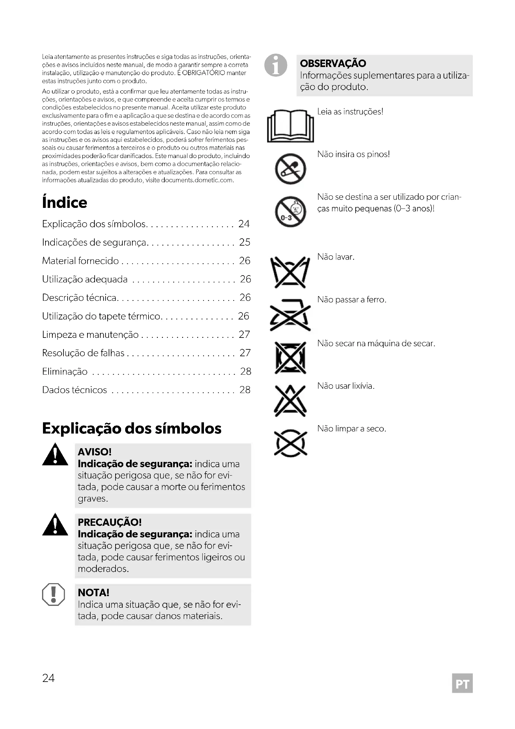 AVISO! Indicação de segurança: indica uma situação perigosa que, se não for evi- tada, pode causar a morte ou ferimentos graves. PRECAUÇÃO! Indicação de segurança: indica uma situação perigosa que, se não for evi- tada, pode causar ferimentos ligeiros ou moderados. NOTA! Indica uma situação que, se não for evi- tada, pode causar danos materiais. OBSERVAÇÃO Informações suplementares para a utiliza- ção do produto. Leia as instruções!Não insira os pinos!Não se destina a ser utilizado por crian-ças muito pequenas (0–3 anos)!Não lavar.Não passar a ferro.Não secar na máquina de secar.Não usar lixívia.Não limpar a seco.25