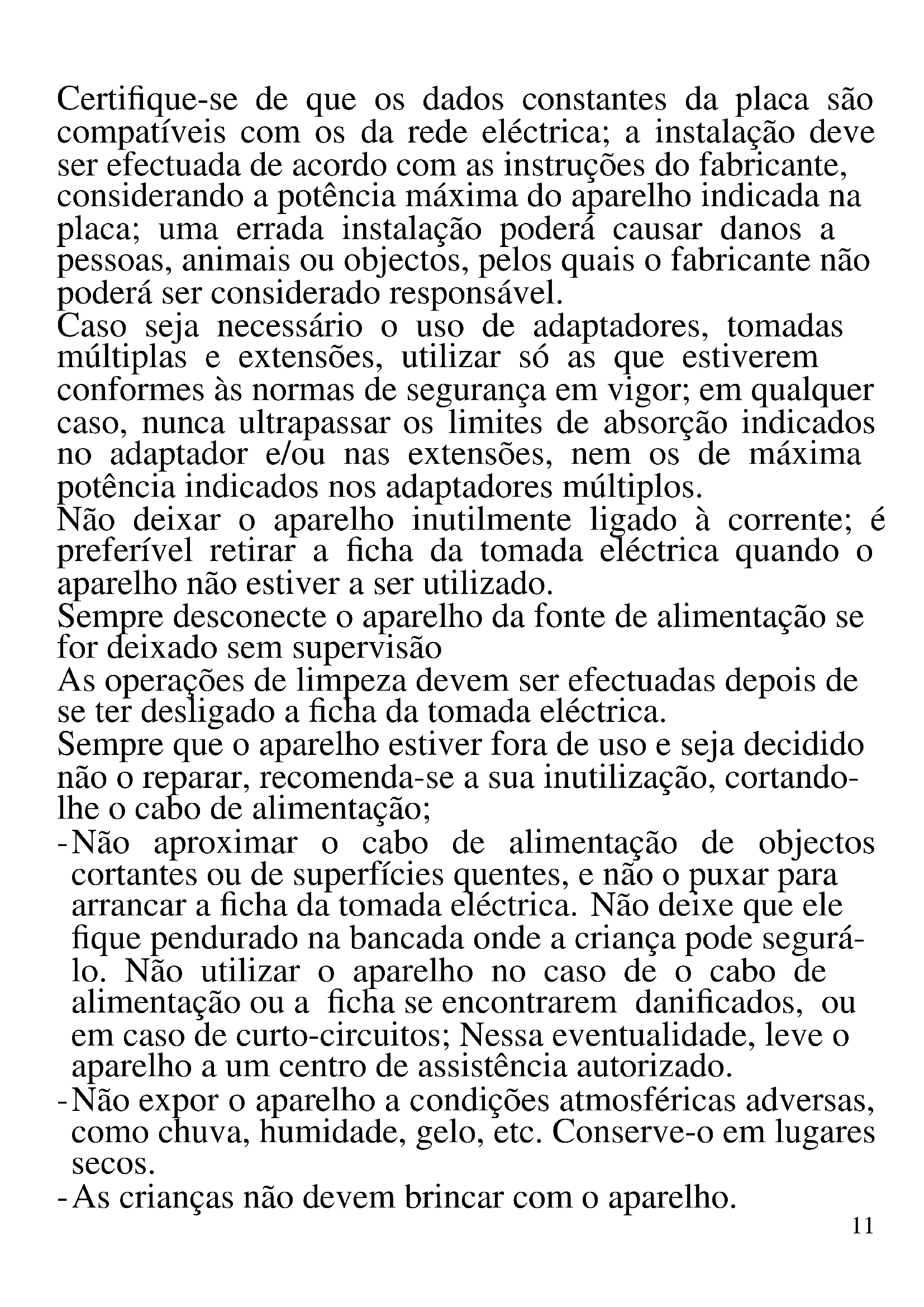 As indicações seguintes são muito importantes no que se refere à instalação, uso e manutenção deste aparelho; conserve com cuidado este manual para eventuais futuras consultas; utilize o aparelho apenas do modo indicado neste manual de instruções; outro tipo de utilização deverá considerar-se inadequado e perigoso; por isso, o fabricante não poderá ser considerado responsável na eventualidade de ocorrerem danos resultantes de uso indevido, errado ou irresponsável. Antes de utilizar, certifique-se da integridade do aparelho; em caso de dúvida não o utilize e dirija-se à assistência técnica autorizada; não deixe partes da embalagem (sacos de plástico, esferovite, pregos, agrafos, etc.) ao alcance das crianças, uma vez que constituem potenciais fontes de perigo; além disso, recordamos que essas partes devem ser objecto de recolha diferenciada de resíduos.11 Certifique-se de que os dados constantes da placa são compatíveis com os da rede eléctrica; a instalação deve ser efectuada de acordo com as instruções do fabricante, considerando a potência máxima do aparelho indicada na placa; uma errada instalação poderá causar danos a pessoas, animais ou objectos, pelos quais o fabricante não poderá ser considerado responsável. Caso seja necessário o uso de adaptadores, tomadas múltiplas e extensões, utilizar só as que estiverem conformes às normas de segurança em vigor; em qualquer caso, nunca ultrapassar os limites de absorção indicados no adaptador e/ou nas extensões, nem os de máxima potência indicados nos adaptadores múltiplos. Não deixar o aparelho inutilmente ligado à corrente; é preferível retirar a ficha da tomada eléctrica quando o aparelho não estiver a ser utilizado. Sempre desconecte o aparelho da fonte de alimentação se for deixado sem supervisão As operações de limpeza devem ser efectuadas depois de se ter desligado a ficha da tomada eléctrica. Sempre que o aparelho estiver fora de uso e seja decidido não o reparar, recomenda-se a sua inutilização, cortando- lhe o cabo de alimentação; - Não aproximar o cabo de alimentação de objectos cortantes ou de superfícies quentes, e não o puxar para arrancar a ficha da tomada eléctrica. Não deixe que ele fique pendurado na bancada onde a criança pode segurá- lo. Não utilizar o aparelho no caso de o cabo de alimentação ou a ficha se encontrarem danificados, ou em caso de curto-circuitos; Nessa eventualidade, leve o aparelho a um centro de assistência autorizado. - Não expor o aparelho a condições atmosféricas adversas, como chuva, humidade, gelo, etc. Conserve-o em lugares secos. - As crianças não devem brincar com o aparelho.12 - Não manusear ou tocar o aparelho com as mãos molhadas ou os pés descalços. - Este aparelho pode ser utilizado por crianças com mais de 8 anos e por pessoas com reduzida capacidade física, sensorial ou mental, ou ainda com falta de experiência na sua utilização, desde que lhes seja assegurada uma adequada supervisão ou se tiverem sido instruídas no uso do aparelho em segurança; as operações de limpeza e de manutenção não devem ser efectuadas por crianças, a menos que tenham mais de 8 anos e sejam supervisionadas. - Mantenha o aparelho e o cabo de alimentação fora do alcance de crianças com menos de 8 anos de idade. Se o cabo de alimentação estiver danificado, ou em caso de falha e / ou avaria, não mexa no aparelho. Qualquer reparação deve ser realizada pelo fabricante ou pelo seu serviço de assistência técnica ou, em qualquer caso, por uma pessoa com qualificação semelhante, a fim de evitar qualquer risco. O não cumprimento dos itens acima pode comprometer a segurança do equipamento e invalidar os termos da garantia. Coloque o aparelho exclusivamente sobre superfícies com aderência e preparadas para o efeito, - Este aparelho foi concebido para uso doméstico ou equivalente, em situações como as de refeitórios em pequenas empresas ou outros ambientes de natureza laboral; por clientes de hotéis, motéis ou acomodação turística, como turismo rural ou residencial. - Este aparelho não foi concebido para ser utilizado por intermédio de um temporizador externo ou de um sistema de comando à distância autónomo. - Antes de cada utilização, soltar o cabo de alimentação. - Utilizar somente acessórios e componentes originais. - Não sujeite o produto a impactos, pois isso pode danificá-lo.13 Manter o aparelho afastado de materiais inflamáveis, fontes de calor, zonas frias e vapor.