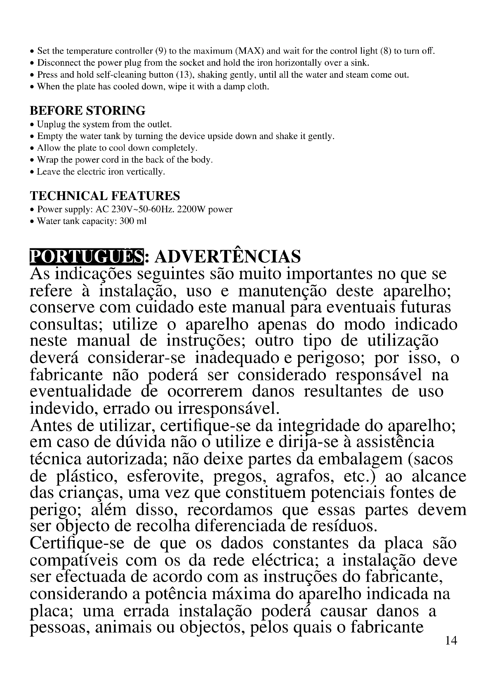Para engomar a seco, colocar em “0” o botão de regulação de vapor (3). Deste modo fica impedida a transmissão de vapor ao ferro, mantendo o esguicho de água, no entanto, possível. LIMPEZA Antes de limpar qualquer parte do aparelho certifique-se de que a ficha está desligada da tomada eléctrica e que a prancha não escalda. Qualquer resíduo que tenha ficado na prancha pode ser removido usando un pano húmido ou um detergente líquido não abrasivo. Não arranhar a prancha com esponjas ou objectos metálicos. Os componentes de plástico podem ser limpos com um pano molhado e depois secos com um pano enxuto. Não mergulhar o aparelho em água. Auto-limpeza: recomendamos o uso desta função a cada 10-15 dias. A auto-limpeza remove impurezas e resíduos de calcário que inevitavelmente se formam no interior dos furos da prancha. Seguir estes passos: