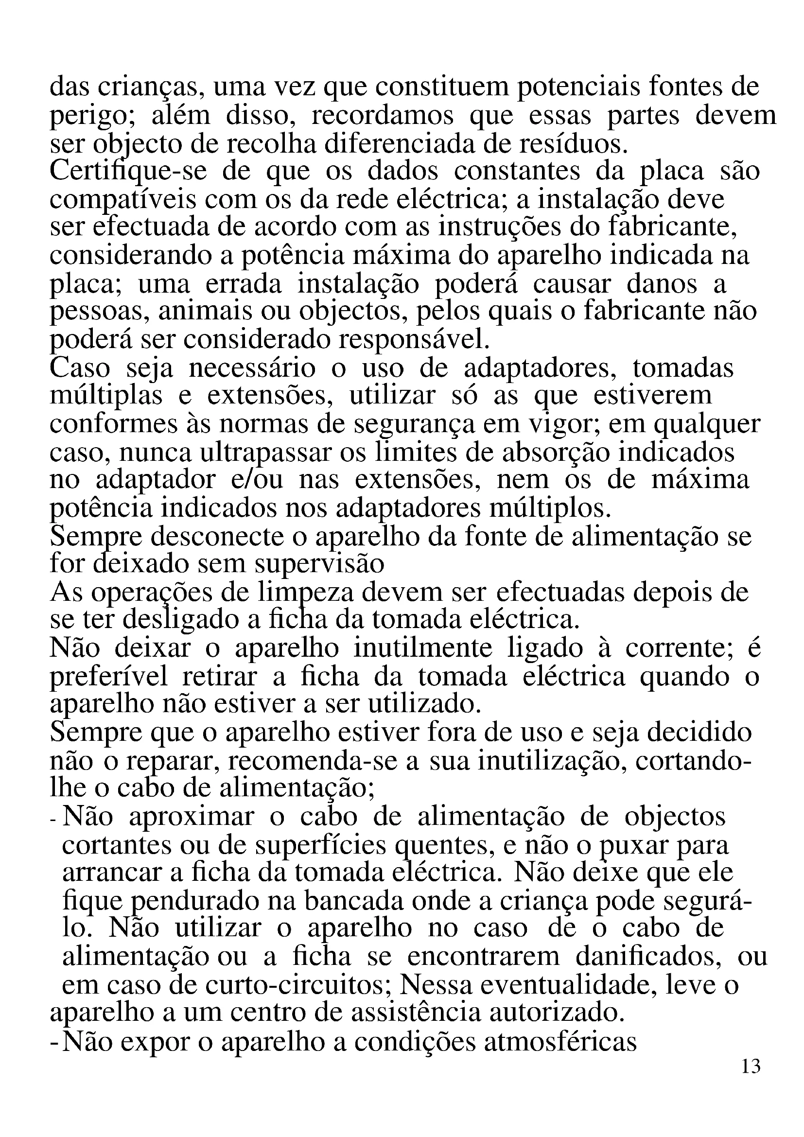 As indicações seguintes são muito importantes no que se refere à instalação, uso e manutenção deste aparelho; conserve com cuidado este manual para eventuais futuras consultas; utilize o aparelho apenas do modo indicado neste manual de instruções; outro tipo de utilização deverá considerar-se inadequado e perigoso; por isso, o fabricante não poderá ser considerado responsável na eventualidade de ocorrerem danos resultantes de uso indevido, errado ou irresponsável. Antes de utilizar, certifique-se da integridade do aparelho; em caso de dúvida não o utilize e dirija-se à assistência técnica autorizada; não deixe partes da embalagem (sacos de plástico, esferovite, pregos, agrafos, etc.) ao alcance13 das crianças, uma vez que constituem potenciais fontes de perigo; além disso, recordamos que essas partes devem ser objecto de recolha diferenciada de resíduos. Certifique-se de que os dados constantes da placa são compatíveis com os da rede eléctrica; a instalação deve ser efectuada de acordo com as instruções do fabricante, considerando a potência máxima do aparelho indicada na placa; uma errada instalação poderá causar danos a pessoas, animais ou objectos, pelos quais o fabricante não poderá ser considerado responsável. Caso seja necessário o uso de adaptadores, tomadas múltiplas e extensões, utilizar só as que estiverem conformes às normas de segurança em vigor; em qualquer caso, nunca ultrapassar os limites de absorção indicados no adaptador e/ou nas extensões, nem os de máxima potência indicados nos adaptadores múltiplos. Sempre desconecte o aparelho da fonte de alimentação se for deixado sem supervisão As operações de limpeza devem ser efectuadas depois de se ter desligado a ficha da tomada eléctrica. Não deixar o aparelho inutilmente ligado à corrente; é preferível retirar a ficha da tomada eléctrica quando o aparelho não estiver a ser utilizado. Sempre que o aparelho estiver fora de uso e seja decidido não o reparar, recomenda-se a sua inutilização, cortando- lhe o cabo de alimentação; - Não aproximar o cabo de alimentação de objectos cortantes ou de superfícies quentes, e não o puxar para arrancar a ficha da tomada eléctrica. Não deixe que ele fique pendurado na bancada onde a criança pode segurá- lo. Não utilizar o aparelho no caso de o cabo de alimentação ou a ficha se encontrarem danificados, ou em caso de curto-circuitos; Nessa eventualidade, leve o aparelho a um centro de assistência autorizado. - Não expor o aparelho a condições atmosféricas14 adversas, como chuva, humidade, gelo, etc. Conserve-o em lugares secos. Não manusear ou tocar o aparelho com as mãos molhadas ou os pés descalços. - Este aparelho pode ser utilizado por crianças com mais de 8 anos e por pessoas com reduzida capacidade física, sensorial ou mental, ou ainda com falta de experiência na sua utilização, desde que lhes seja assegurada uma adequada supervisão ou se tiverem sido instruídas no uso do aparelho em segurança; as operações de limpeza e de manutenção não devem ser efectuadas por crianças, a menos que tenham mais de 8 anos e sejam supervisionadas. - As crianças não devem brincar com o aparelho. - Mantenha o aparelho e o cabo de alimentação fora do alcance de crianças com menos de 8 anos de idade. Se o cabo de alimentação estiver danificado, ou em caso de falha e / ou avaria, não mexa no aparelho. Qualquer reparação deve ser realizada pelo fabricante ou pelo seu serviço de assistência técnica ou, em qualquer caso, por uma pessoa com qualificação semelhante, a fim de evitar qualquer risco. O não cumprimento dos itens acima pode comprometer a segurança do equipamento e invalidar os termos da garantia. ATENÇÃO: este aparelho inclui uma função de aquecimento. Algumas superfícies, mesmo que não a placa propriamente dita, poderão atingir temperaturas elevadas. Uma vez que a sensibilidade à temperatura difere de pessoa para pessoa, este aparelho deverá ser usado com CUIDADO. Coloque o aparelho exclusivamente sobre superfícies com aderência e preparadas para o efeito, - Este aparelho foi concebido para uso doméstico ou equivalente, em situações como as de refeitórios em pequenas empresas ou outros ambientes de natureza laboral; por clientes de hotéis, motéis ou acomodação15 turística, como turismo rural ou residencial. - Este aparelho não foi concebido para ser utilizado por intermédio de um temporizador externo ou de um sistema de comando à distância autónomo. - Antes de cada utilização, soltar o cabo de alimentação. - Utilizar somente acessórios e componentes originais. Não sujeite produto a impactos, pois isso pode danificá-lo - Manter o aparelho afastado de materiais inflamáveis, fontes de calor, zonas frias e vapor.