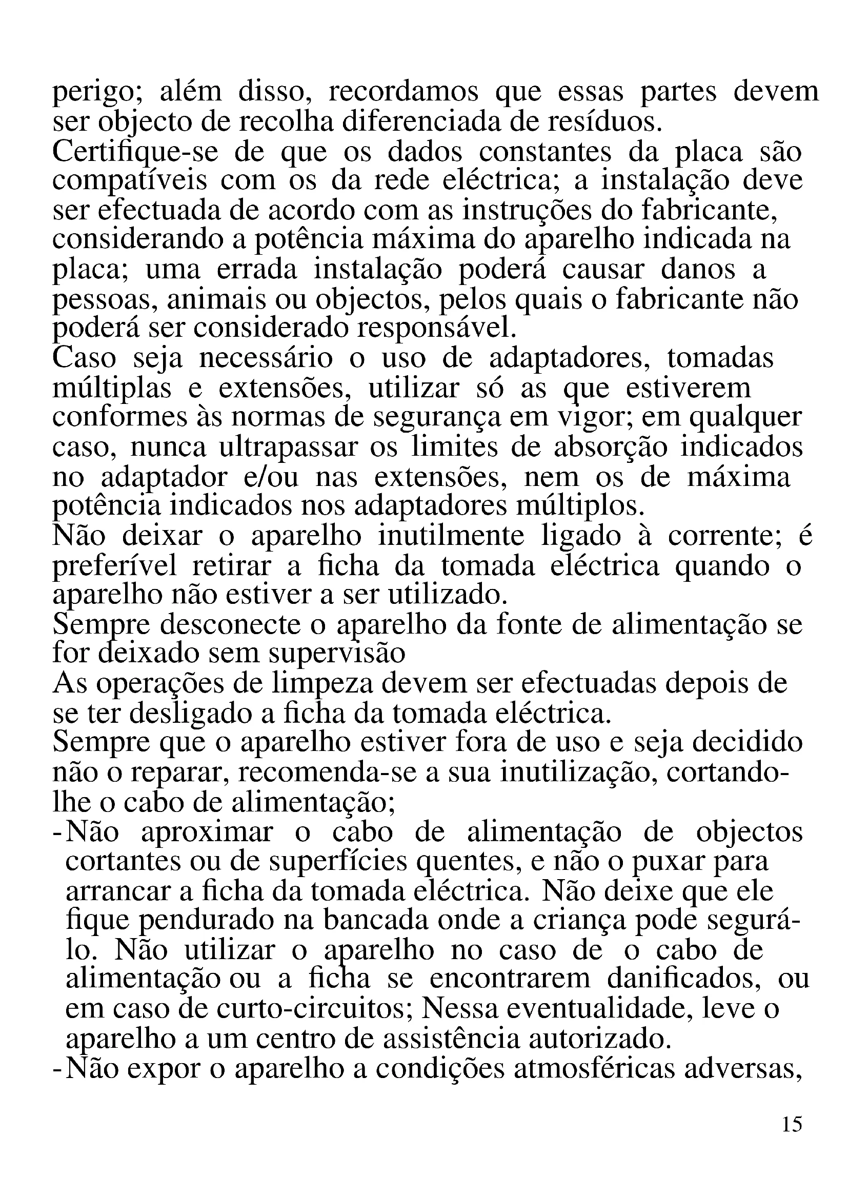As indicações seguintes são muito importantes no que se refere à instalação, uso e manutenção deste aparelho; conserve com cuidado este manual para eventuais futuras consultas; utilize o aparelho apenas do modo indicado neste manual de instruções; outro tipo de utilização deverá considerar-se inadequado e perigoso; por isso, o fabricante não poderá ser considerado responsável na eventualidade de ocorrerem danos resultantes de uso indevido, errado ou irresponsável. Antes de utilizar, certifique-se da integridade do aparelho; em caso de dúvida não o utilize e dirija-se à assistência técnica autorizada; não deixe partes da embalagem (sacos de plástico, esferovite, pregos, agrafos, etc.) ao alcance das crianças, uma vez que constituem potenciais fontes de15 perigo; além disso, recordamos que essas partes devem ser objecto de recolha diferenciada de resíduos. Certifique-se de que os dados constantes da placa são compatíveis com os da rede eléctrica; a instalação deve ser efectuada de acordo com as instruções do fabricante, considerando a potência máxima do aparelho indicada na placa; uma errada instalação poderá causar danos a pessoas, animais ou objectos, pelos quais o fabricante não poderá ser considerado responsável. Caso seja necessário o uso de adaptadores, tomadas múltiplas e extensões, utilizar só as que estiverem conformes às normas de segurança em vigor; em qualquer caso, nunca ultrapassar os limites de absorção indicados no adaptador e/ou nas extensões, nem os de máxima potência indicados nos adaptadores múltiplos. Não deixar o aparelho inutilmente ligado à corrente; é preferível retirar a ficha da tomada eléctrica quando o aparelho não estiver a ser utilizado. Sempre desconecte o aparelho da fonte de alimentação se for deixado sem supervisão As operações de limpeza devem ser efectuadas depois de se ter desligado a ficha da tomada eléctrica. Sempre que o aparelho estiver fora de uso e seja decidido não o reparar, recomenda-se a sua inutilização, cortando- lhe o cabo de alimentação; - Não aproximar o cabo de alimentação de objectos cortantes ou de superfícies quentes, e não o puxar para arrancar a ficha da tomada eléctrica. Não deixe que ele fique pendurado na bancada onde a criança pode segurá- lo. Não utilizar o aparelho no caso de o cabo de alimentação ou a ficha se encontrarem danificados, ou em caso de curto-circuitos; Nessa eventualidade, leve o aparelho a um centro de assistência autorizado. - Não expor o aparelho a condições atmosféricas adversas,16 como chuva, humidade, gelo. Conserve-o em lugar seco. - Não manusear ou tocar o aparelho com as mãos molhadas ou os pés descalços. - Este aparelho pode ser utilizado por crianças com mais de 8 anos e por pessoas com reduzida capacidade física, sensorial ou mental, ou ainda com falta de experiência na sua utilização, desde que lhes seja assegurada uma adequada supervisão ou se tiverem sido instruídas no uso do aparelho em segurança; as operações de limpeza e de manutenção não devem ser efectuadas por crianças, a menos que tenham mais de 8 anos e sejam supervisionadas. - As crianças não devem brincar com o aparelho. - Mantenha o aparelho e o cabo de alimentação fora do alcance de crianças com menos de 8 anos de idade. Se o cabo de alimentação estiver danificado, ou em caso de falha e / ou avaria, não mexa no aparelho. Qualquer reparação deve ser realizada pelo fabricante ou pelo seu serviço de assistência técnica ou, em qualquer caso, por uma pessoa com qualificação semelhante, a fim de evitar qualquer risco. O não cumprimento dos itens acima pode comprometer a segurança do equipamento e invalidar os termos da garantia. ATENÇÃO: este aparelho inclui uma função de aquecimento. Algumas superfícies, mesmo que não a placa propriamente dita, poderão atingir temperaturas elevadas. Uma vez que a sensibilidade à temperatura difere de pessoa para pessoa, este aparelho deverá ser usado com CUIDADO. Coloque o aparelho exclusivamente sobre superfícies com aderência e preparadas para o efeito, - Este aparelho foi concebido para uso doméstico ou equivalente, em situações como as de refeitórios em pequenas empresas ou outros ambientes de natureza17 laboral; por clientes de hotéis, motéis ou acomodação turística, como turismo rural ou residencial. - Este aparelho não foi concebido para ser utilizado por intermédio de um temporizador externo ou de um sistema de comando à distância autónomo. - Antes de cada utilização, soltar o cabo de alimentação. - Utilizar somente acessórios e componentes originais. - Não sujeite o produto a impactos, pois isso pode danificá-lo. Manter o aparelho afastado de materiais inflamáveis, fontes de calor, zonas frias e vapor.
