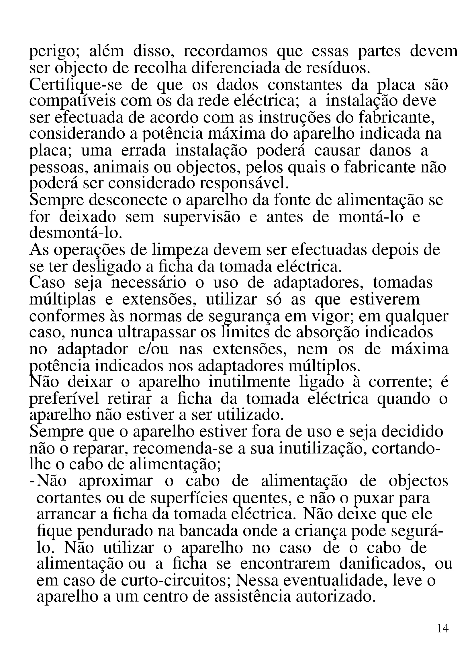 As indicações seguintes são muito importantes no que se refere à instalação, uso e manutenção deste aparelho; conserve com cuidado este manual para eventuais futuras consultas; utilize o aparelho apenas do modo indicado neste manual de instruções; outro tipo de utilização deverá considerar-se inadequado e perigoso; por isso, o fabricante não poderá ser considerado responsável na eventualidade de ocorrerem danos resultantes de uso indevido, errado ou irresponsável. Antes de utilizar, certifique-se da integridade do aparelho; em caso de dúvida não o utilize e dirija-se à assistência técnica autorizada; não deixe partes da embalagem (sacos de plástico, esferovite, pregos, agrafos, etc.) ao alcance das crianças, uma vez que constituem potenciais fontes de14 perigo; além disso, recordamos que essas partes devem ser objecto de recolha diferenciada de resíduos. Certifique-se de que os dados constantes da placa são compatíveis com os da rede eléctrica; a instalação deve ser efectuada de acordo com as instruções do fabricante, considerando a potência máxima do aparelho indicada na placa; uma errada instalação poderá causar danos a pessoas, animais ou objectos, pelos quais o fabricante não poderá ser considerado responsável. Sempre desconecte o aparelho da fonte de alimentação se for deixado sem supervisão e antes de montá-lo e desmontá-lo. As operações de limpeza devem ser efectuadas depois de se ter desligado a ficha da tomada eléctrica. Caso seja necessário o uso de adaptadores, tomadas múltiplas e extensões, utilizar só as que estiverem conformes às normas de segurança em vigor; em qualquer caso, nunca ultrapassar os limites de absorção indicados no adaptador e/ou nas extensões, nem os de máxima potência indicados nos adaptadores múltiplos. Não deixar o aparelho inutilmente ligado à corrente; é preferível retirar a ficha da tomada eléctrica quando o aparelho não estiver a ser utilizado. Sempre que o aparelho estiver fora de uso e seja decidido não o reparar, recomenda-se a sua inutilização, cortando- lhe o cabo de alimentação; - Não aproximar o cabo de alimentação de objectos cortantes ou de superfícies quentes, e não o puxar para arrancar a ficha da tomada eléctrica. Não deixe que ele fique pendurado na bancada onde a criança pode segurá- lo. Não utilizar o aparelho no caso de o cabo de alimentação ou a ficha se encontrarem danificados, ou em caso de curto-circuitos; Nessa eventualidade, leve o aparelho a um centro de assistência autorizado.15 - Não expor o aparelho a condições atmosféricas adversas, como chuva, humidade, gelo. Conserve em lugar seco. - Não manusear ou tocar o aparelho com as mãos molhadas ou os pés descalços. - As crianças não devem brincar com o aparelho. - Este aparelho não pode ser usado por crianças, mesmo com mais de 8 anos. - Este aparelho pode ser por pessoas com reduzida capacidade física, sensorial ou mental, ou ainda com falta de experiência na sua utilização, desde que lhes seja assegurada uma adequada supervisão ou se tiverem sido instruídas no uso do aparelho em segurança. - Mantenha o aparelho e o cabo de alimentação fora do alcance de crianças com menos de 8 anos de idade. - Não indicado para uso comercial. Só para uso doméstico Em caso de avaria e/ou de mau funcionamento, não intervenha sobre o aparelho. Para uma eventual reparação dirija-se unicamente a um centro autorizado pelo fabricante e solicite peças de substituição originais. A não observância destas indicações pode comprometer a segurança do aparelho e tornar inválidos os termos da garantia. ATENÇÃO: este aparelho inclui uma função de aquecimento. Algumas superfícies, mesmo que não a placa propriamente dita, poderão atingir temperaturas elevadas. Uma vez que a sensibilidade à temperatura difere de pessoa para pessoa, este aparelho deverá ser usado com CUIDADO. Coloque o aparelho exclusivamente sobre superfícies com aderência e preparadas para o efeito, e use as necessárias medidas de protecção contra o calor, como pegas ou luvas. - Este aparelho foi concebido para uso doméstico ou equivalente, em situações como as de refeitórios em pequenas empresas ou outros ambientes de natureza16 laboral; por clientes de hotéis, motéis ou acomodação turística, como turismo rural ou residencial. - Antes de cada utilização, soltar o cabo de alimentação. - Este aparelho não foi concebido para ser utilizado por intermédio de um temporizador externo ou de um sistema de comando à distância autónomo. - Utilizar somente acessórios e componentes originais. - Não sujeite o produto a impactos, pois isso pode danificá-lo.