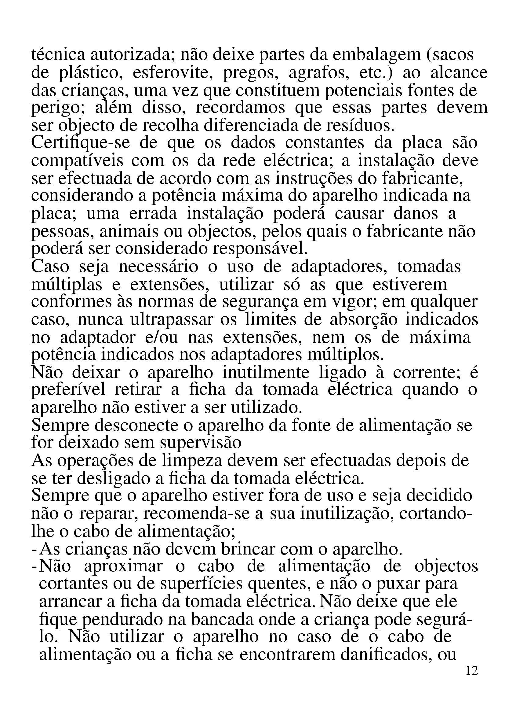 As indicações seguintes são muito importantes no que se refere à instalação, uso e manutenção deste aparelho; conserve com cuidado este manual para eventuais futuras consultas; utilize o aparelho apenas do modo indicado neste manual de instruções; outro tipo de utilização deverá considerar-se inadequado e perigoso; por isso, o fabricante não poderá ser considerado responsável na eventualidade de ocorrerem danos resultantes de uso indevido, errado ou irresponsável. Antes de utilizar, certifique-se da integridade do aparelho; em caso de dúvida não o utilize e dirija-se à assistência12 técnica autorizada; não deixe partes da embalagem (sacos de plástico, esferovite, pregos, agrafos, etc.) ao alcance das crianças, uma vez que constituem potenciais fontes de perigo; além disso, recordamos que essas partes devem ser objecto de recolha diferenciada de resíduos. Certifique-se de que os dados constantes da placa são compatíveis com os da rede eléctrica; a instalação deve ser efectuada de acordo com as instruções do fabricante, considerando a potência máxima do aparelho indicada na placa; uma errada instalação poderá causar danos a pessoas, animais ou objectos, pelos quais o fabricante não poderá ser considerado responsável. Caso seja necessário o uso de adaptadores, tomadas múltiplas e extensões, utilizar só as que estiverem conformes às normas de segurança em vigor; em qualquer caso, nunca ultrapassar os limites de absorção indicados no adaptador e/ou nas extensões, nem os de máxima potência indicados nos adaptadores múltiplos. Não deixar o aparelho inutilmente ligado à corrente; é preferível retirar a ficha da tomada eléctrica quando o aparelho não estiver a ser utilizado. Sempre desconecte o aparelho da fonte de alimentação se for deixado sem supervisão As operações de limpeza devem ser efectuadas depois de se ter desligado a ficha da tomada eléctrica. Sempre que o aparelho estiver fora de uso e seja decidido não o reparar, recomenda-se a sua inutilização, cortando- lhe o cabo de alimentação; - As crianças não devem brincar com o aparelho. - Não aproximar o cabo de alimentação de objectos cortantes ou de superfícies quentes, e não o puxar para arrancar a ficha da tomada eléctrica. Não deixe que ele fique pendurado na bancada onde a criança pode segurá- lo. Não utilizar o aparelho no caso de o cabo de alimentação ou a ficha se encontrarem danificados, ou13 em caso de curto-circuitos; Nessa eventualidade, leve o aparelho a um centro de assistência autorizado. - Não expor a condições atmosféricas adversas: chuva, humidade, gelo, etc. Conserve-o em lugares secos. - Não manusear ou tocar o aparelho com as mãos molhadas ou os pés descalços. - Este aparelho pode ser utilizado por crianças com mais de 8 anos e por pessoas com reduzida capacidade física, sensorial ou mental, ou ainda com falta de experiência na sua utilização, desde que lhes seja assegurada uma adequada supervisão ou se tiverem sido instruídas no uso do aparelho em segurança; as operações de limpeza e de manutenção não devem ser efectuadas por crianças, a menos que tenham mais de 8 anos e sejam supervisionadas. - Mantenha o aparelho e o cabo de alimentação fora do alcance de crianças com menos de 8 anos de idade. Se o cabo de alimentação estiver danificado, ou em caso de falha e / ou avaria, não mexa no aparelho. Qualquer reparação deve ser realizada pelo fabricante ou pelo seu serviço de assistência técnica ou, em qualquer caso, por uma pessoa com qualificação semelhante, a fim de evitar qualquer risco. O não cumprimento dos itens acima pode comprometer a segurança do equipamento e invalidar os termos da garantia. ATENÇÃO: este aparelho inclui uma função de aquecimento. Algumas superfícies, mesmo que não a placa propriamente dita, poderão atingir temperaturas elevadas. Uma vez que a sensibilidade à temperatura difere de pessoa para pessoa, este aparelho deverá ser usado com CUIDADO. Coloque o aparelho exclusivamente sobre superfícies com aderência e preparadas para o efeito, - Este aparelho foi concebido para uso doméstico ou equivalente, em situações como as de refeitórios em14 pequenas empresas ou outros ambientes de natureza laboral; por clientes de hotéis, motéis ou acomodação turística, como turismo rural ou residencial. - Este aparelho não foi concebido para ser utilizado por intermédio de um temporizador externo ou de um sistema de comando à distância autónomo. - Antes de cada utilização, soltar o cabo de alimentação. - Utilizar somente acessórios e componentes originais. Não sujeite produto a impactos, pois isso pode danificá-lo Manter o aparelho afastado de materiais inflamáveis, fontes de calor, zonas frias e vapor.