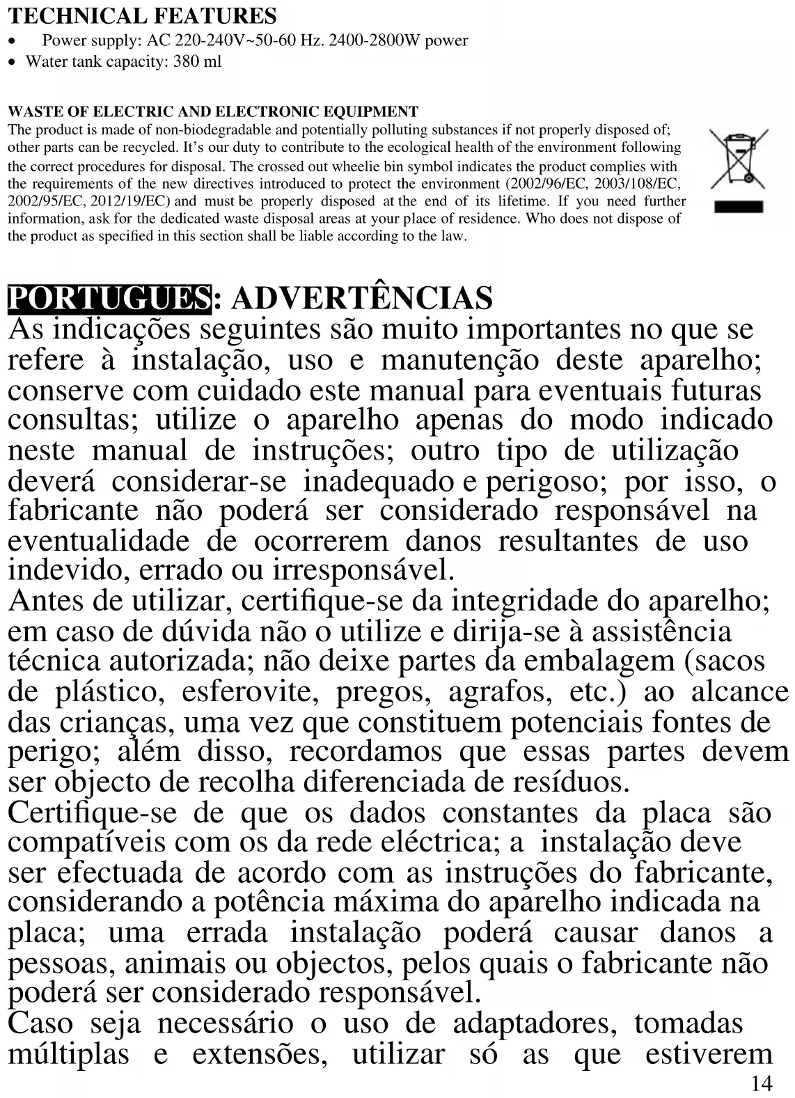 - Prancha inox com furos para saída do vapor RESÍDUOS DE APARELHIOS ELÉCTRICOS E ELÉCTRÓNICOS O aparelho é composto de algumas partes não biodegradáveis e de substâncias potencialmente tóxicas para o ambiente, se não forem correctamente eliminadas; outras partes podem ser recicladas. É dever de todos contribuir para a saúde ecológica do ambiente. Observando os correctos procedimentos de eliminação. O símbolo mostrado ao lado indica que o aparelho responde aos requisitos exigidos pelas novas directivas introduzidas pela tutela do ambiente (2002/96/EC, 2003/108/EC, 2002/95/EC, 2012/19/EC) e que deve ser eliminado correctamente no final do seu período de vida. Peça informações na câmara municipal da sua área de residência, se precisar de saber a localização dos centros de recolha deste tipo de resíduos. Quem não eliminar o aparelho do modo indicado neste parágrafo responde segundo as leis em vigor.