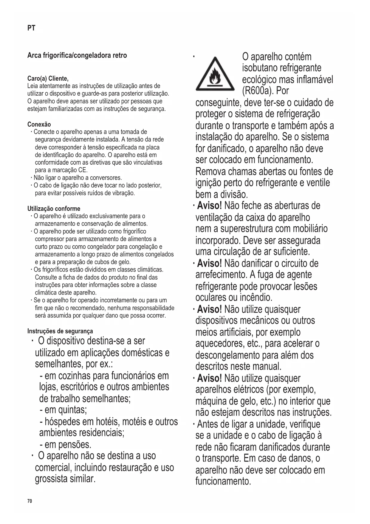 O aparelho contém isobutano refrigerante ecológico mas inamável (R600a). Por conseguinte, deve ter-se o cuidado de proteger o sistema de refrigeração durante o transporte e também após a instalação do aparelho. Se o sistema for danicado, o aparelho não deve ser colocado em funcionamento. Remova chamas abertas ou fontes de ignição perto do refrigerante e ventile bem a divisão. ∙ Aviso! Não feche as aberturas de ventilação da caixa do aparelho nem a superestrutura com mobiliário incorporado. Deve ser assegurada uma circulação de ar suciente. ∙ Aviso! Não danicar o circuito de arrefecimento. A fuga de agente refrigerante pode provocar lesões oculares ou incêndio. ∙ Aviso! Não utilize quaisquer dispositivos mecânicos ou outros meios articiais, por exemplo aquecedores, etc., para acelerar o descongelamento para além dos descritos neste manual. ∙ Aviso! Não utilize quaisquer aparelhos elétricos (por exemplo, máquina de gelo, etc.) no interior que não estejam descritos nas instruções. ∙ Antes de ligar a unidade, verique se a unidade e o cabo de ligação à rede não caram danicados durante o transporte. Em caso de danos, o aparelho não deve ser colocado em funcionamento.71 142 x 208 mm ∙ Ao instalar o aparelho, certique-se de que o cabo de ligação à rede não ca trilhado nem danicado. ∙ As tomadas múltiplas portáteis ou unidades de alimentação não devem ser colocadas na parte de trás do aparelho. ∙ Não armazene neste aparelho substâncias explosivas, tais como contentores de aerossóis com gás propulsor inamável. ∙ Ao vender, entregar ou enviar para reciclagem, o ciclopentano (C