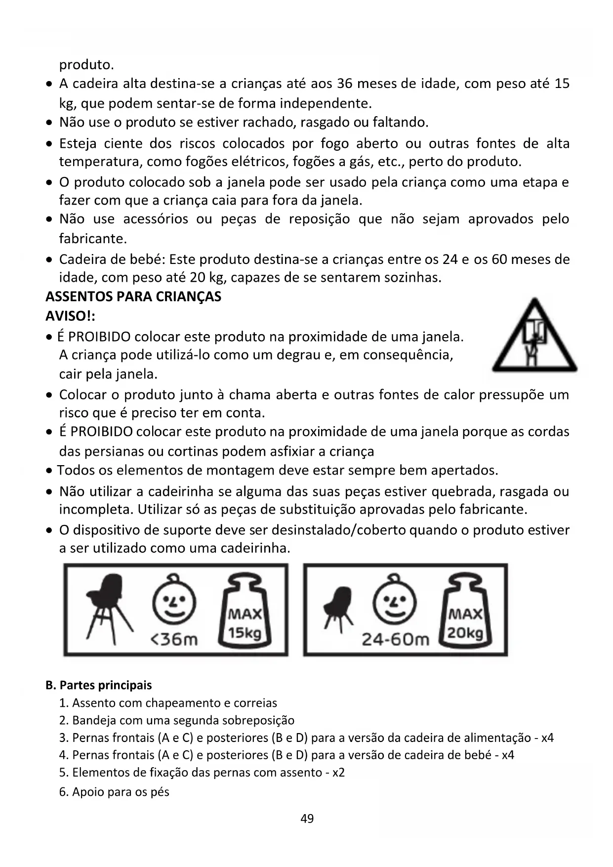 - Cadeira de bebé: Este produto destina-se a crianças entre os 24 e os 60 meses de idade, com peso até 20 kg, capazes de se sentarem sozinhas.