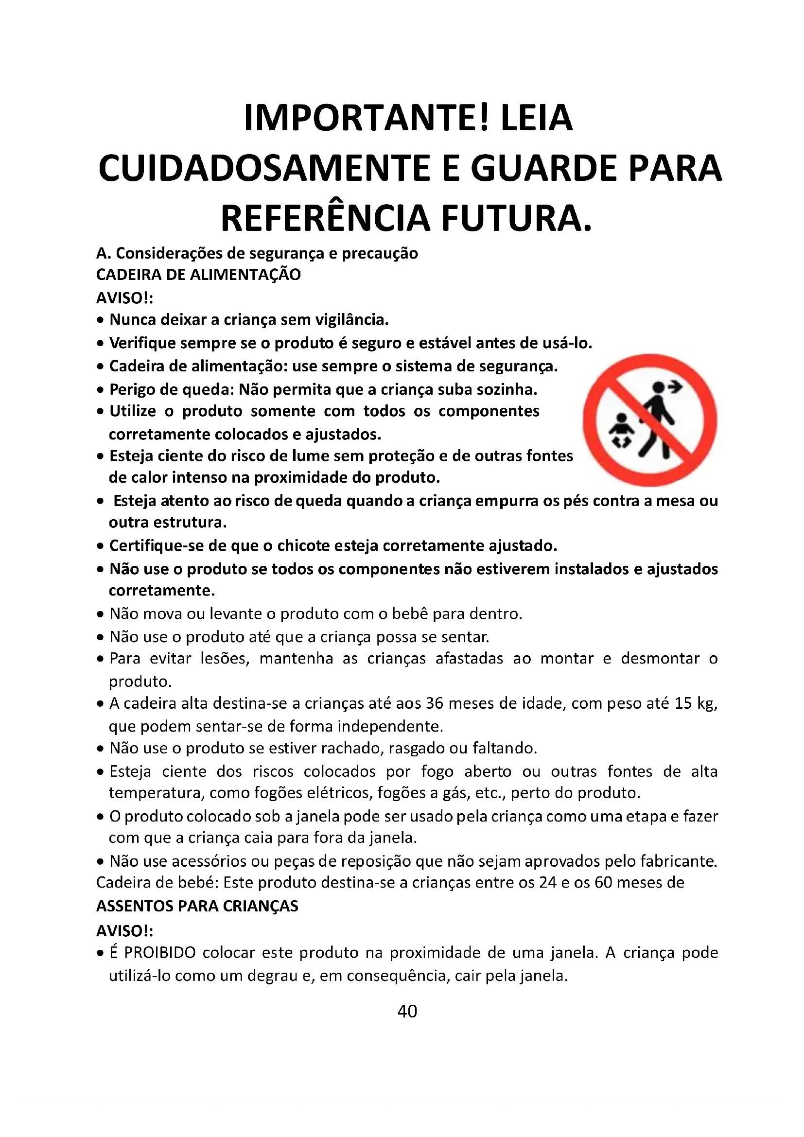 - É PROIBIDO colocar este produto na proximidade de uma janela. A criança pode utilizá-lo como um degrau e, em consequência, cair pela janela.41