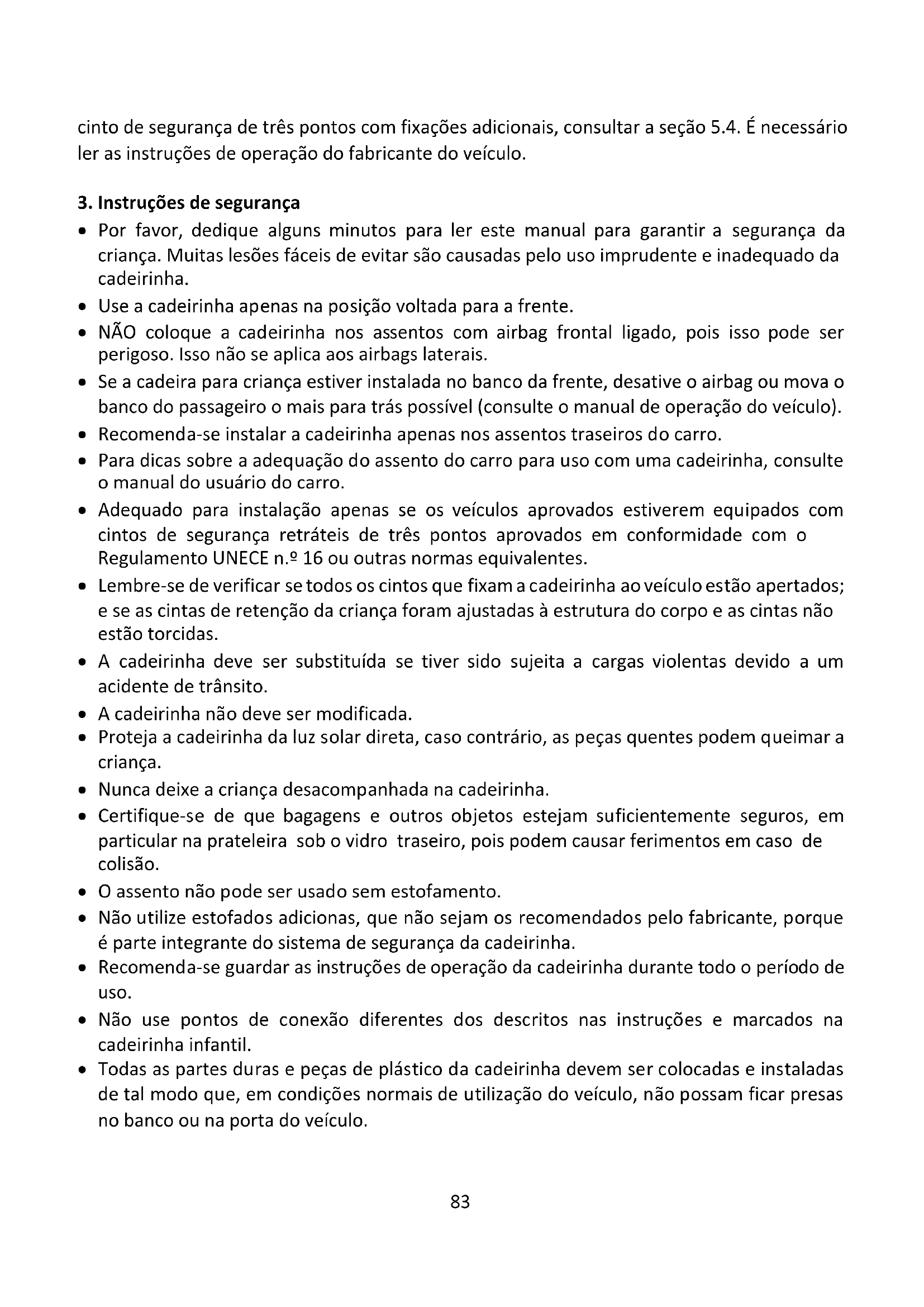 - Todas as partes duras e peças de plástico da cadeirinha devem ser colocadas e instaladas de tal modo que, em condições normais de utilização do veículo, não possam ficar presas no banco ou na porta do veículo.84