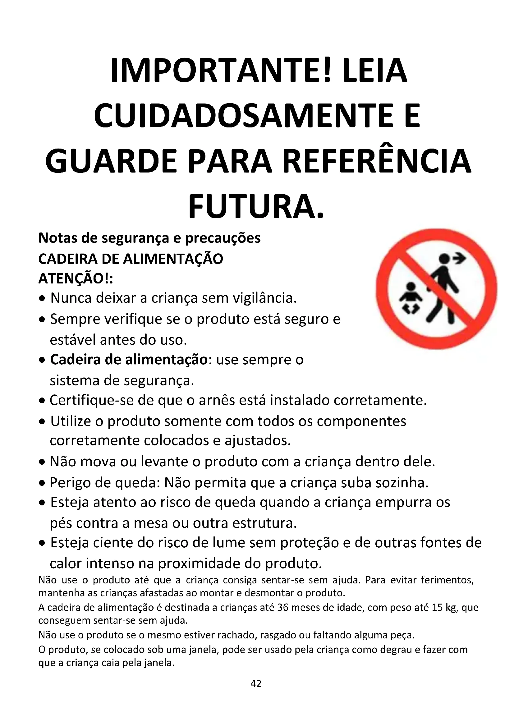 - Esteja ciente do risco de lume sem proteção e de outras fontes de calor intenso na proximidade do produto. Não use o produto até que a criança consiga sentar-se sem ajuda. Para evitar ferimentos, mantenha as crianças afastadas ao montar e desmontar o produto. A cadeira de alimentação é destinada a crianças até 36 meses de idade, com peso até 15 kg, que conseguem sentar-se sem ajuda. Não use o produto se o mesmo estiver rachado, rasgado ou faltando alguma peça. O produto, se colocado sob uma janela, pode ser usado pela criança como degrau e fazer com que a criança caia pela janela.43 Não use quaisquer acessórios ou peças sobressalentes que não sejam aprovados pelo fabricante.
