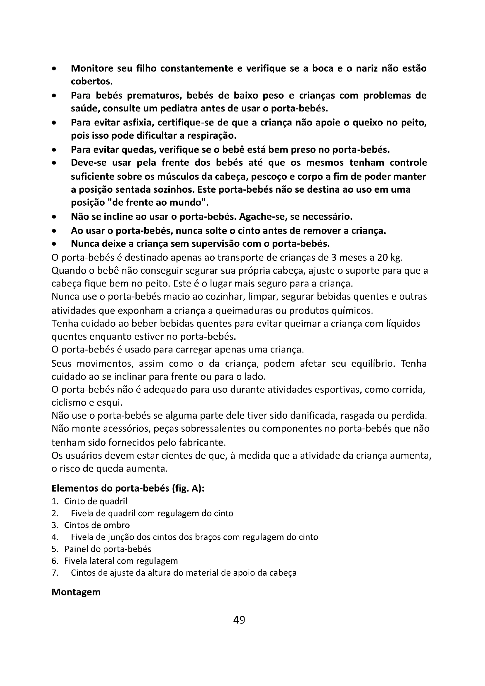 - Nunca deixe a criança sem supervisão com o porta-bebés. O porta-bebés é destinado apenas ao transporte de crianças de 3 meses a 20 kg. Quando o bebê não conseguir segurar sua própria cabeça, ajuste o suporte para que a cabeça fique bem no peito. Este é o lugar mais seguro para a criança. Nunca use o porta-bebés macio ao cozinhar, limpar, segurar bebidas quentes e outras atividades que exponham a criança a queimaduras ou produtos químicos. Tenha cuidado ao beber bebidas quentes para evitar queimar a criança com líquidos quentes enquanto estiver no porta-bebés. O porta-bebés é usado para carregar apenas uma criança. Seus movimentos, assim como o da criança, podem afetar seu equilíbrio. Tenha cuidado ao se inclinar para frente ou para o lado. O porta-bebés não é adequado para uso durante atividades esportivas, como corrida, ciclismo e esqui. Não use o porta-bebés se alguma parte dele tiver sido danificada, rasgada ou perdida. Não monte acessórios, peças sobressalentes ou componentes no porta-bebés que não tenham sido fornecidos pelo fabricante. Os usuários devem estar cientes de que, à medida que a atividade da criança aumenta, o risco de queda aumenta. Elementos do porta-bebés (fig. A):