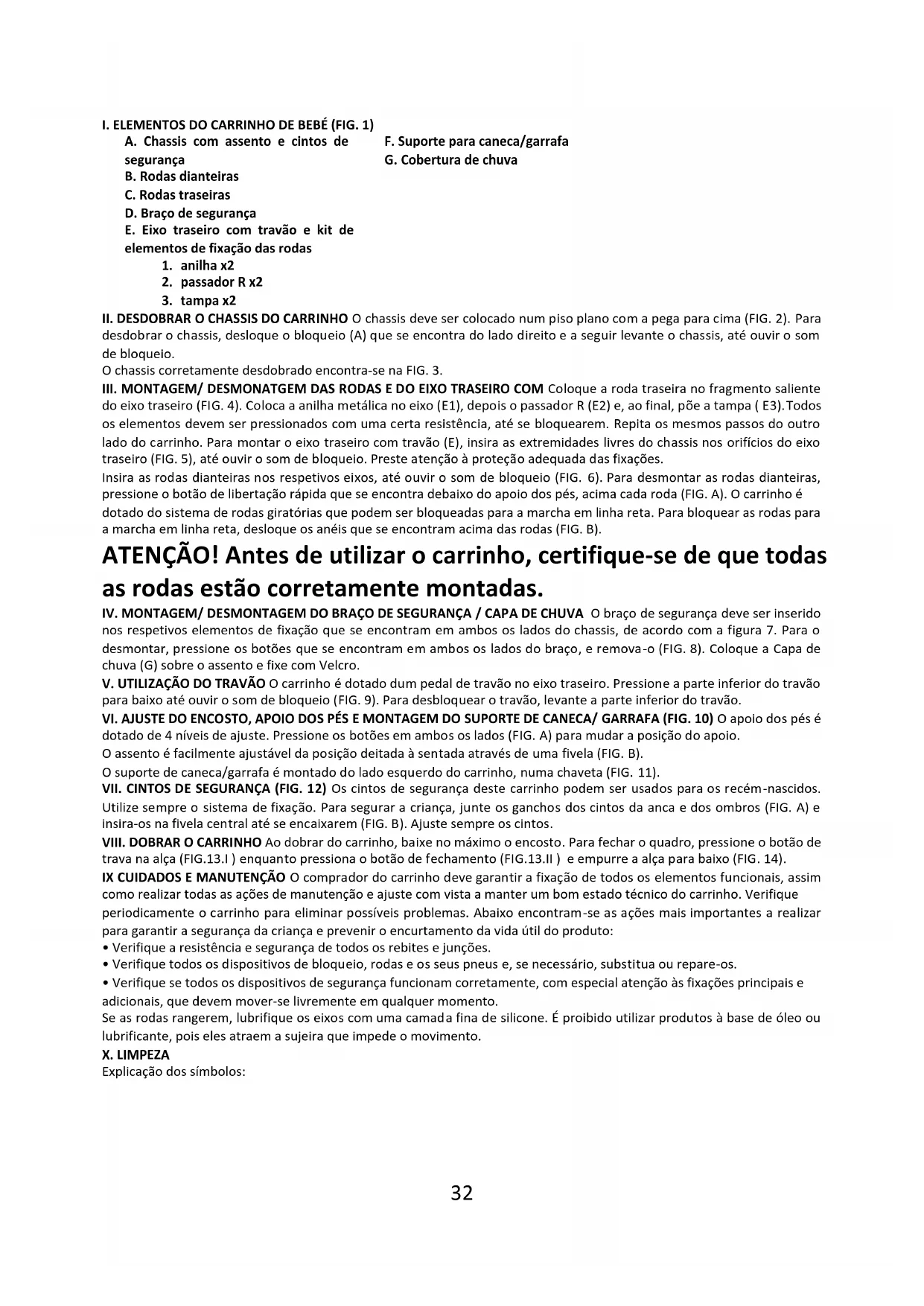 trava na alça (FIG.13.I ) enquanto pressiona o botão de fechamento (FIG.13.II ) e empurre a alça para baixo (FIG. 14). IX CUIDADOS E MANUTENÇÃO O comprador do carrinho deve garantir a fixação de todos os elementos funcionais, assim como realizar todas as ações de manutenção e ajuste com vista a manter um bom estado técnico do carrinho. Verifique periodicamente o carrinho para eliminar possíveis problemas. Abaixo encontram-se as ações mais importantes a realizar para garantir a segurança da criança e prevenir o encurtamento da vida útil do produto: