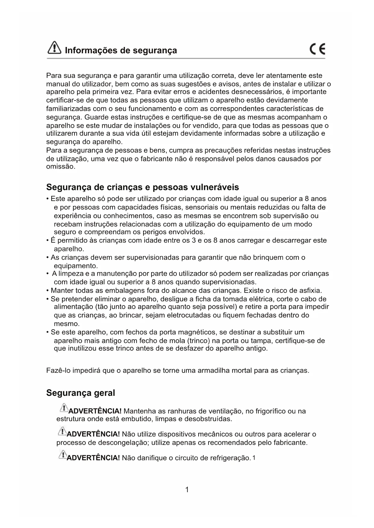 Para sua segurança e para garantir uma utilização correta, deve ler atentamente este manual do utilizador, bem como as suas sugestões e avisos, antes de instalar e utilizar o aparelho pela primeira vez. Para evitar erros e acidentes desnecessários, é importante certificar-se de que todas as pessoas que utilizam o aparelho estão devidamente familiarizadas com o seu funcionamento e com as correspondentes características de segurança. Guarde estas instruções e certifique-se de que as mesmas acompanham o aparelho se este mudar de instalações ou for vendido, para que todas as pessoas que o utilizarem durante a sua vida útil estejam devidamente informadas sobre a utilização e segurança do aparelho. Para a segurança de pessoas e bens, cumpra as precauções referidas nestas instruções de utilização, uma vez que o fabricante não é responsável pelos danos causados por omissão. Segurança de crianças e pessoas vulneráveis