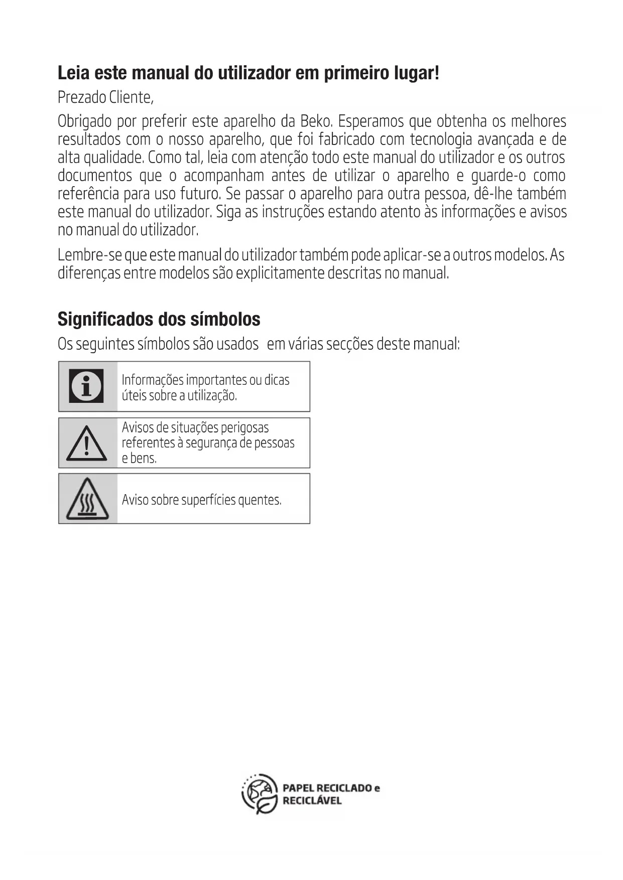 O custo da reparação será pago pelo utilizador nos seguintes casos: Aparelhos utilizados para uso profissional ou não exclusivamente doméstico. Os equipamentos desmontados ou manuseados por outras pessoas que não os serviços técnicos expressamente autorizados. Instalações, transporte, substituição de equipamento, colocação em funcionamento, alteração do sentido das portas. Intervenções de manutenção ou informações sobre a utilização dos aparelhos. Alteração de injetores em aparelhos a gás. As avarias causadas pela falta de manutenção ou limpeza, ou aquelas causadas por um uso inadequado, sobrecarga, abandono ou de uma forma a não respeitar as instruções de uso ou instalação dos aparelhos. As avarias provocadas por causas acidentais, sinistros de força maior ou resultantes de instalação inadequada e em geral, avarias por razões não relacionadas com o produto. As avarias causadas por ligações que podem apresentar flutuações, irregularidades ou falta de uniformidade no fornecimento, por exemplo: abastecimento de água impulsionado por grupos de pressão, energia solar, energia eólica, geradores de energia elétrica ou outro tipo de fornecimento não-padrão. A substituição de materiais quebrados ou danificados por desgaste ou uso não normal do aparelho, ou consumíveis tais como: juntas, plásticos, borracha, correias, vidros, pincéis, lâmpadas, asas, puxadores, tampas de queimadores, filtros, grelhas, ânodos de sacrifício (magnésio ou similares) de aquecedores ou caldeiras, etc. Os aparelhos que apresentem oxidação, ou danos por corrosão nos esmaltes ou na pintura, que possam ter sido causados por efeitos químicos ou eletroquímicos da água ou de qualquer outra substância, ou acelerados por circunstâncias ambientais ou climáticas desfavoráveis. Defeitos estéticos em serigrafia ou pintura. Os danos causados por transporte ou manuseio, colisões, etc. Os aparelhos devem ser instalados de forma acessível em caso de reparação, devendo o utilizador assumir os custos necessários para aceder ao aparelho para reparação e substituição. A presente garantia não afeta os direitos de que o consumidor dispõe conforme o previsto na legislação em vigor. O Serviço Oficial de Assistência Técnica resolverá qualquer incidente que o seu aparelho possa necessitar, desde que o aparelho seja instalado de forma acessível. As marcas BEKO e GRUNDIG são distribuídas por Beko Home Appliances Portugal, Unipessoal, Lda DADOS DO APARELHO (a ser preenchido pelo Distribuidor): Detentor: Carimbo do estabelecimento: Modelo: Nº série: Estabelecimento: Data de compra: O fiador e o importador do seu eletrodoméstico é: Beko Home Appliances Portugal, Unipessoal, Lda; Edificio Amoreiras Square; Rua Carlos Alberto da Mota Pinto, nº 17, 3ºA, Amoreiras 1070-313, Lisboa, Portugal. Conheça-nos melhor na nossa página: www.beko.com Conserve este documento, é importante para si. (*) São considerados eletrodomésticos da linha branca, os aparelhos de cozinha, limpeza, refrigeração e ventilação de tamanho grande e pequenos eletrodomésticos, os de higiene pessoal, manutenção do lar e preparação de alimentos.Lees eerst deze gebruikershandleiding! Zeer gewaardeerde klant, Bedankt voor uw voorkeur voor dit Beko-toestel. Wij hopen dat u de beste resultaten haalt uit uw toestel dat met hoge kwaliteit en de modernste technologie is geproduceerd. Lees daarom deze gehele gebruikershandleiding en alle andere bijgeleverde documenten zorgvuldig door voordat u het apparaat gaat gebruiken en bewaar deze ter referentie in de toekomst. Als u het product aan iemand anders geeft, overhandig dan ook de gebruikershandleiding. Volg de instructies op door op alle informatie en waarschuwingen te letten in de gebruikershandleiding. Vergeet niet dat deze gebruikershandleiding ook van toepassing kan zijn op andere modellen. Verschillen tussen de modellen worden expliciet beschreven in de handleiding. Betekenis van de symbolen De volgende symbolen worden gebruikt in de verschillende delen van deze handleiding: