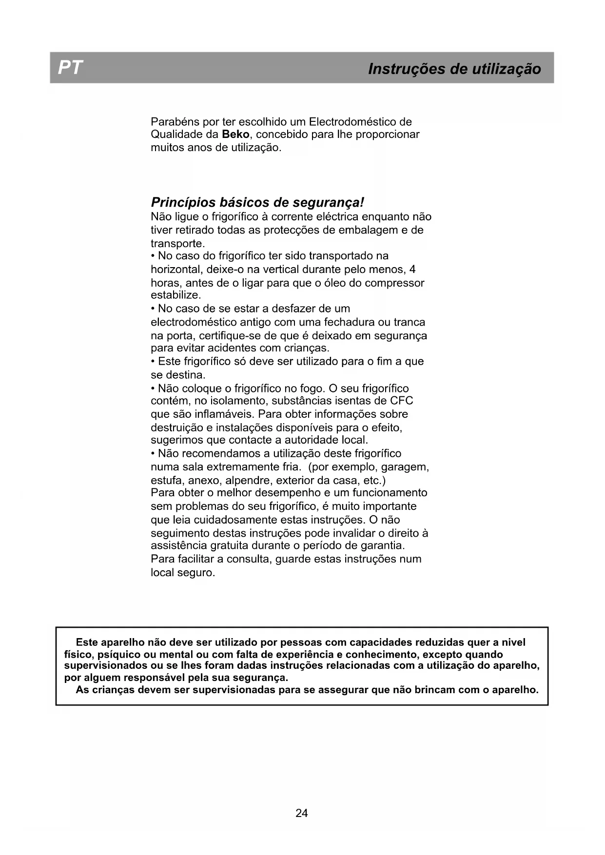 Este aparelho não deve ser utilizado por pessoas com capacidades reduzidas quer a nivel físico, psíquico ou mental ou com falta de experiência e conhecimento, excepto quando supervisionados ou se lhes foram dadas instruções relacionadas com a utilização do aparelho, por alguem responsável pela sua segurança. As crianças devem ser supervisionadas para se assegurar que não brincam com o aparelho.Requisitos eléctricos Antes de inserir a ficha na tomada de parede, certifique-se de que a voltagem e a frequência apresentadas na placa de características colocada dentro do frigorífico, correspondem à corrente eléctrica que vai utilizar. Recomendamos que este congelador seja ligado à corrente através de uma tomada com interruptor e fusível e que seja de fácil acesso. Aviso! Este frigorífico deve ser ligado a uma tomada com terra. As reparações no equipamento eléctrico só devem ser efectuadas por um técnico qualificado. As reparações incorrectas efectuadas por uma pessoa não qualificada acarretam riscos que podem ter consequências graves para o utilizador do frigorífico. ATENÇÃO! Este frigorífico funciona com R600a, que é um gás não prejudicial para o ambiente mas inflamável. Durante o transporte e instalação do produto, devem ser tomadas as devidas precauções para não danificar o sistema de arrefecimento. Se o sistema de arrefecimento se danificar, e se ocorrer uma fuga de gás, mantenha o produto afastado de qualquer chama e ventile o espaço durante algum tempo. AVISO - Não utilize dispositivos mecânicos ou outros para acelerar o processo de descongelação, diferentes dos recomendados pelo fabricante. AVISO - Não danifique o circuito de refrigeração. AVISO - Não utilize aparelhos eléctricos dentro dos compartimentos de armazenamento de alimentos do frigorífico, excepto os que forem recomendados pelo fabricante. AVISO - Se o cabo fornecido estiver danificado, deve ser substituído pelo fabricante, pelo seu agente de assistência ou pessoas igualmente qualificadas para evitar perigo. Instruções para transporte
