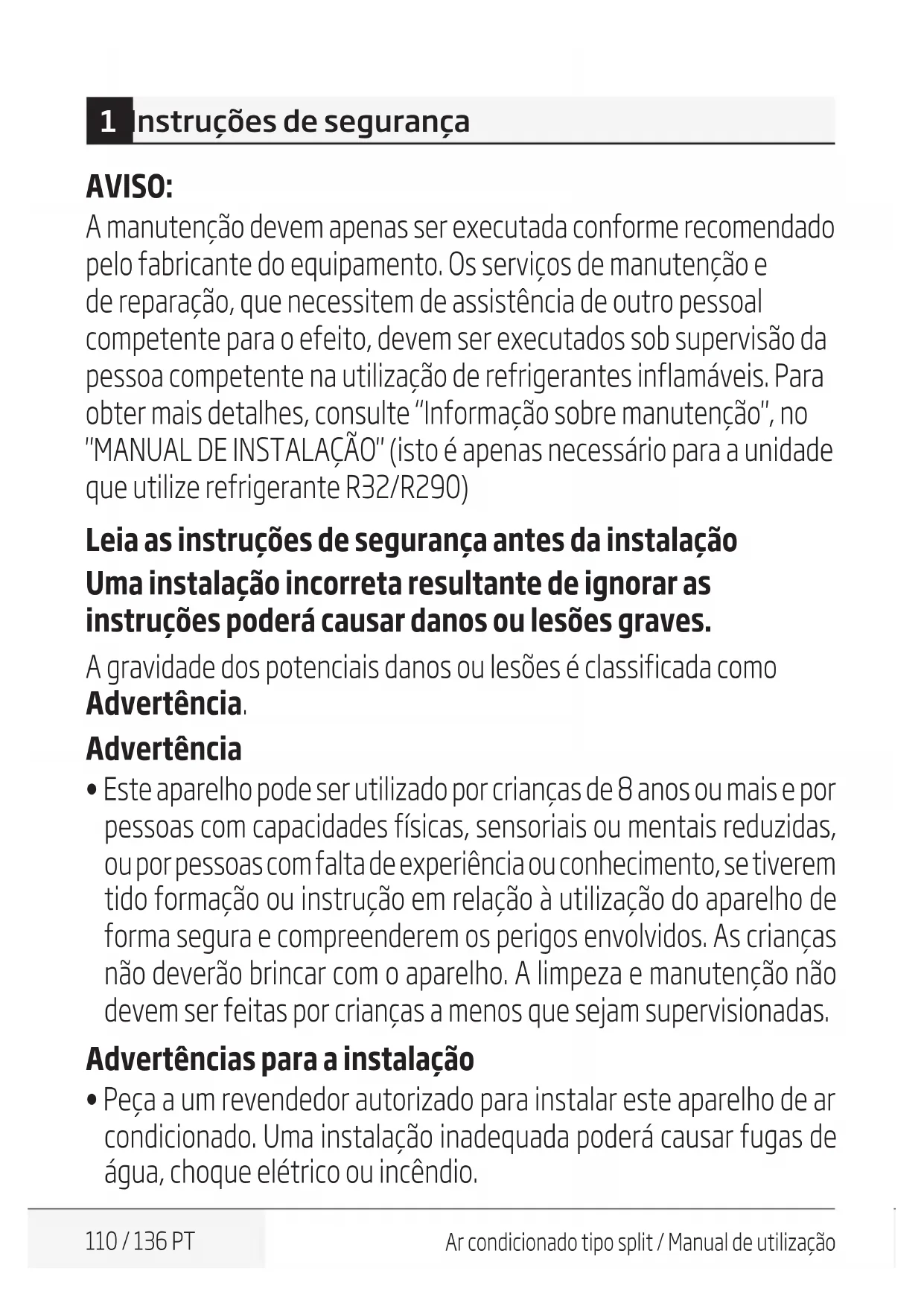 - Utilize apenas o cabo de alimentação especificado. No caso de o cabo de alimentação estar danificado, este deverá ser substituído pelo fabricante ou por um fornecedor de serviços certificado. 1 Instruções de segurança112 / 136 PT Ar condicionado tipo split / Manual de utilização