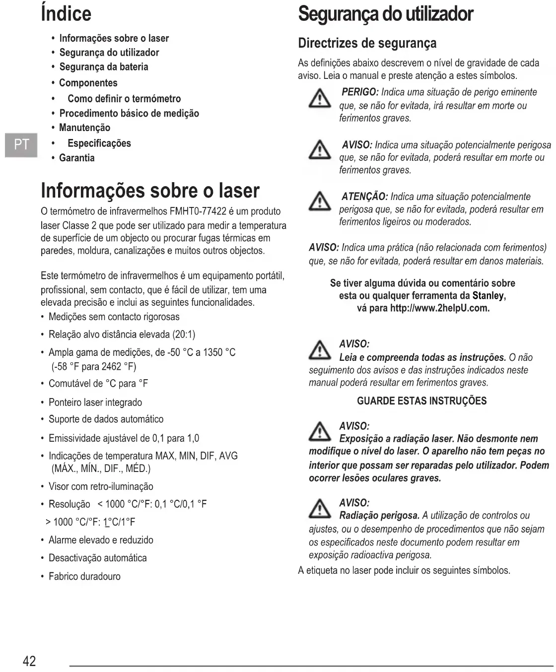 Esta garantia não abrange defeitos causados por danos acidentais, desgaste, utilização que não esteja de acordo com as instruções do fabricante ou reparações ou alterações deste produto não autorizadas pela Stanley. A reparação ou substituição cobertas por esta garantia não afectam a data de validade da garantia. Na medida do autorizado por qualquer legislação nacional aplicável, a Stanley não será responsável ao abrigo desta garantia por perdas indirectas ou consequenciais que resultem de defeitos neste produto. Esta garantia não pode ser alterada sem a autorização da Stanley. Esta garantia não afecta os direitos estatutários dos compradores consumidores deste produto. Esta garantia deve ser regida e interpretada em conformidade com a legislação do país onde o produto é vendido e a Stanley e o comprador aceitam irrevogavelmente submeter-se à jurisdição exclusiva dos tribunais do respectivo país no que respeita a qualquer reclamação ou questão resultante decorrente ou relacionada com esta garantia. A calibração e os cuidados não são abrangidos pela garantia. NOTA: O cliente é responsável pela utilização e cuidados correctos do instrumento. Além disso, o cliente é totalmente responsável pela vericação periódica da precisão da unidade laser e, por conseguinte, pela calibração do instrumento. Este manual está sujeito a alterações sem aviso prévio.49