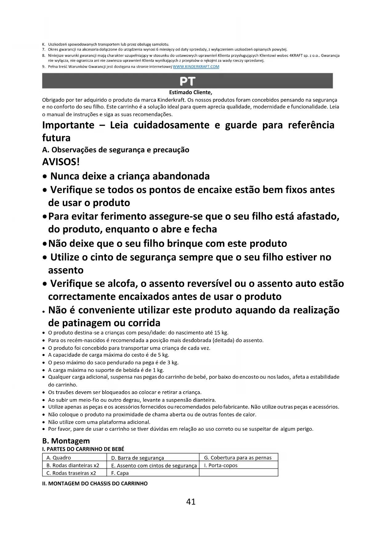 Estimado Cliente, Obrigado por ter adquirido o produto da marca Kinderkraft. Os nossos produtos foram concebidos pensando na segurança e no conforto do seu filho. Este carrinho é a solução ideal para quem aprecia qualidade, modernidade e funcionalidade. Leia o manual de instruções e siga as suas recomendações. Importante – Leia cuidadosamente e guarde para referência futura A. Observações de segurança e precaução AVISOS!