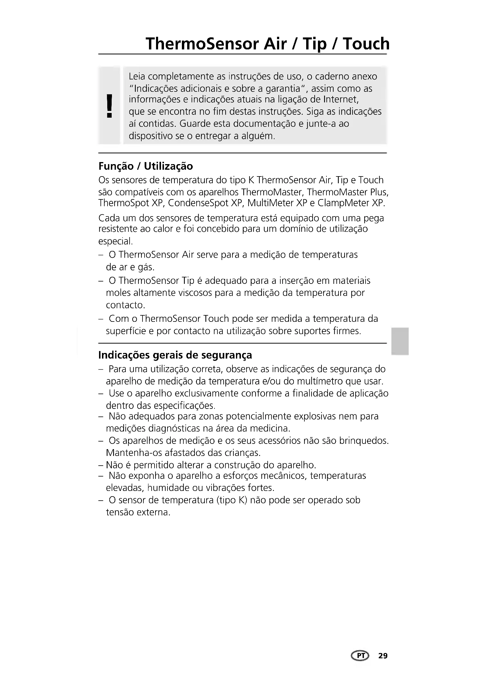 Os sensores de temperatura do tipo K ThermoSensor Air, Tip e Touch são compatíveis com os aparelhos ThermoMaster, ThermoMaster Plus, ThermoSpot XP, CondenseSpot XP, MultiMeter XP e ClampMeter XP. Cada um dos sensores de temperatura está equipado com uma pega resistente ao calor e foi concebido para um domínio de utilização especial. – O ThermoSensor Air serve para a medição de temperaturas de ar e gás. – O ThermoSensor Tip é adequado para a inserção em materiais moles altamente viscosos para a medição da temperatura por contacto. – Com o ThermoSensor Touch pode ser medida a temperatura da superfície e por contacto na utilização sobre suportes rmes. – Para uma utilização correta, observe as indicações de segurança do aparelho de medição da temperatura e/ou do multímetro que usar. – Use o aparelho exclusivamente conforme a nalidade de aplicação dentro das especicações. – Não adequados para zonas potencialmente explosivas nem para medições diagnósticas na área da medicina. – Os aparelhos de medição e os seus acessórios não são brinquedos. Mantenha-os afastados das crianças. – Não é permitido alterar a construção do aparelho. – Não exponha o aparelho a esforços mecânicos, temperaturas elevadas, humidade ou vibrações fortes. – O sensor de temperatura (tipo K) não pode ser operado sob tensão externa. Indicações gerais de segurança Função / Utilização Leia completamente as instruções de uso, o caderno anexo “Indicações adicionais e sobre a garantia“, assim como as informações e indicações atuais na ligação de Internet, que se encontra no fim destas instruções. Siga as indicações aí contidas. Guarde esta documentação e junte-a ao dispositivo se o entregar a alguém.