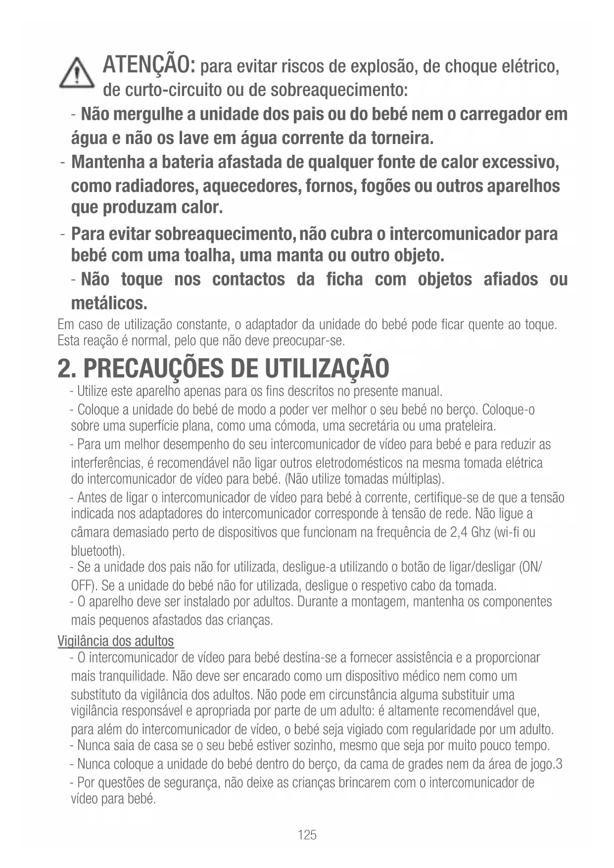 METRO DA CRIANÇA. PT125 ATENÇÃO: para evitar riscos de explosão, de choque elétrico, de curto-circuito ou de sobreaquecimento: - Não mergulhe a unidade dos pais ou do bebé nem o carregador em água e não os lave em água corrente da torneira. - Mantenha a bateria afastada de qualquer fonte de calor excessivo, como radiadores, aquecedores, fornos, fogões ou outros aparelhos que produzam calor. - Para evitar sobreaquecimento, não cubra o intercomunicador para bebé com uma toalha, uma manta ou outro objeto. - Não toque nos contactos da cha com objetos aados ou metálicos. Em caso de utilização constante, o adaptador da unidade do bebé pode car quente ao toque. Esta reação é normal, pelo que não deve preocupar-se.