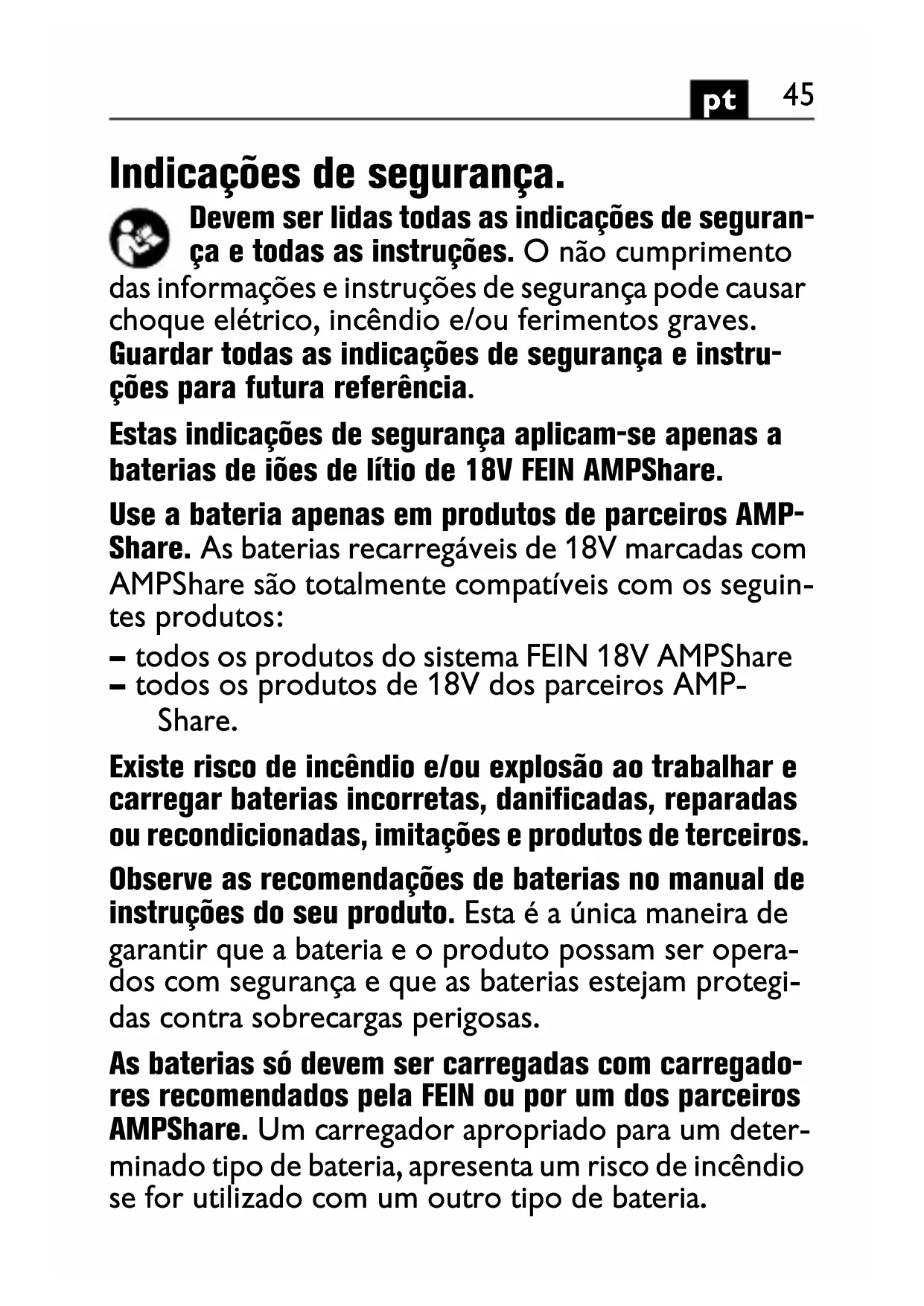 Indicações de segurança. Devem ser lidas todas as indicações de seguran- ça e todas as instruções. O não cumprimento das informações e instruções de segurança pode causar choque elétrico, incêndio e/ou ferimentos graves. Guardar todas as indicações de segurança e instru- ções para futura referência. Estas indicações de segurança aplicam-se apenas a baterias de iões de lítio de 18V FEIN AMPShare. Use a bateria apenas em produtos de parceiros AMP- Share. As baterias recarregáveis de 18V marcadas com AMPShare são totalmente compatíveis com os seguin- tes produtos: – todos os produtos do sistema FEIN 18V AMPShare – todos os produtos de 18V dos parceiros AMP- Share. Existe risco de incêndio e/ou explosão ao trabalhar e carregar baterias incorretas, danificadas, reparadas ou recondicionadas, imitações e produtos de terceiros. Observe as recomendações de baterias no manual de instruções do seu produto. Esta é a única maneira de garantir que a bateria e o produto possam ser opera- dos com segurança e que as baterias estejam protegi- das contra sobrecargas perigosas. As baterias só devem ser carregadas com carregado- res recomendados pela FEIN ou por um dos parceiros AMPShare. Um carregador apropriado para um deter- minado tipo de bateria, apresenta um risco de incêndio se for utilizado com um outro tipo de bateria.46
