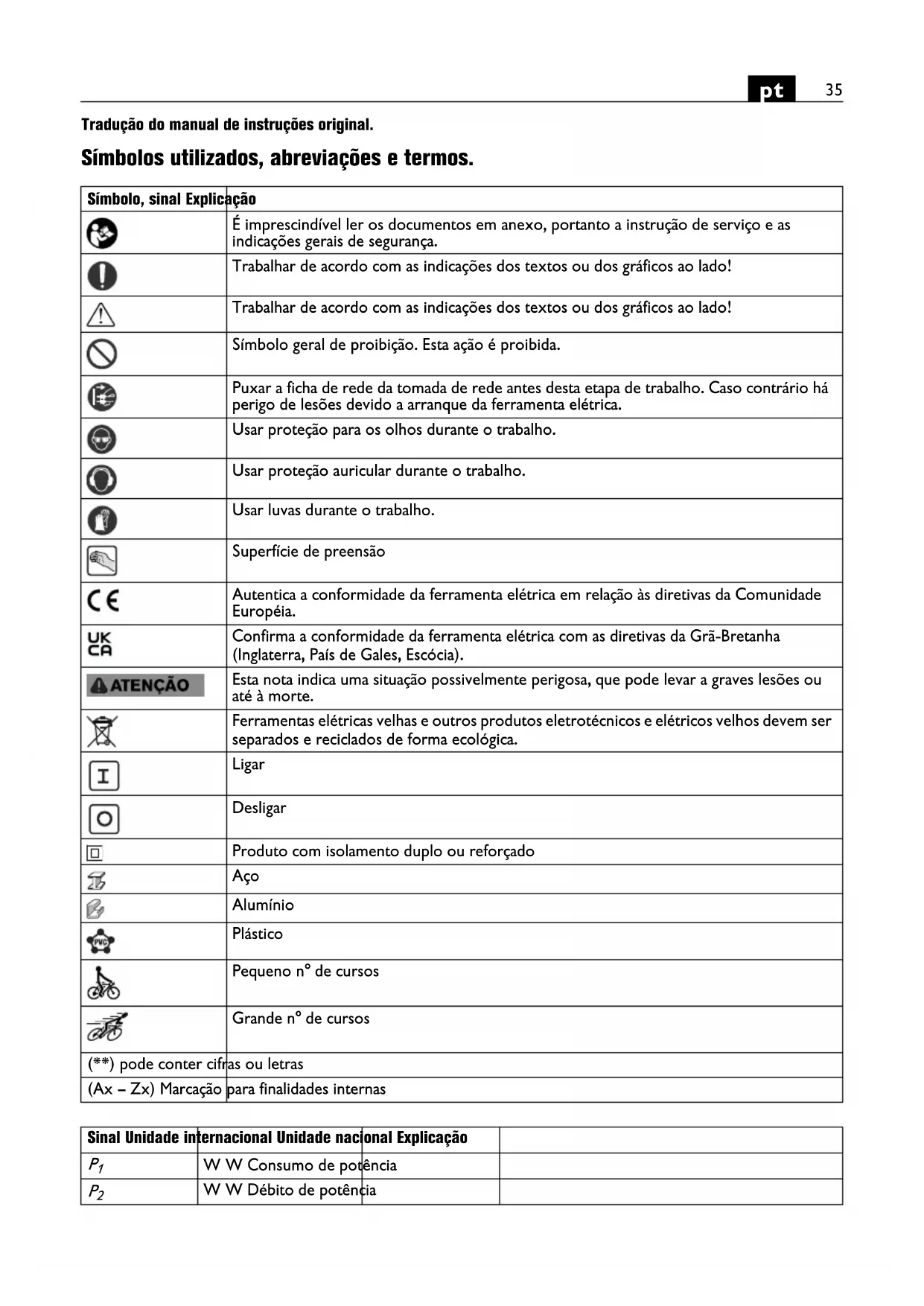 Tradução do manual de instruções original. Símbolos utilizados, abreviações e termos. Símbolo, sinal Explicação É imprescindível ler os documentos em anexo, portanto a instrução de serviço e as indicações gerais de segurança. Trabalhar de acordo com as indicações dos textos ou dos gráficos ao lado! Trabalhar de acordo com as indicações dos textos ou dos gráficos ao lado! Símbolo geral de proibição. Esta ação é proibida. Puxar a ficha de rede da tomada de rede antes desta etapa de trabalho. Caso contrário há perigo de lesões devido a arranque da ferramenta elétrica. Usar proteção para os olhos durante o trabalho. Usar proteção auricular durante o trabalho. Usar luvas durante o trabalho. Superfície de preensão Autentica a conformidade da ferramenta elétrica em relação às diretivas da Comunidade Européia. Confirma a conformidade da ferramenta elétrica com as diretivas da Grã-Bretanha (Inglaterra, País de Gales, Escócia). Esta nota indica uma situação possivelmente perigosa, que pode levar a graves lesões ou até à morte. Ferramentas elétricas velhas e outros produtos eletrotécnicos e elétricos velhos devem ser separados e reciclados de forma ecológica. Ligar Desligar Produto com isolamento duplo ou reforçado Aço Alumínio Plástico Pequeno n° de cursos Grande n° de cursos (**) pode conter cifras ou letras (Ax – Zx) Marcação para finalidades internas Sinal Unidade internacional Unidade nacional Explicação