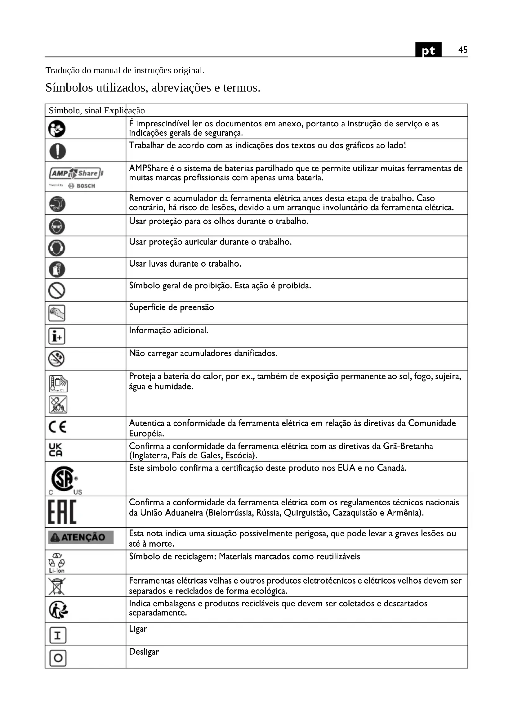 Tradução do manual de instruções original. Símbolos utilizados, abreviações e termos. Símbolo, sinal Explicação É imprescindível ler os documentos em anexo, portanto a instrução de serviço e as indicações gerais de segurança. Trabalhar de acordo com as indicações dos textos ou dos gráficos ao lado! AMPShare é o sistema de baterias partilhado que te permite utilizar muitas ferramentas de muitas marcas profissionais com apenas uma bateria. Remover o acumulador da ferramenta elétrica antes desta etapa de trabalho. Caso contrário, há risco de lesões, devido a um arranque involuntário da ferramenta elétrica. Usar proteção para os olhos durante o trabalho. Usar proteção auricular durante o trabalho. Usar luvas durante o trabalho. Símbolo geral de proibição. Esta ação é proibida. Superfície de preensão Informação adicional. Não carregar acumuladores danificados. Proteja a bateria do calor, por ex., também de exposição permanente ao sol, fogo, sujeira, água e humidade. Autentica a conformidade da ferramenta elétrica em relação às diretivas da Comunidade Européia. Confirma a conformidade da ferramenta elétrica com as diretivas da Grã-Bretanha (Inglaterra, País de Gales, Escócia). Este símbolo confirma a certificação deste produto nos EUA e no Canadá. Confirma a conformidade da ferramenta elétrica com os regulamentos técnicos nacionais da União Aduaneira (Bielorrússia, Rússia, Quirguistão, Cazaquistão e Armênia). Esta nota indica uma situação possivelmente perigosa, que pode levar a graves lesões ou até à morte. Símbolo de reciclagem: Materiais marcados como reutilizáveis Ferramentas elétricas velhas e outros produtos eletrotécnicos e elétricos velhos devem ser separados e reciclados de forma ecológica. Indica embalagens e produtos recicláveis que devem ser coletados e descartados separadamente. Ligar Desligar max.50°C46