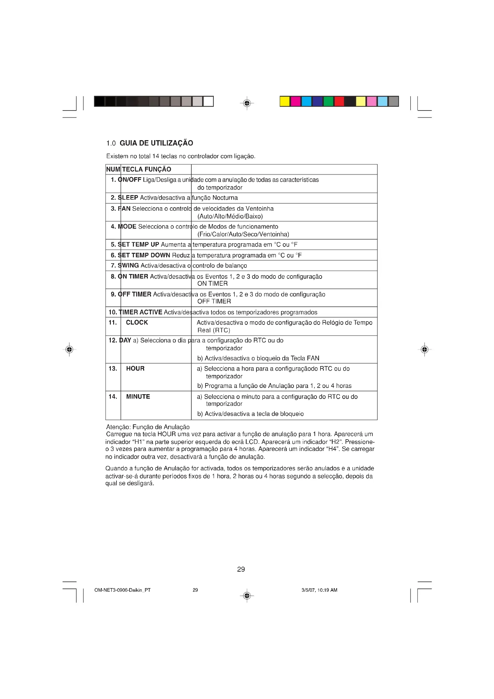 Existem no total 14 teclas no controlador com ligação. Atenção: Função de Anulação Carregue na tecla HOUR uma vez para activar a função de anulação para 1 hora. Aparecerá um indicador “H1” na parte superior esquerda do ecrã LCD. Aparecerá um indicador “H2”. Pressione- o 3 vezes para aumentar a programação para 4 horas. Aparecerá um indicador “H4”. Se carregar no indicador outra vez, desactivará a função de anulação. Quando a função de Anulação for activada, todos os temporizadores serão anulados e a unidade activar-se-á durante períodos fixos de 1 hora, 2 horas ou 4 horas segundo a selecção, depois da qual se desligará. OM-NET3-0906-Daikin_PT 3/5/07, 10:19 AM2930